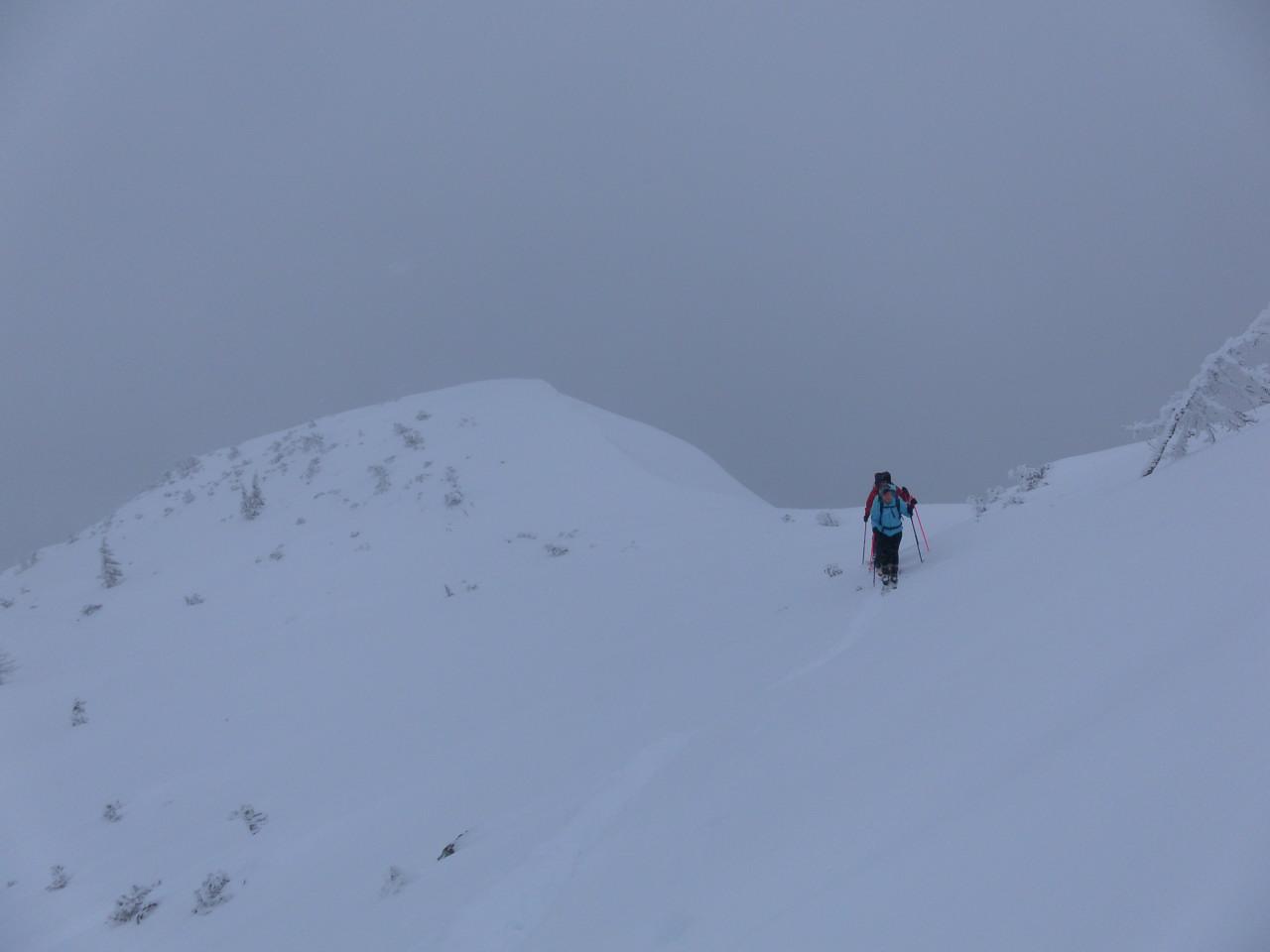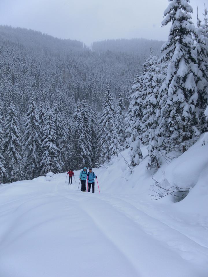 Bei den heutigen Wetterbedingungen im Zauchtal (Nebel und intensitätswechselnder Schneefall) ist eine einfache Tour im Baumbereich gefragt. Anstieg über den Nordrücken der Steinwand zur Eisenhofalm und am Nordkamm zum Hinteren Labeneck, Abfahrt über die Labeneckalm und den Almweg.