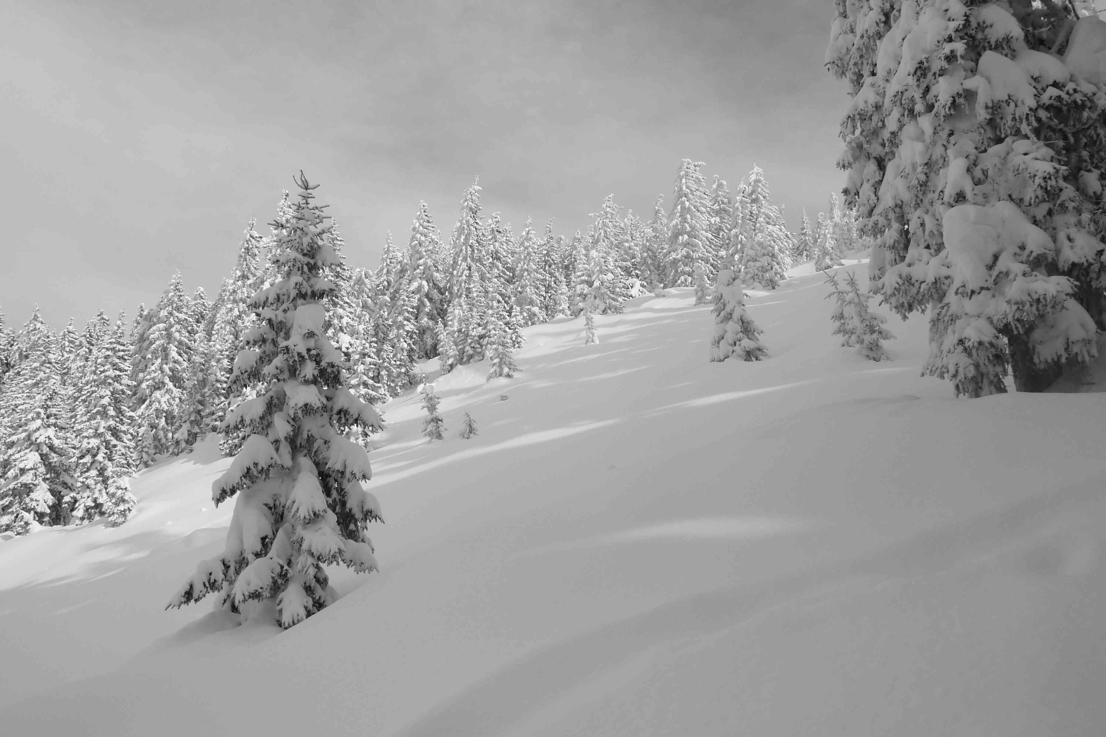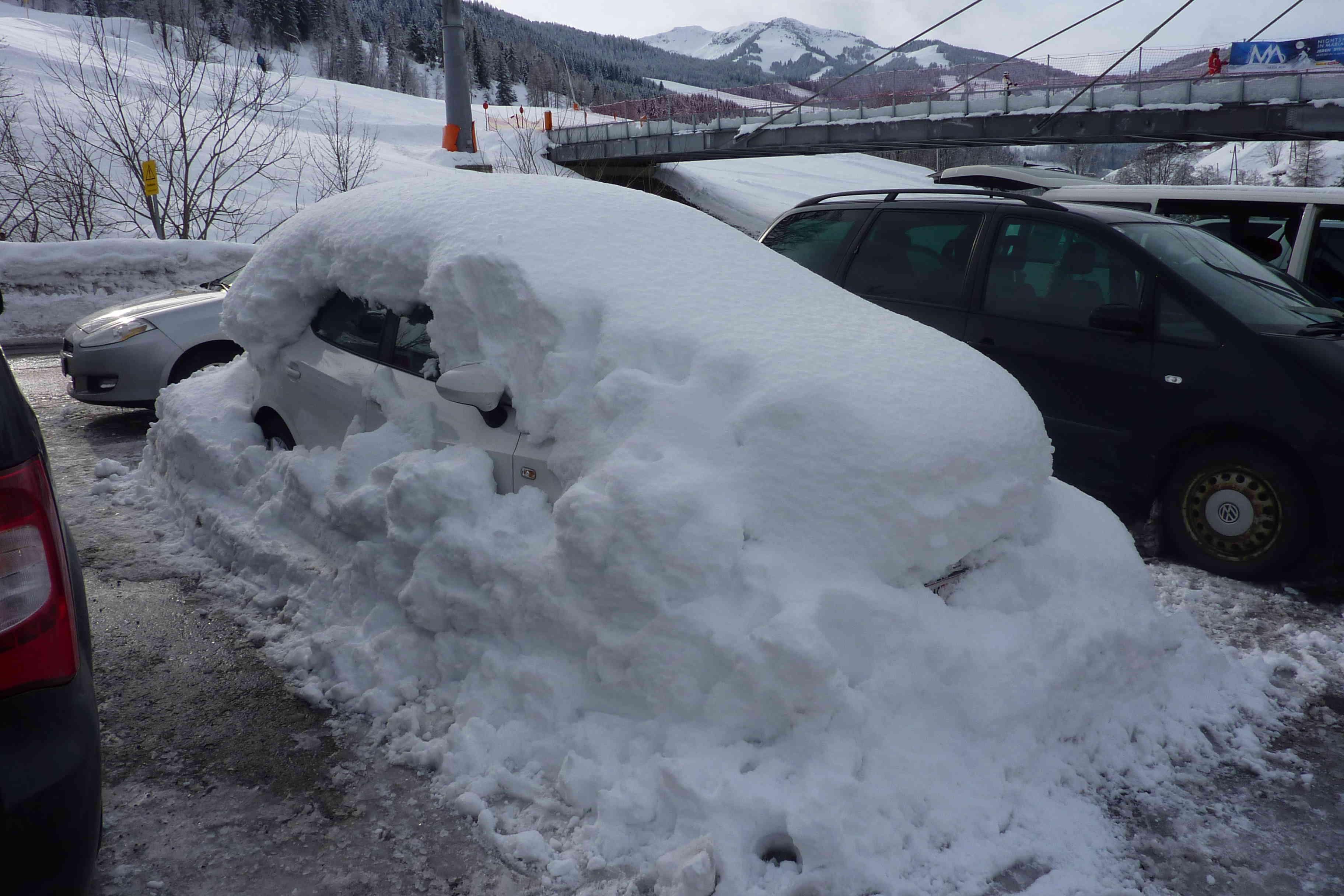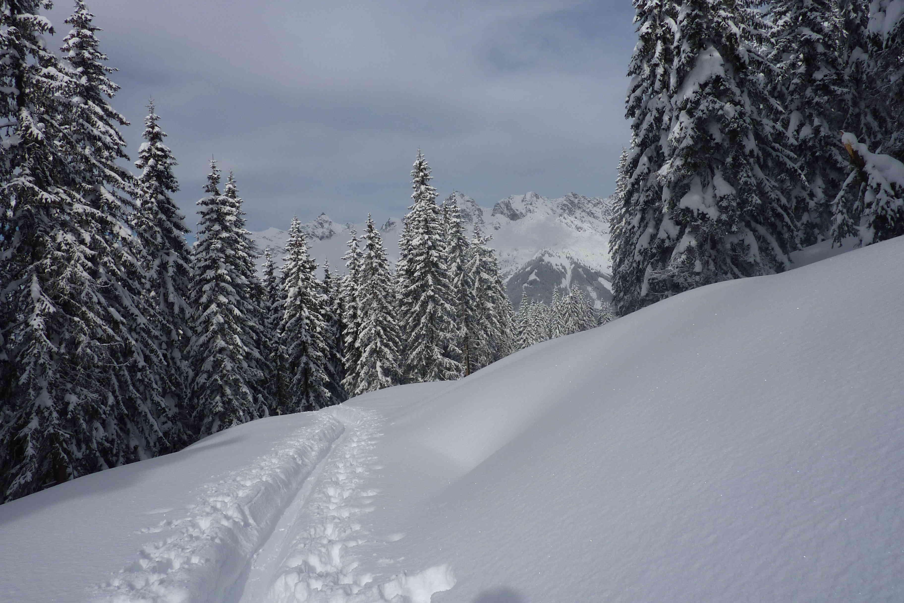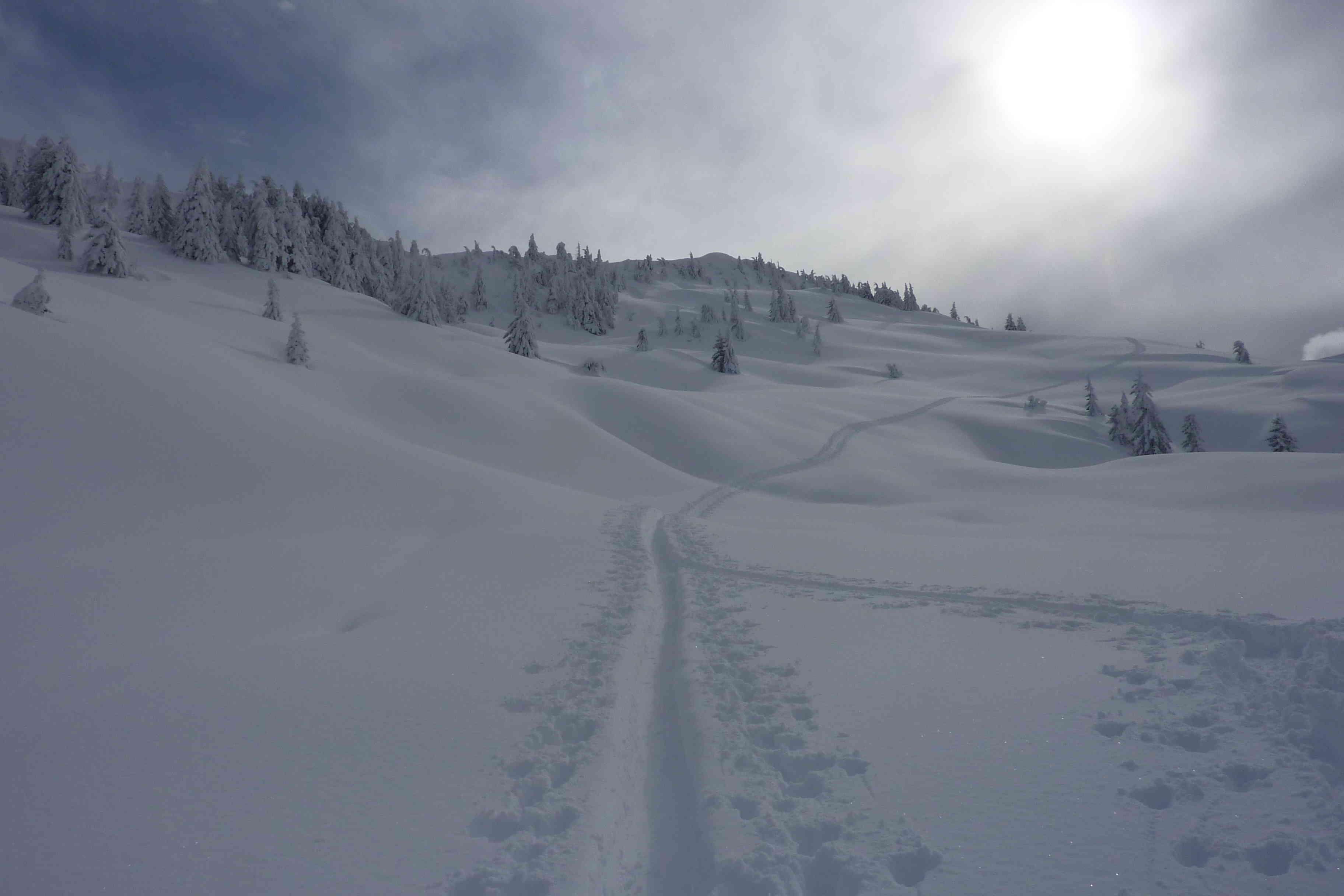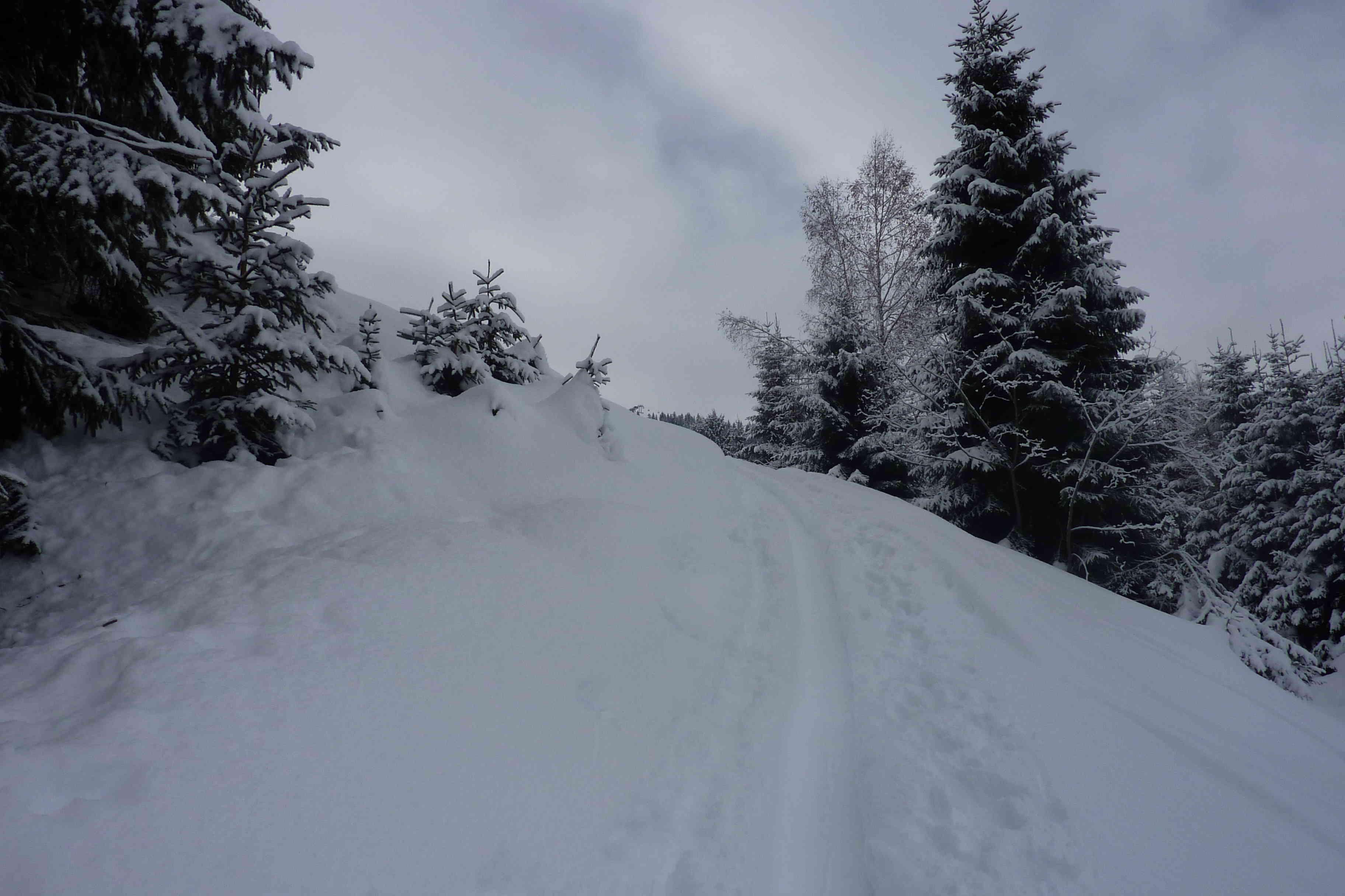 Die Befürchtungen haben sich am Hang oberhalb der Almen in ein breites Smile verwandelt. Nur wenige Spuren und schöner Pulver: mit Abfahrtsvergnügen habe ich heute gar nicht gerechnet. Danach bin ich mir auf der Straße nach den Almen in der tief eingeschnittenen Spur wie ein Bobfahrer vorgekommen.