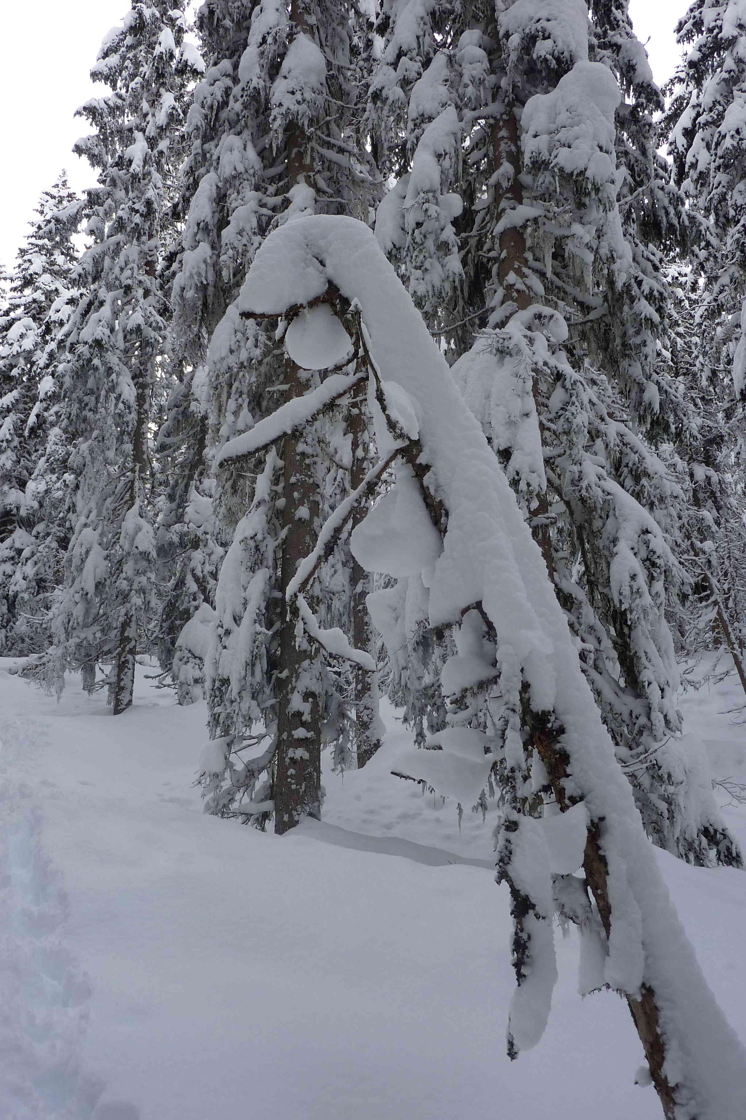 Die Schneemassen beim Aufstieg haben mich schon an einen Abfahrtsk(r)ampf denken lassen. Weil meine Tiefschneekünste nicht so berauschend sind und mein marodes Knie auch nicht allzuviel von dem prachtvollen Weiß mag.