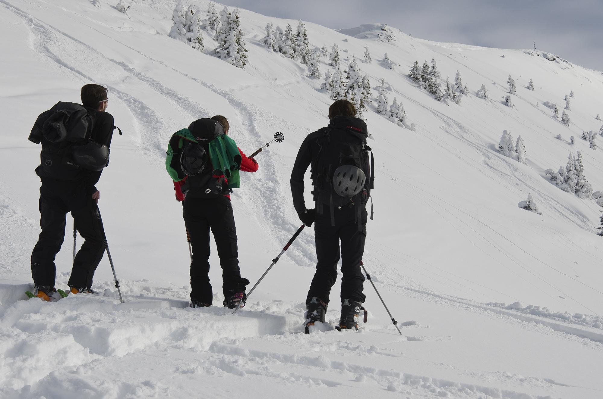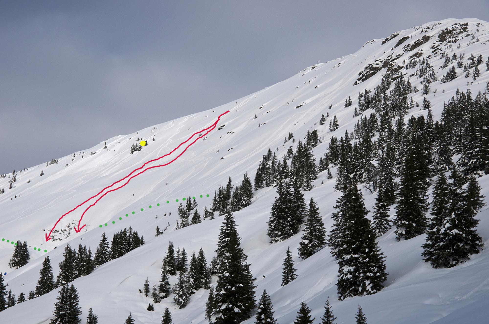 Darüber hinaus sind wir ein großes Risiko eingegangen, weil wir einen steilen Hang mit Tempo befahren haben, dessen unteren Bereich wir von oben nicht einsehen konnten.