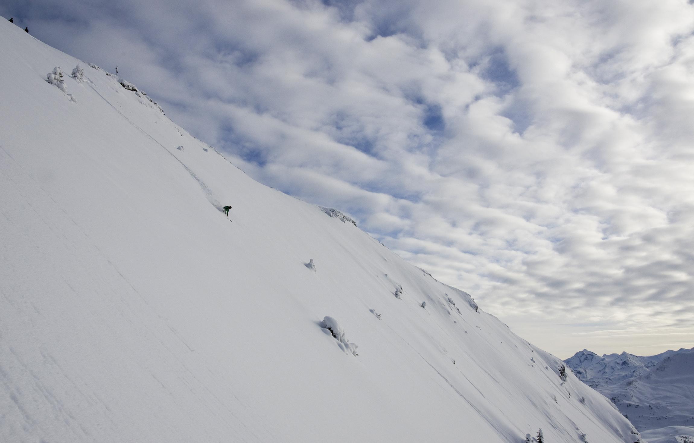 Beim Abfahren des Nächsten von uns löst sich ein kleiner Schneerutsch, der nach unten gleitet und dabei größer wird.