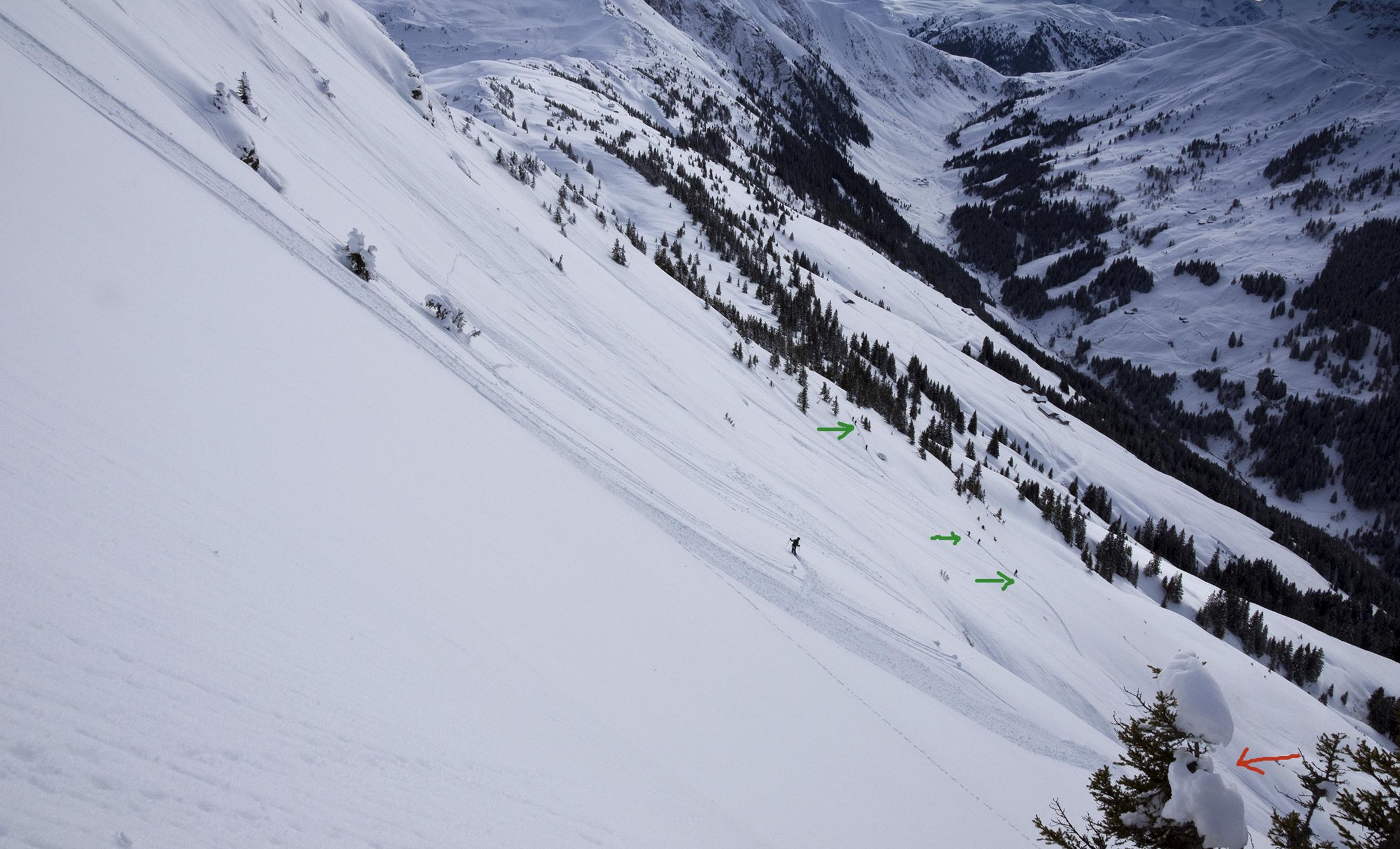 Im unteren Teil ist der Hang gerade von einer Gruppe gequert worden.