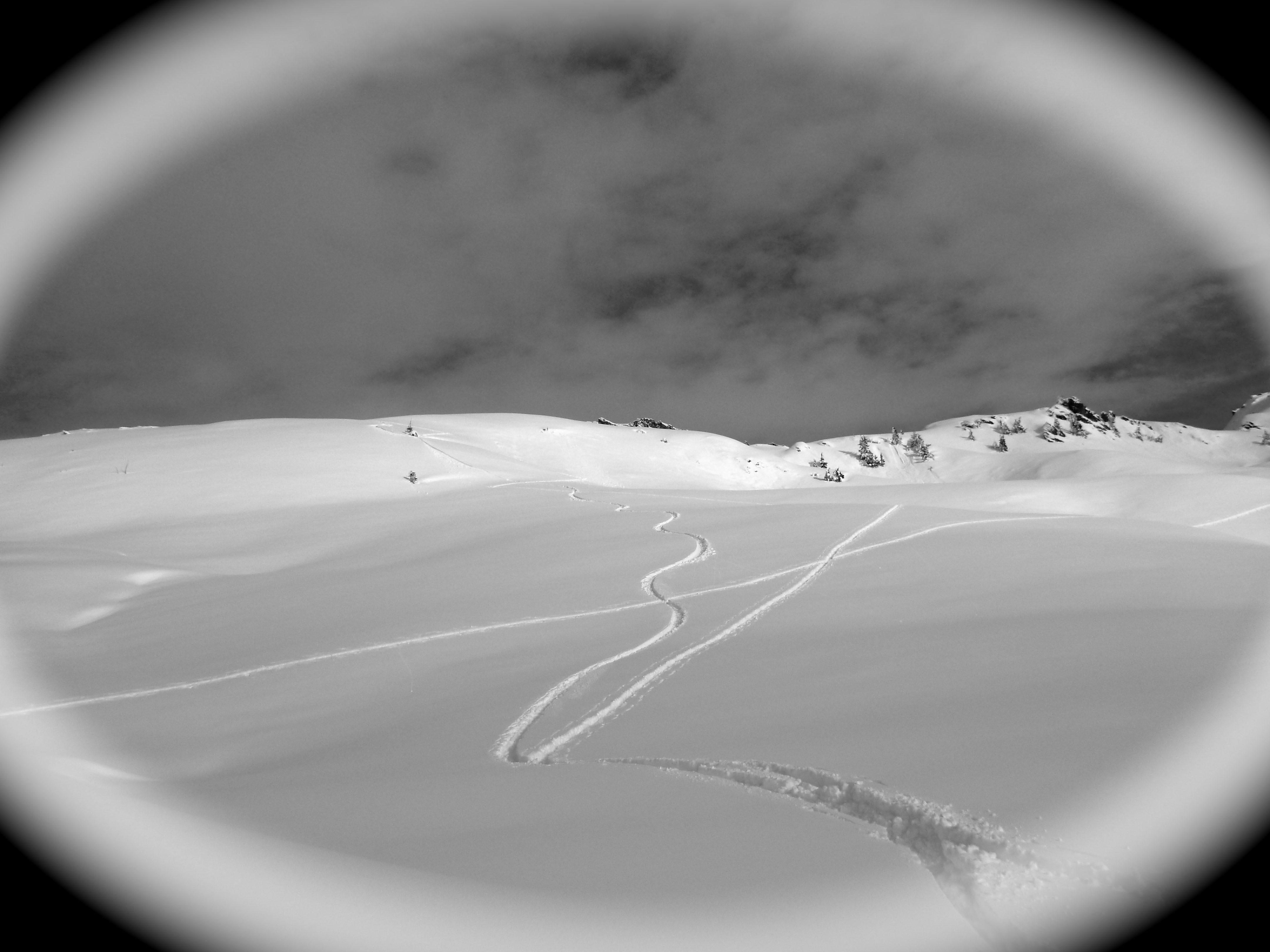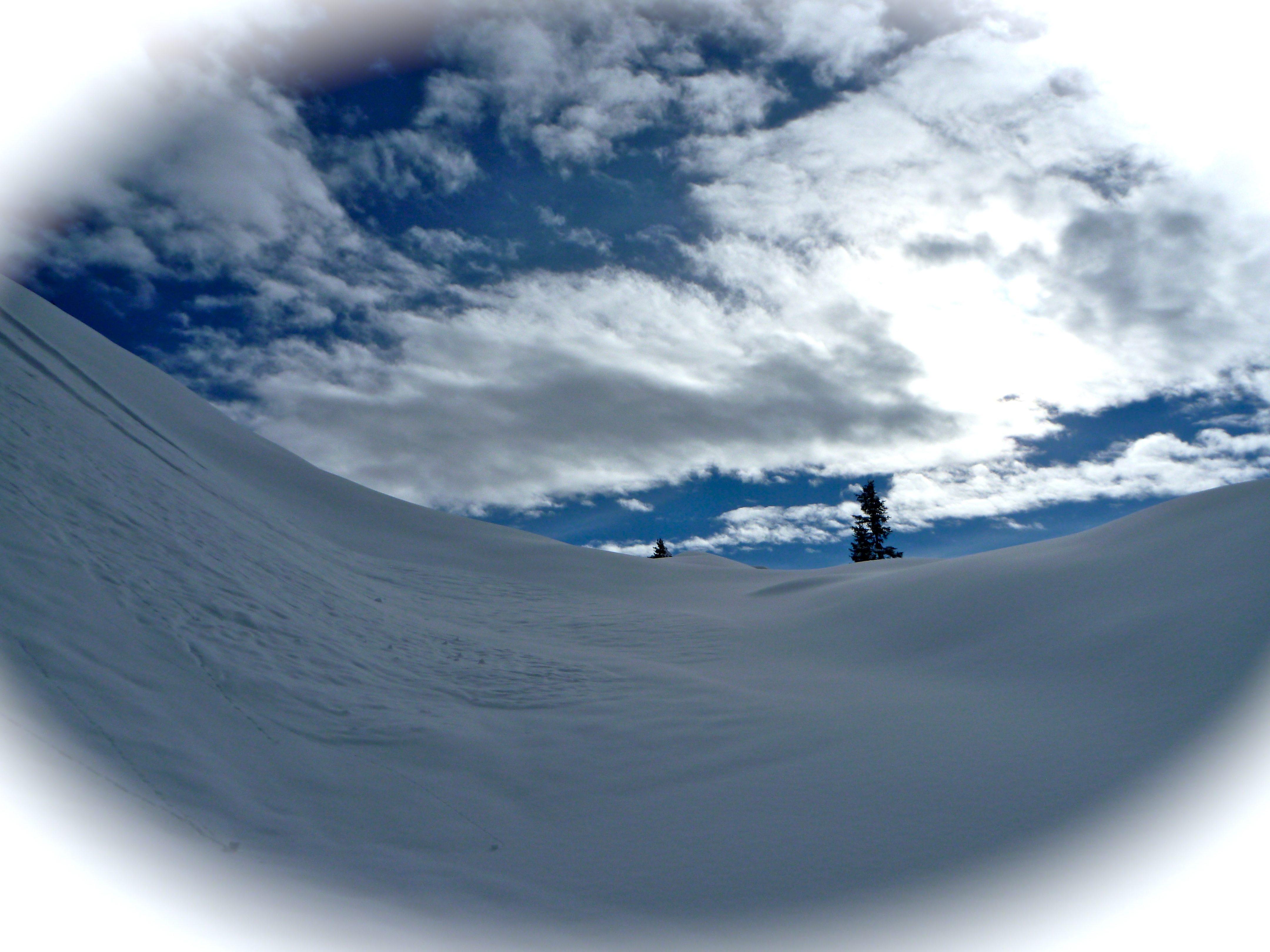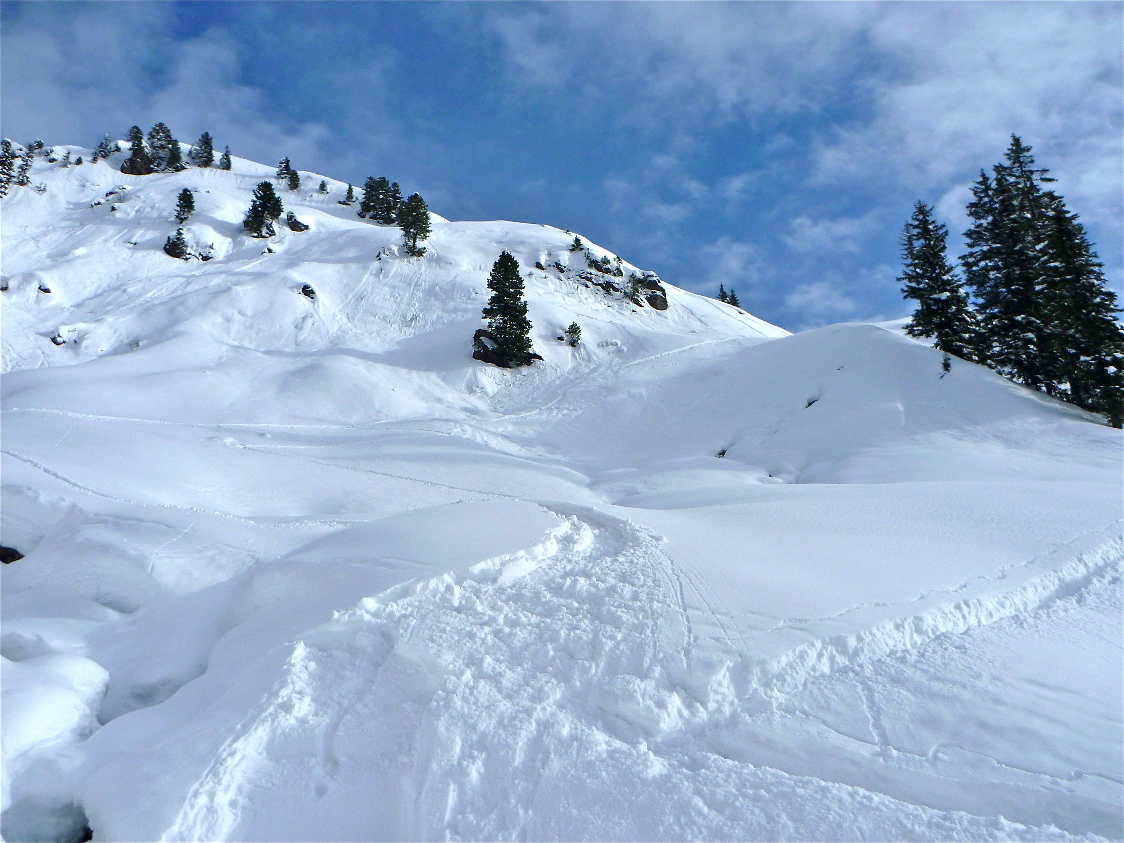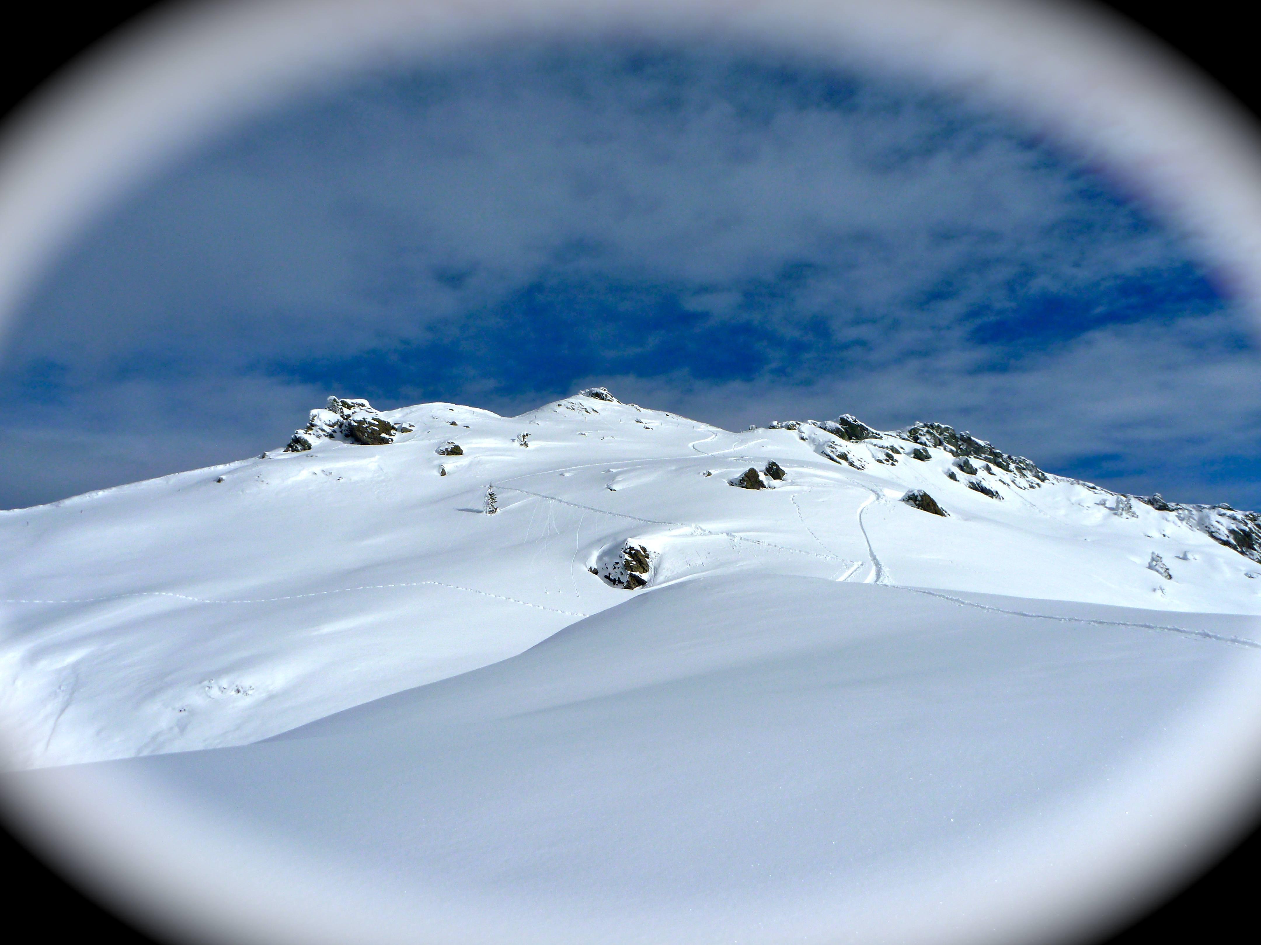 Schnee: Pulver mit Raureifoberfläche beim Anstieg sehr flauschig, später schon etwas schwerer