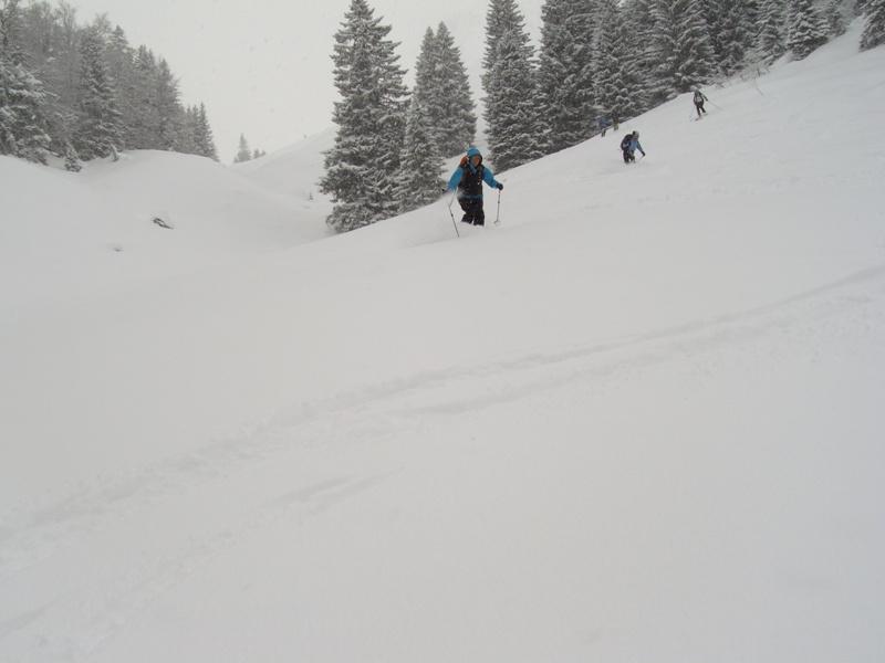 Wohin sollen wir uns wenden? - Dachte sich die USI-Tourenclique (mittlerweile) in der Früh bei der Abfahrt in Salzburg. Albrecht Seer hat die richtige Wahl getroffen: die prächtigen Südhänge des Hochkönigs, genannt Der hohe First. Harte Unterlage und 30 cm frischer Pulver, unverweht und auf gut 600 hm verteilt. Die Freaks unter uns haben die Aufstiegsspur gleich zwei Mal genützt wegen der Abfahrtsfreuden.