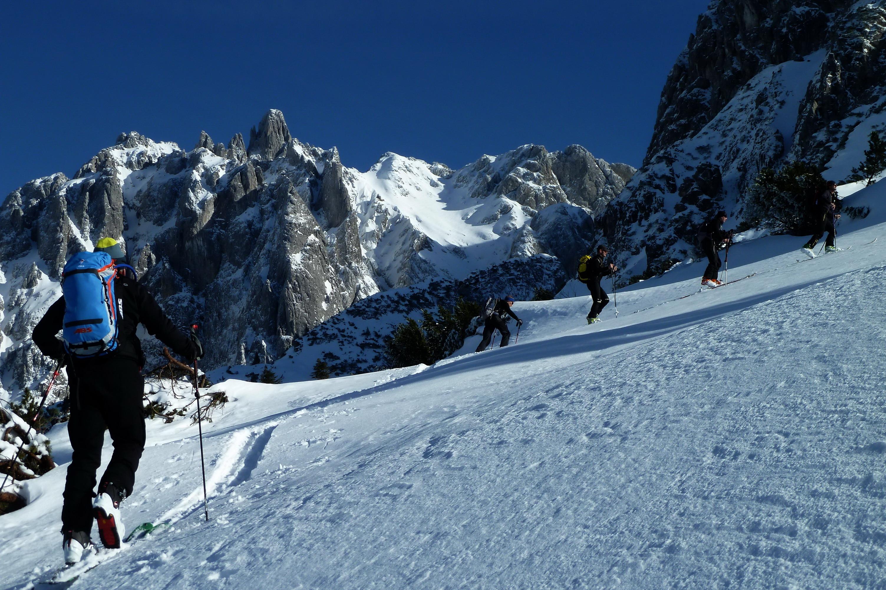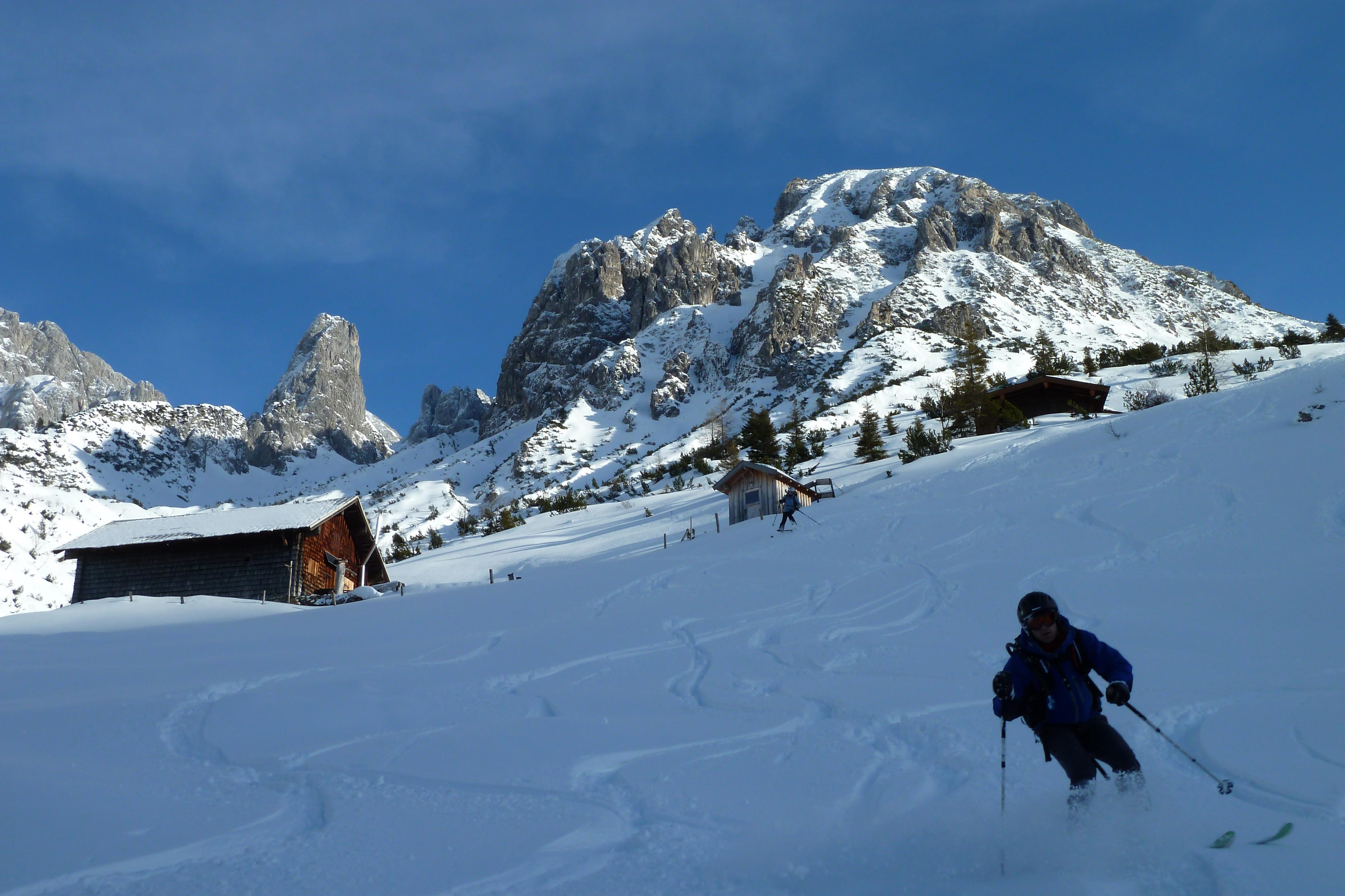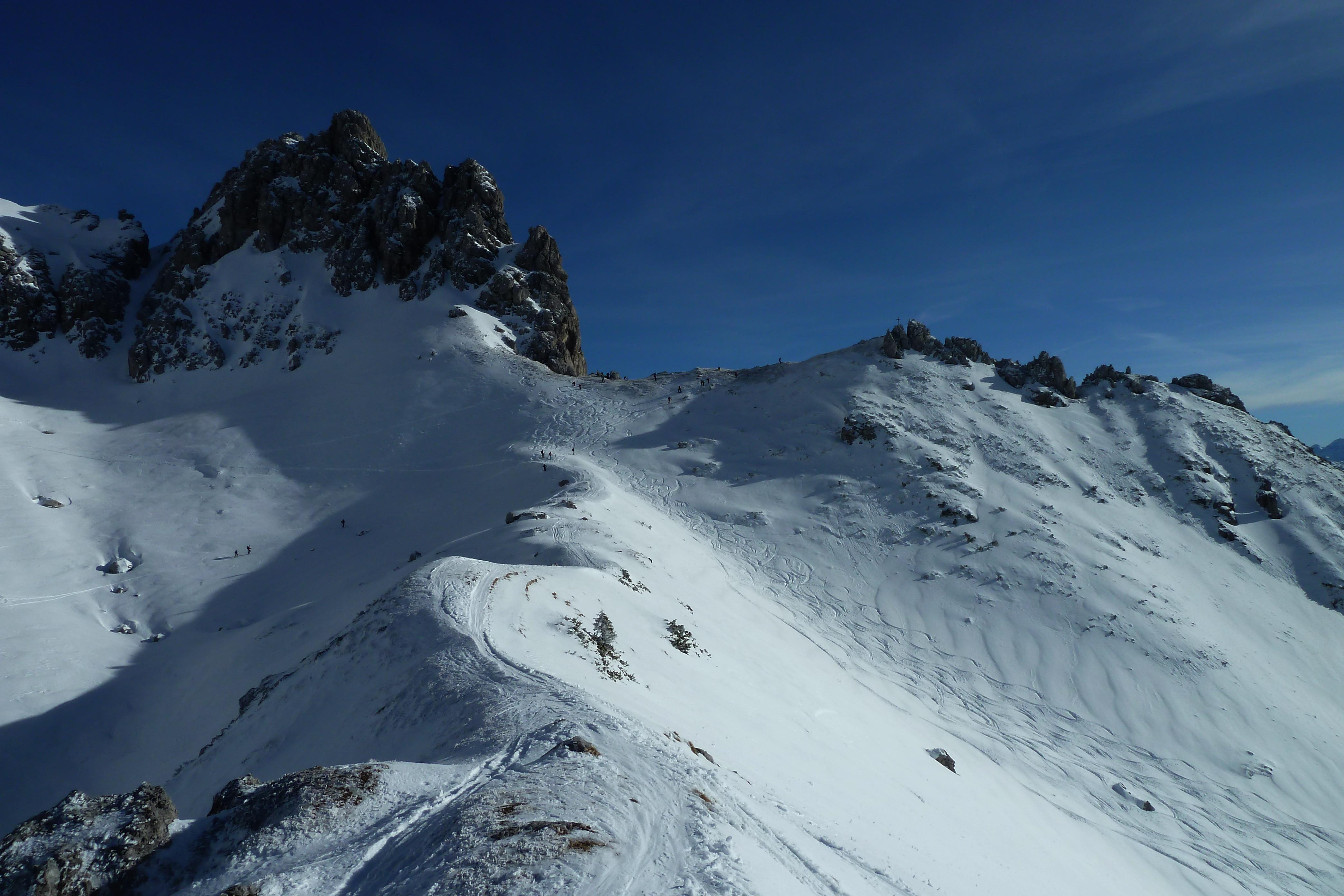 ca. 20 cm Neuschnee auf kompakter Unterlage, mit zunehmender Höhe wiederum stark windverfrachtet bzw. -bearbeitet.