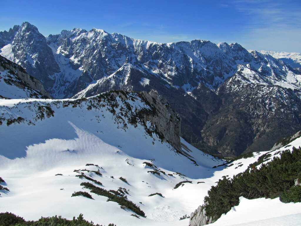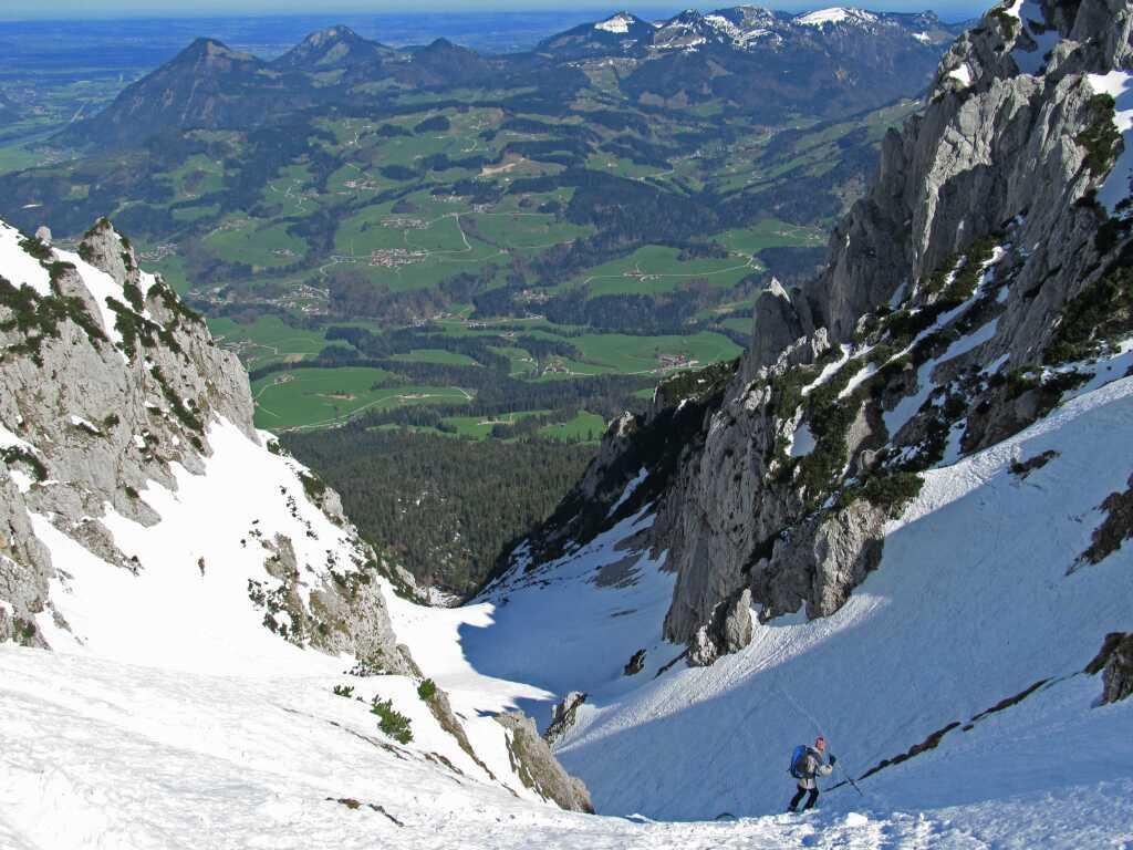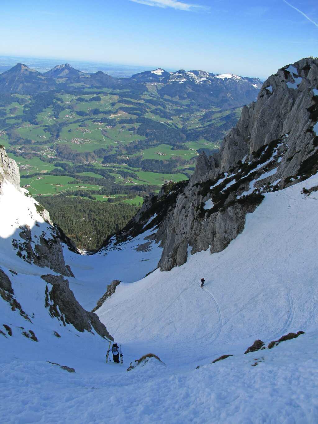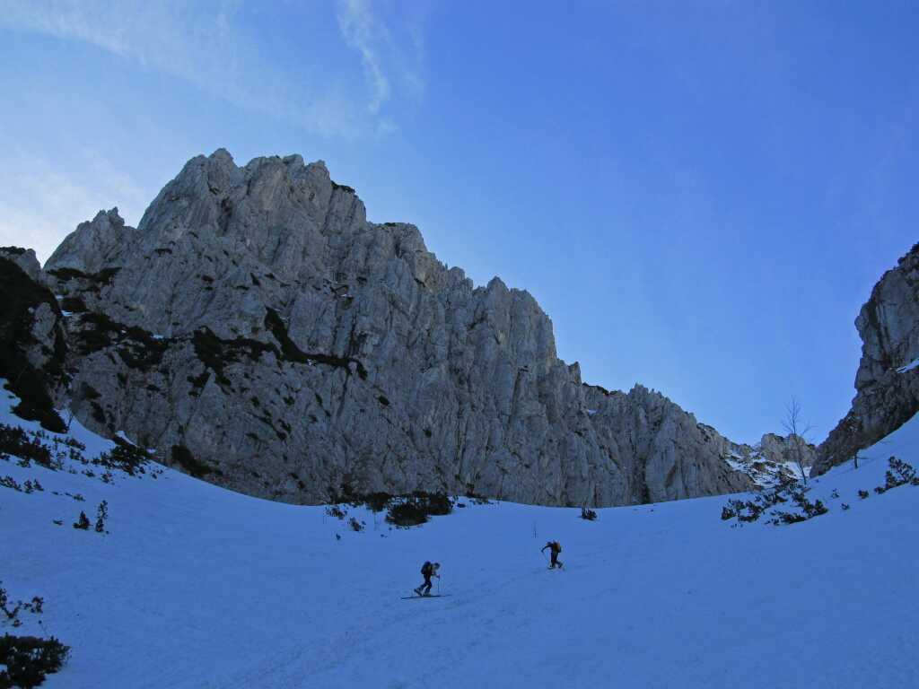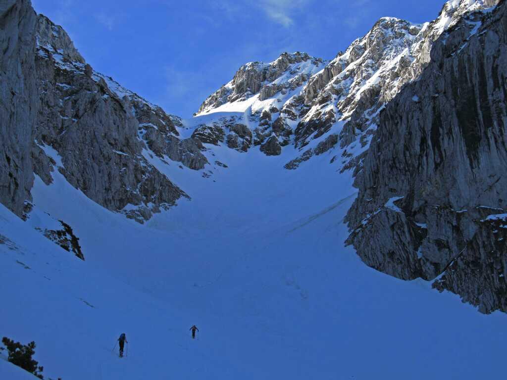 Schneelage: Ca. 40 Min. Ski bis zum Start im Eggersgrinn getragen. Der Schnee war nicht gefroren, weder unten, noch droben. Unten ca. 5-10cm Sulz (Stockeinsinktiefe), oberhalb ca. 1500m auf teilweise bis zu ca. 20-30cm zunehmend, aber durchwegs sehr stabil und gut mit Unterlage verbunden. Vorgänger haben sehr gute Spur angelegt, die es erlaubte auch das Steilstück größtenteils mit Ski aufzusteigen.