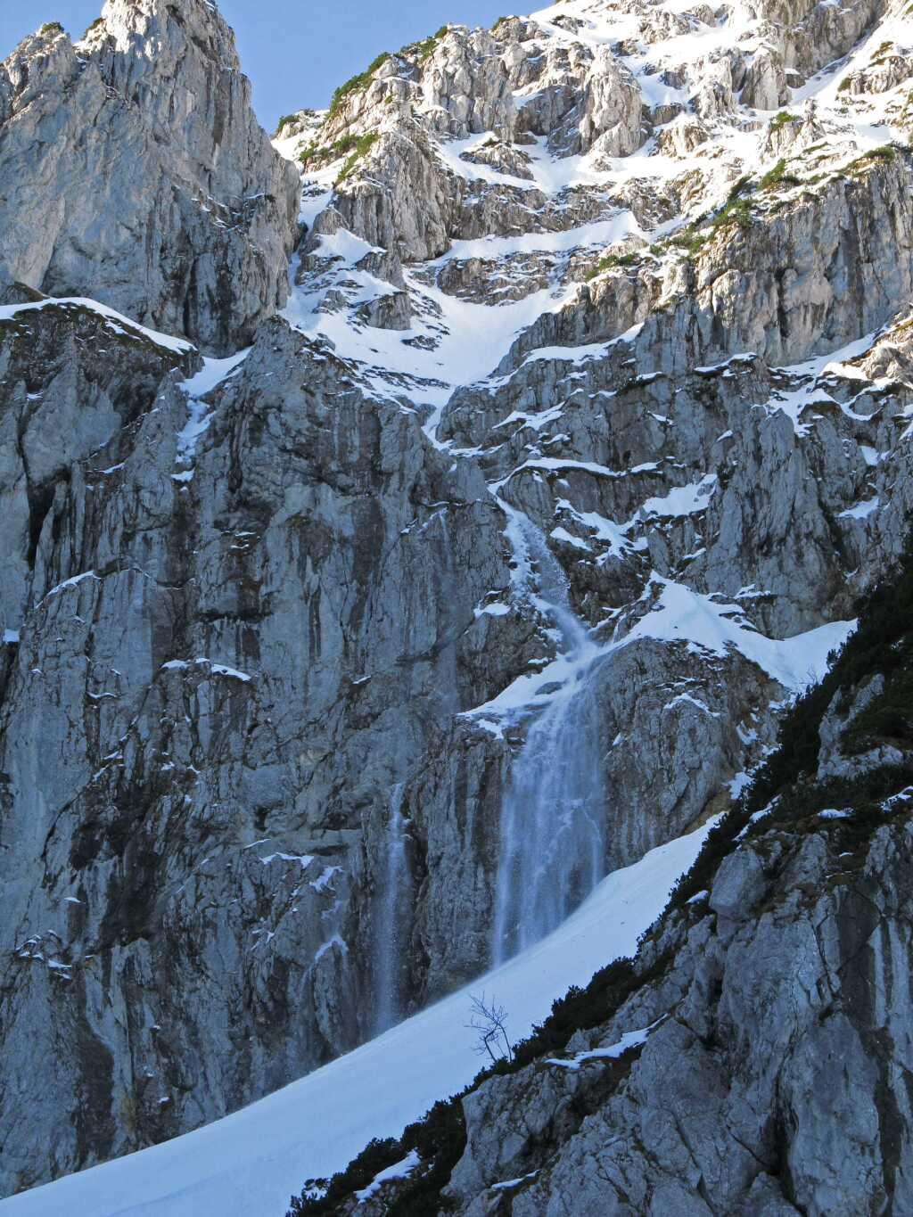 Aus sonnseitigen Felspartien häufige kleinere Nassschneeabgänge schon am Morgen.