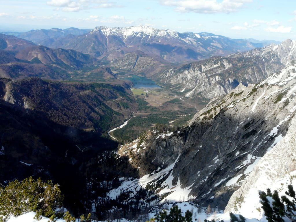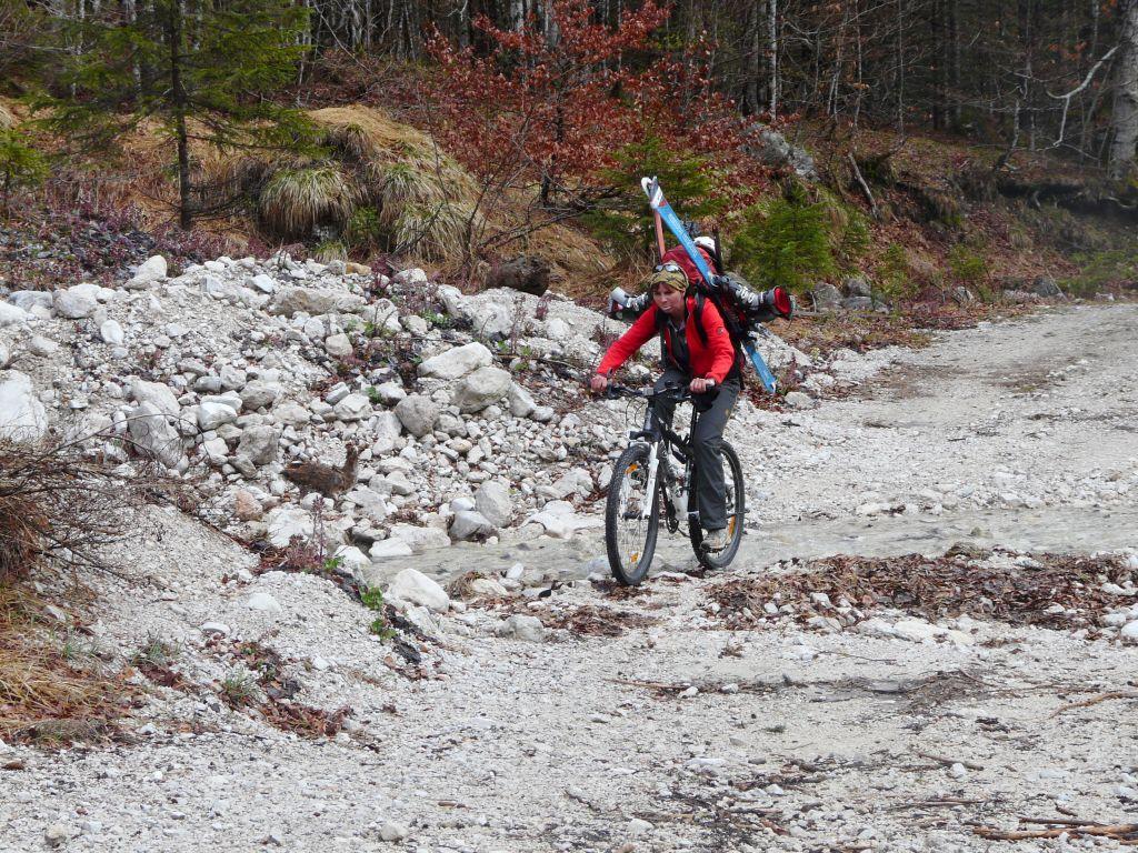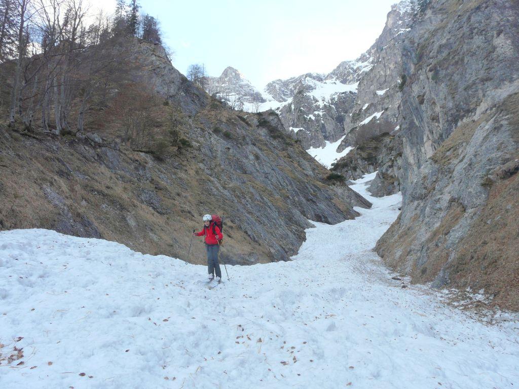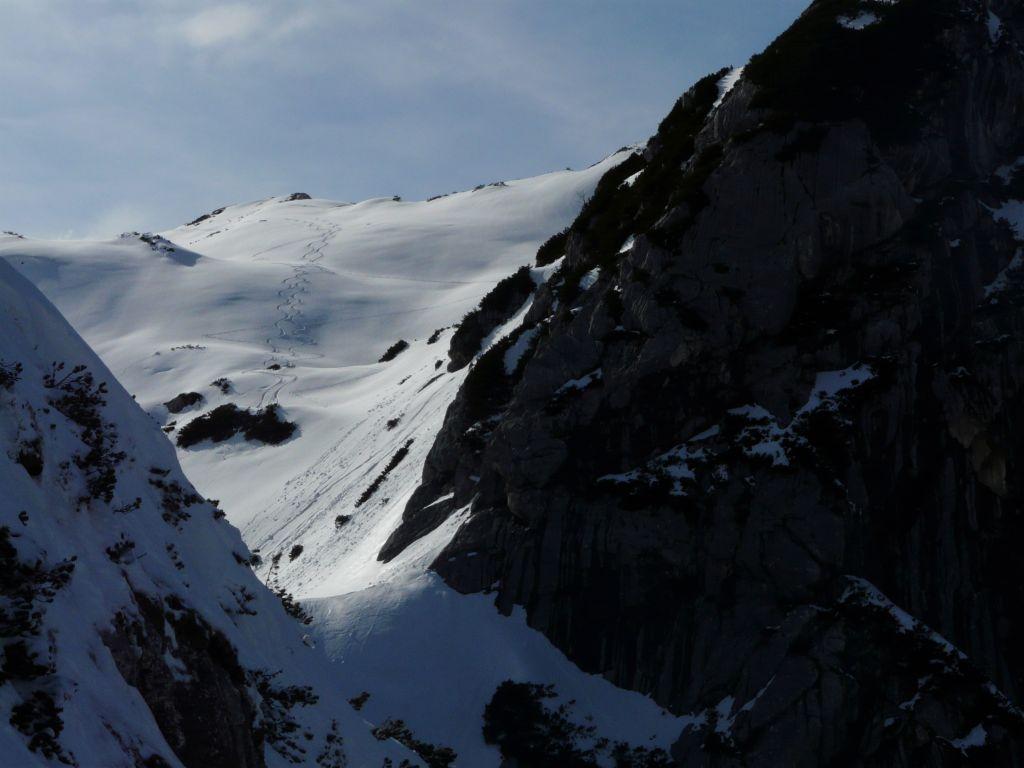 Abfahrt: bis zur Rampe, wieder teilweise zu Fuß hinab (die Verhältnisse sind für eine komplette Abfahrt im stellenweise bis zu 60° steilem Gelände trotz Pulver zu gefährlich, da einige Stellen mit Blankeis und geringer Pulverauflage und darunter hundert Meter hohe Steilwand. Von der (zerstörten) Jagdhütte links hinab die Schlucht, dann 10 Minuten Skitragen bis zu den Bikes und gemütlich ausrollen bis zum PP beim Almsee (600m).