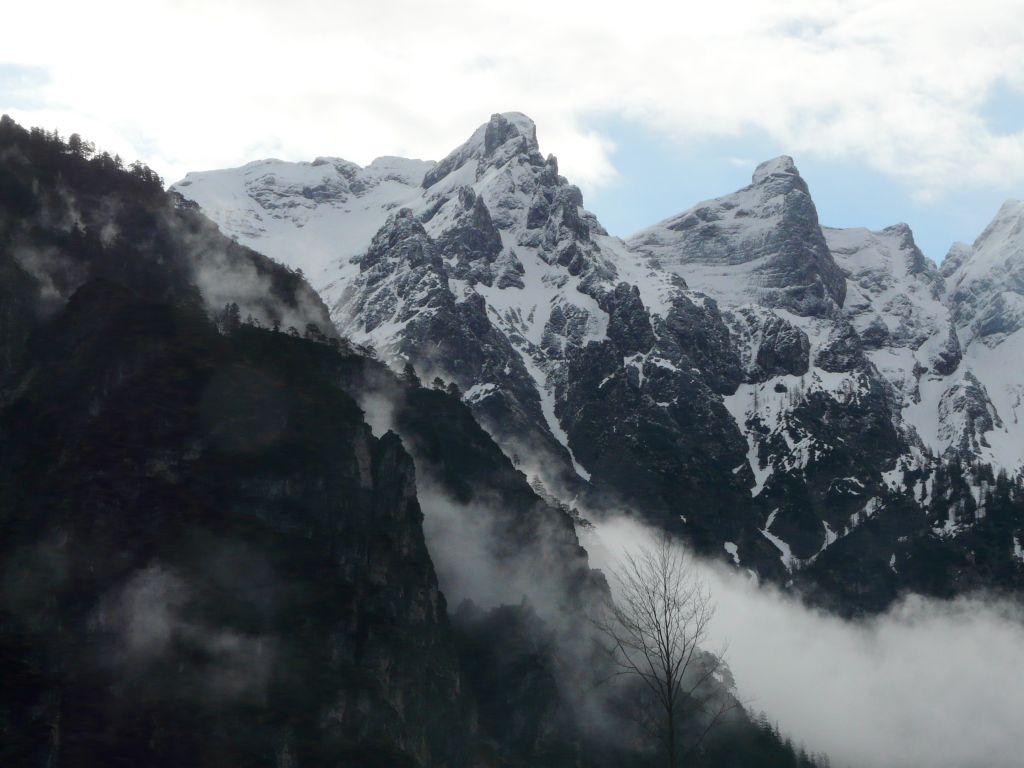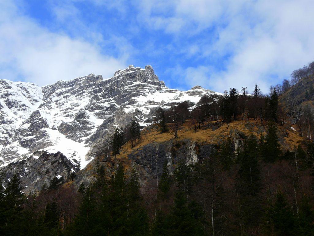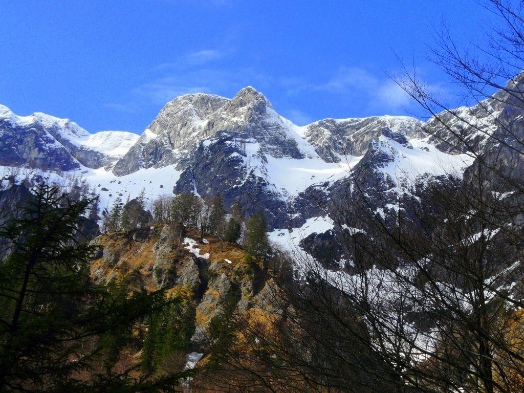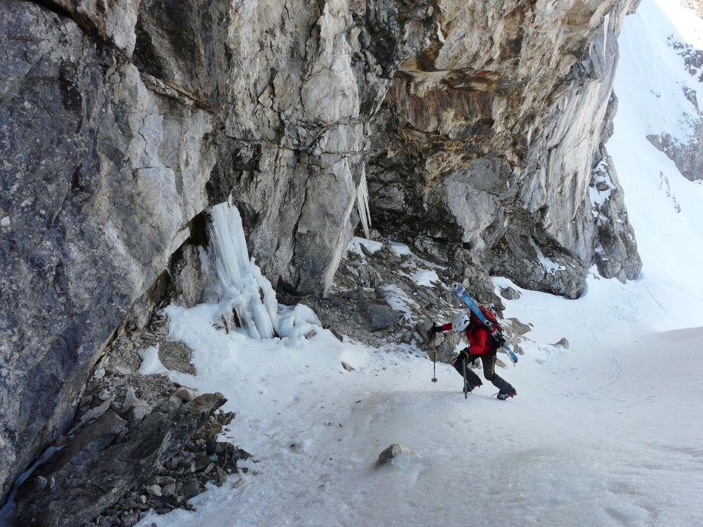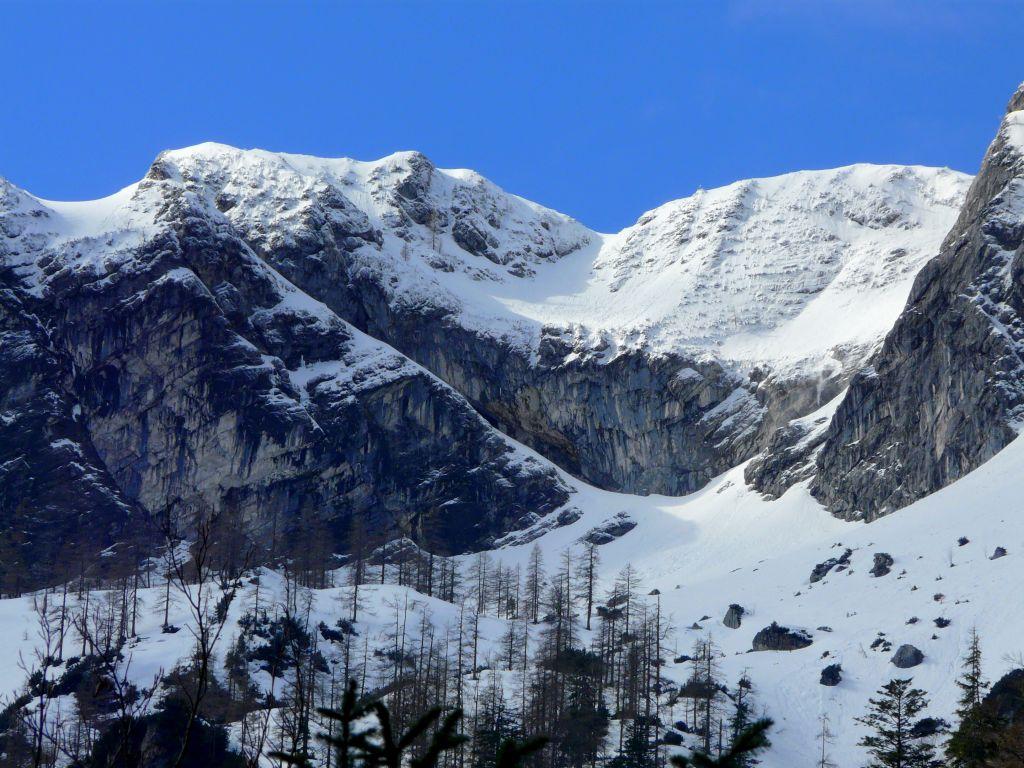 Abfahrt: bis zur Rampe, wieder teilweise zu Fuß hinab (die Verhältnisse sind für eine komplette Abfahrt im stellenweise bis zu 60° steilem Gelände trotz Pulver zu gefährlich, da einige Stellen mit Blankeis und geringer Pulverauflage und darunter hundert Meter hohe Steilwand. Von der (zerstörten) Jagdhütte links hinab die Schlucht, dann 10 Minuten Skitragen bis zu den Bikes und gemütlich ausrollen bis zum PP beim Almsee (600m).