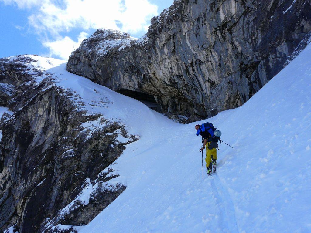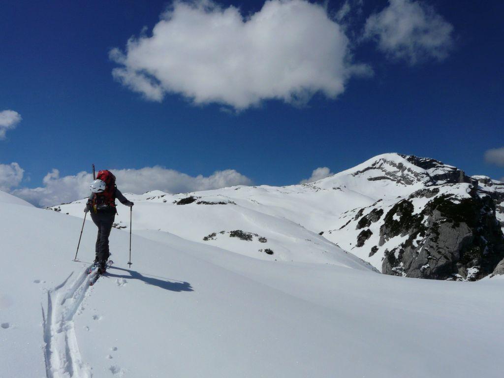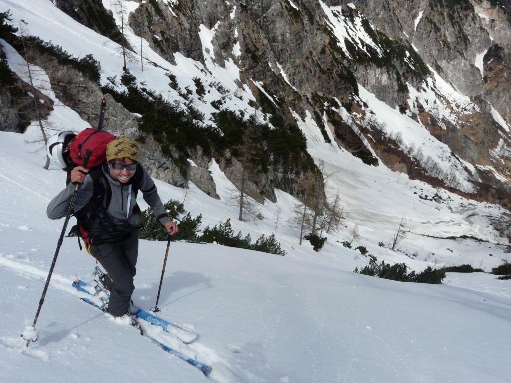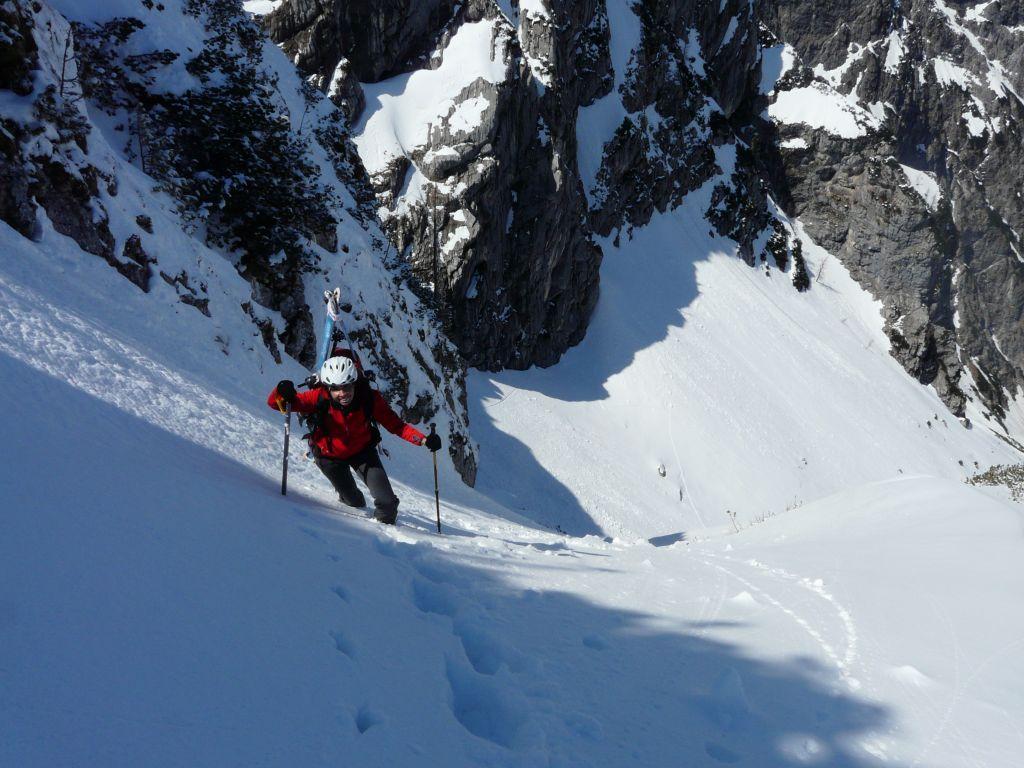 einer neuerlich von einer Lawine zerstörten Jagdhütte auf ca. 1.000m Höhe, Anschnallen und den sehr steilen Hang rauf ins Wildkar (ca. 1.300m), das sehr schöne Gelände weiter bis zur Rampe, bewaffnet mit Pickel bzw. Beil und Steigeisen rauf zum Ausstieg auf knapp 1.800m, wieder mit Fellen weiter zum Gipfel (langwierig, da Muldengelände mit einigem auf/ab)
