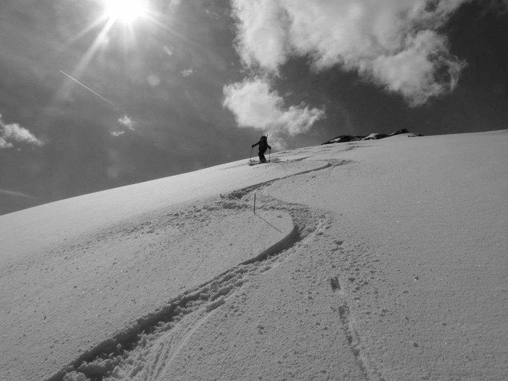Charakteristik der Tour: extrem lang, konditionsraubend, stellenweise recht alpin, gewaltig schön und völlig einsam, Schneeverhältnisse Pulver locker bis leicht gepresst und teilweise aufgrund der späten Tageszeit Harschdeckel, tiefer gelegen Firn.