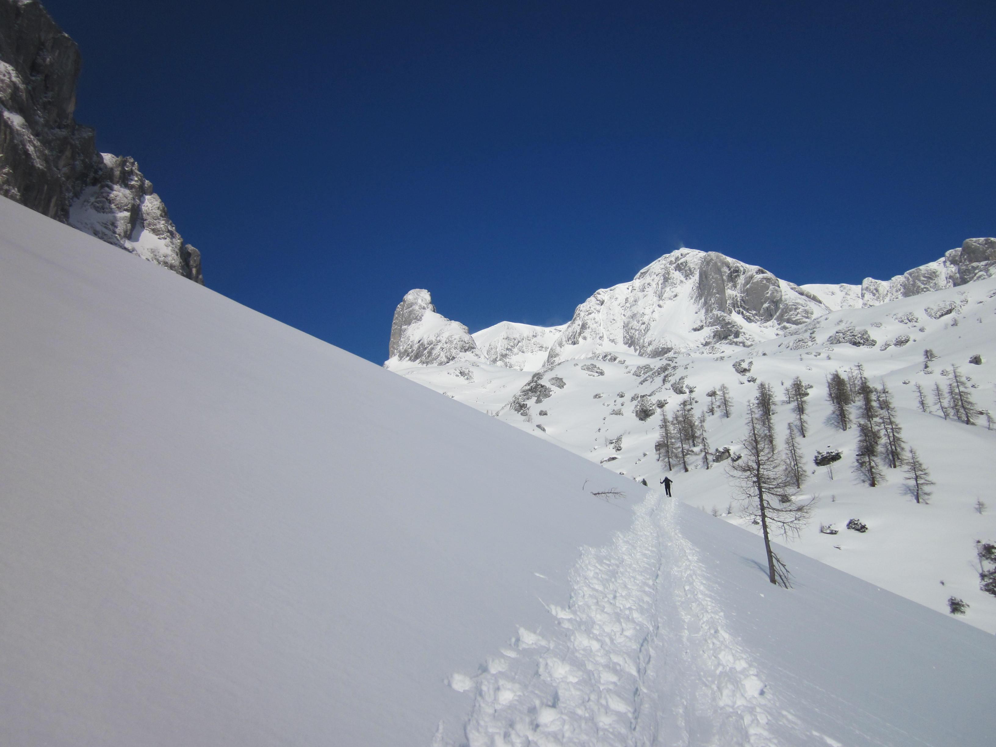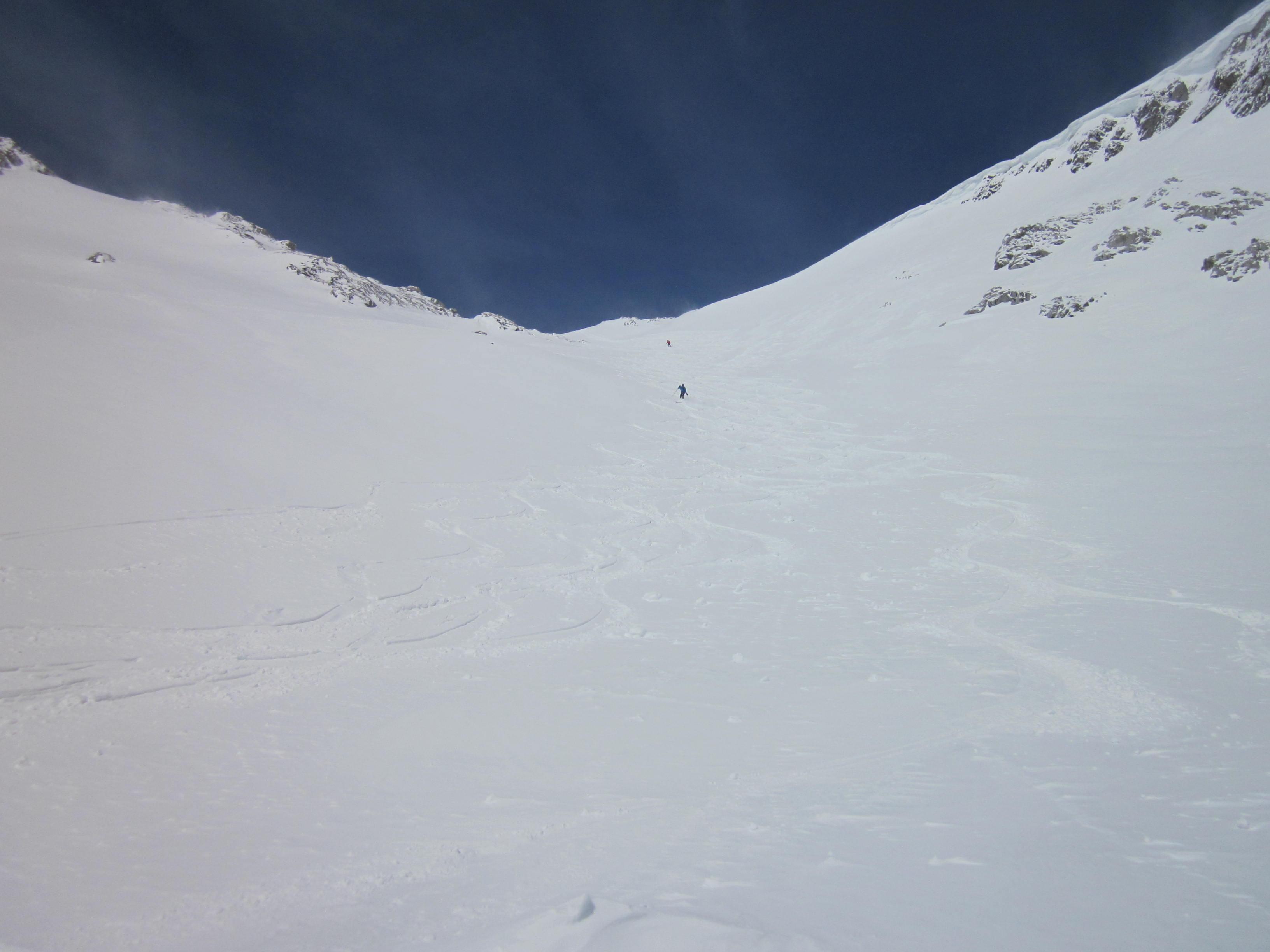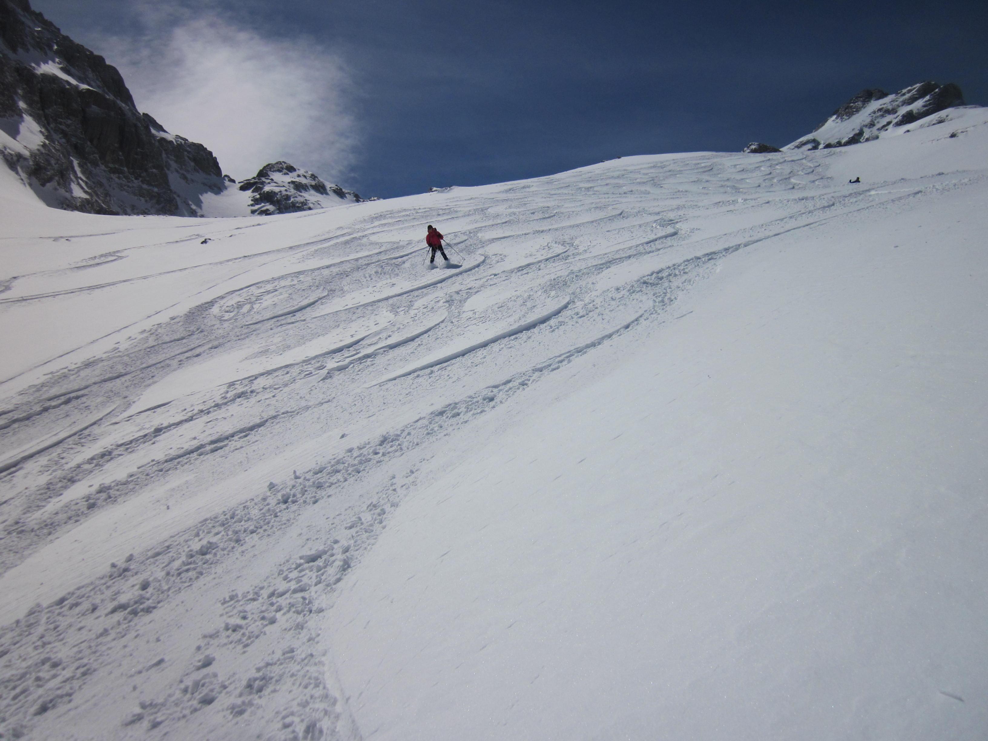 Pulver im April - wann hat man das schon. Ganz oben ging der Sturm und es war eisig kalt. Darum oben viel abgeblasen, aber ab dem oberen Ochsenkar Pulver wie im Hochwinter [mehr]