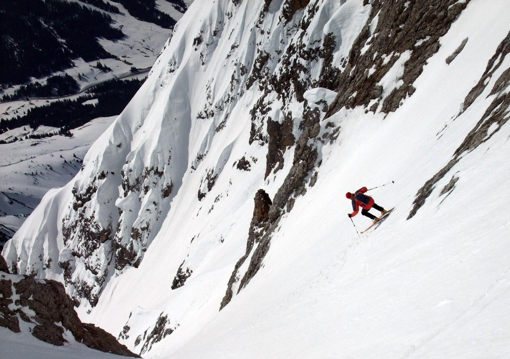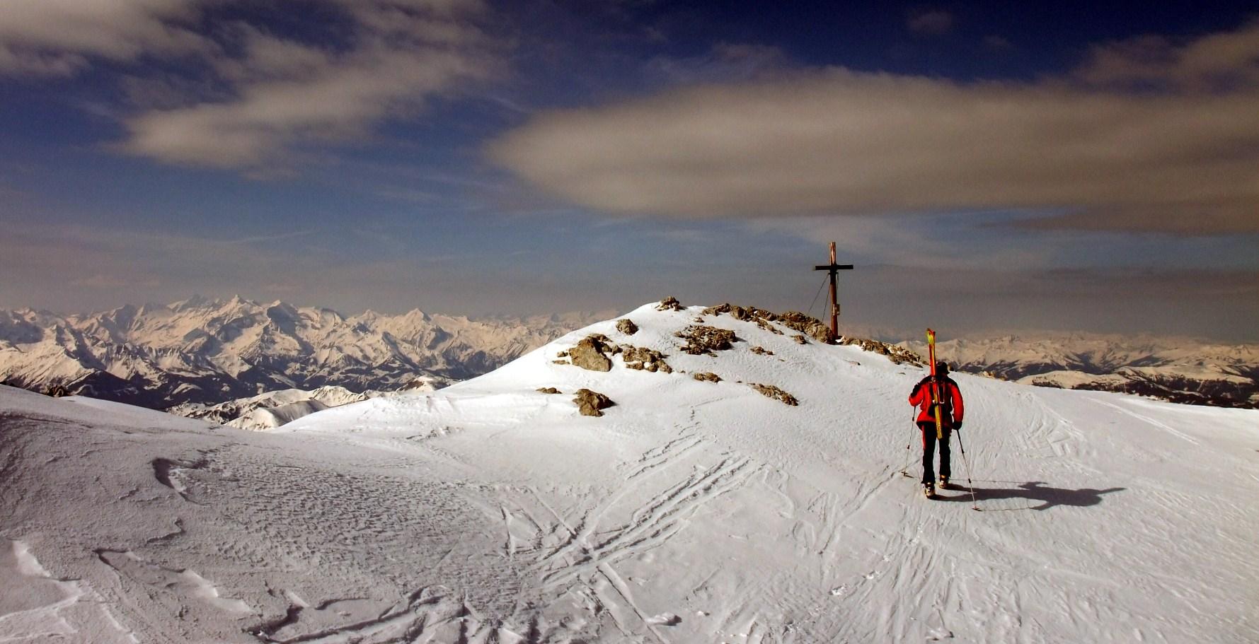 Mit Bruder Sewi im "Neuland". Vom Parkplatz der Erichhütte bei besten Harschverhältnissen übers Weißkar auf den Gipfel. Ab 1850 m verwenden wir die Steigeisen. Sorge bereitet uns der bewölkte Himmel. Wenn es nicht auffirnt, fahren wir hier nicht ab. Ersatzlösungen werden beim Aufstieg schon durchgedacht, sogar ein Gang zum Hochkönig und die Abfahrt über die Mittenfeldalm.steht in Diskussion. Am Gipfel scheint es besser zu werden - immer öfter kommt die Sonne heraus, immer größer werden die Wolkenfenster. Nach der gemütlichen Gipfelstunde hat es goldrichtig aufgefirnt - was für ein Gottesgeschenk! Über wirklichen Bilderbuchfirn fahren wir mit Freude bis zur Erichhütte. Erst hier wird es ein bisschen tiefer.
