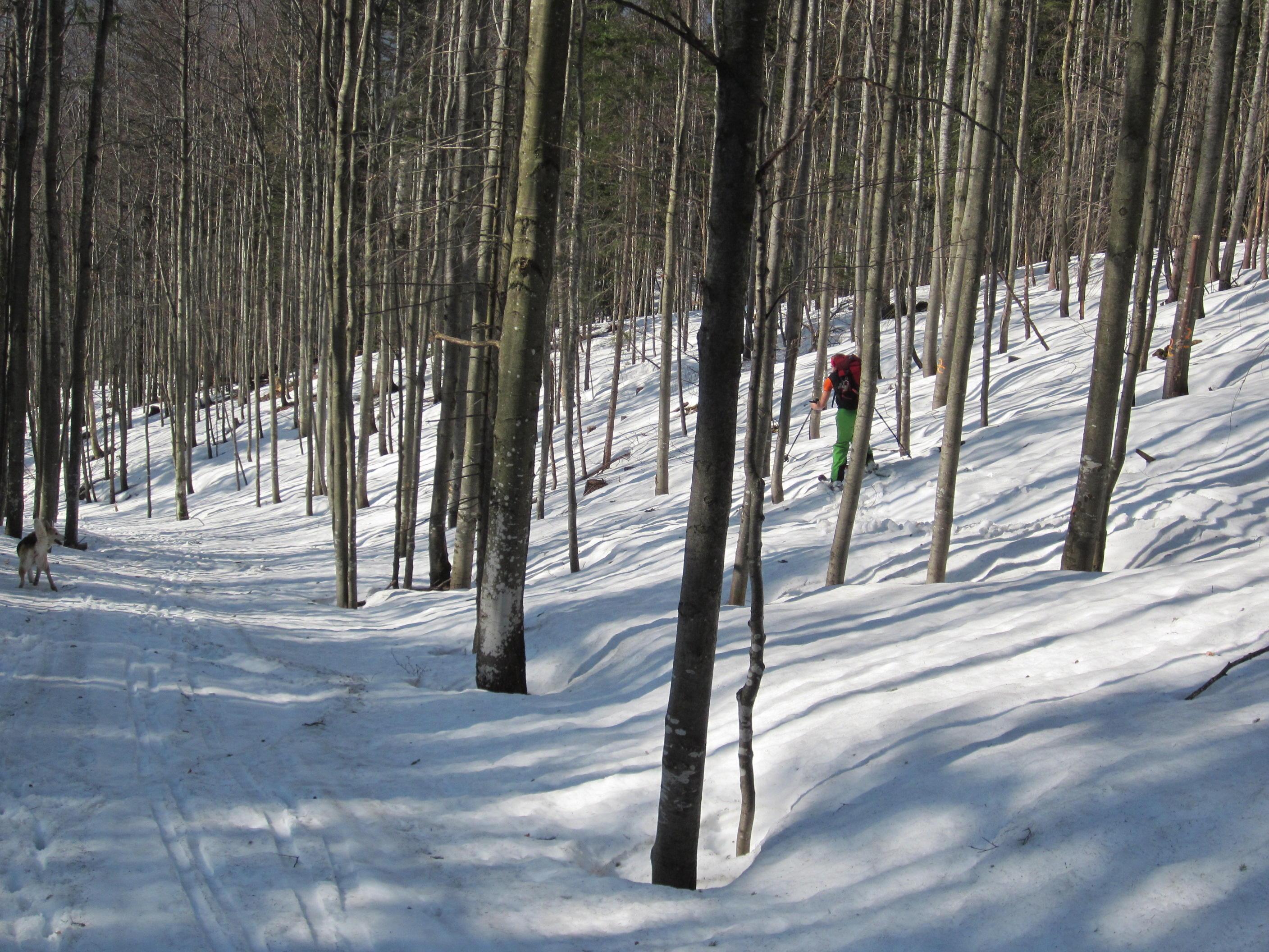 Ca. 14:00 Uhr wäre der ideale Zeitpunkt für die Abfahrt gewesen, da auch die spiegelnden Steilabschnitte aufgefirnt waren. Danach wurden die Schatten schon wieder länger später bei der Abfahrt war es war im steilen oberen Abschnitt gleich wieder recht hart, aber noch gut zu fahren.
