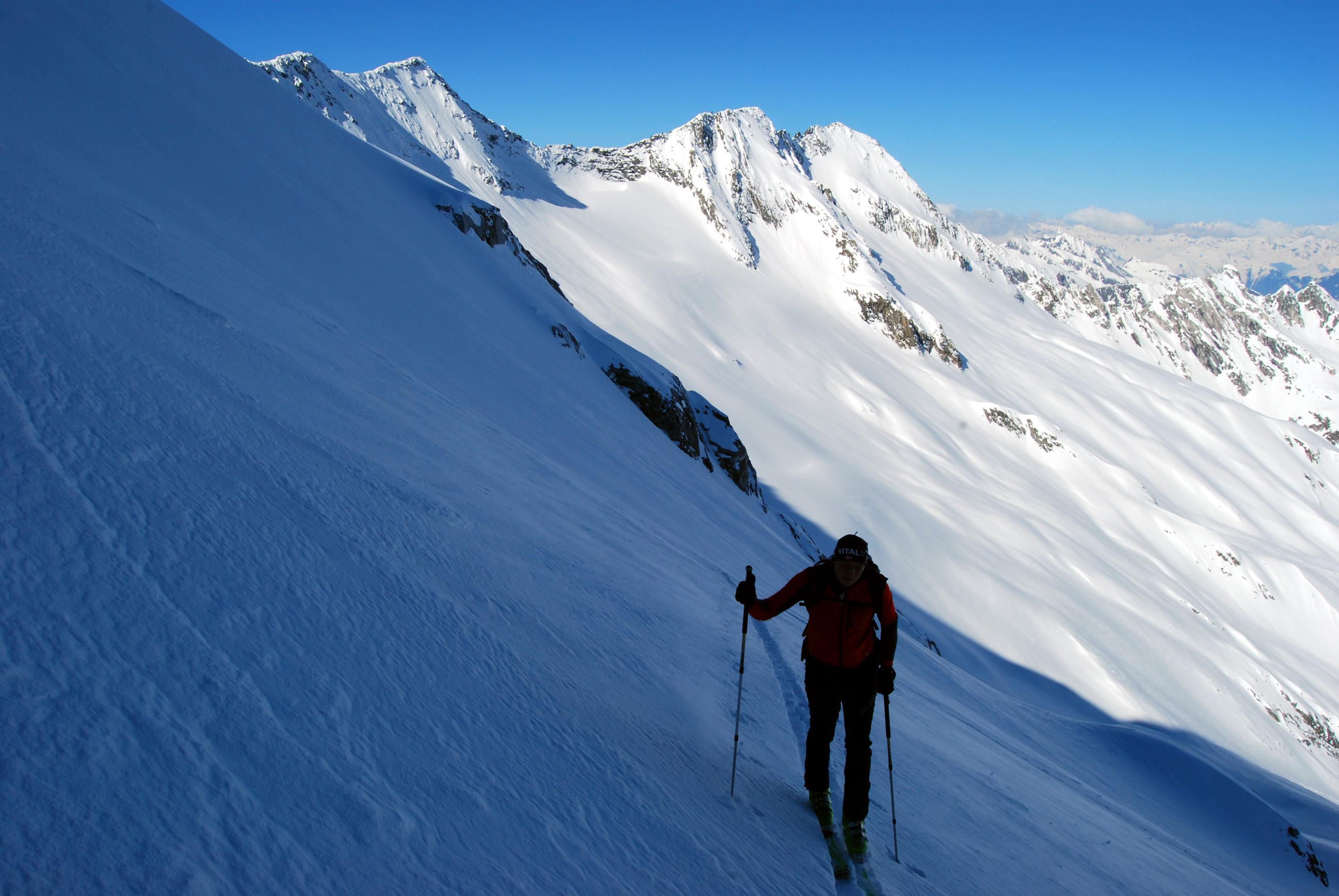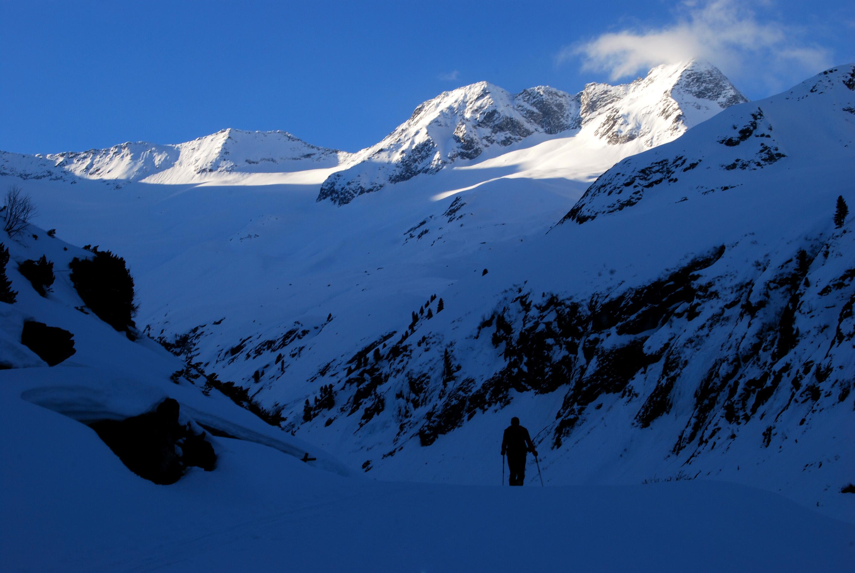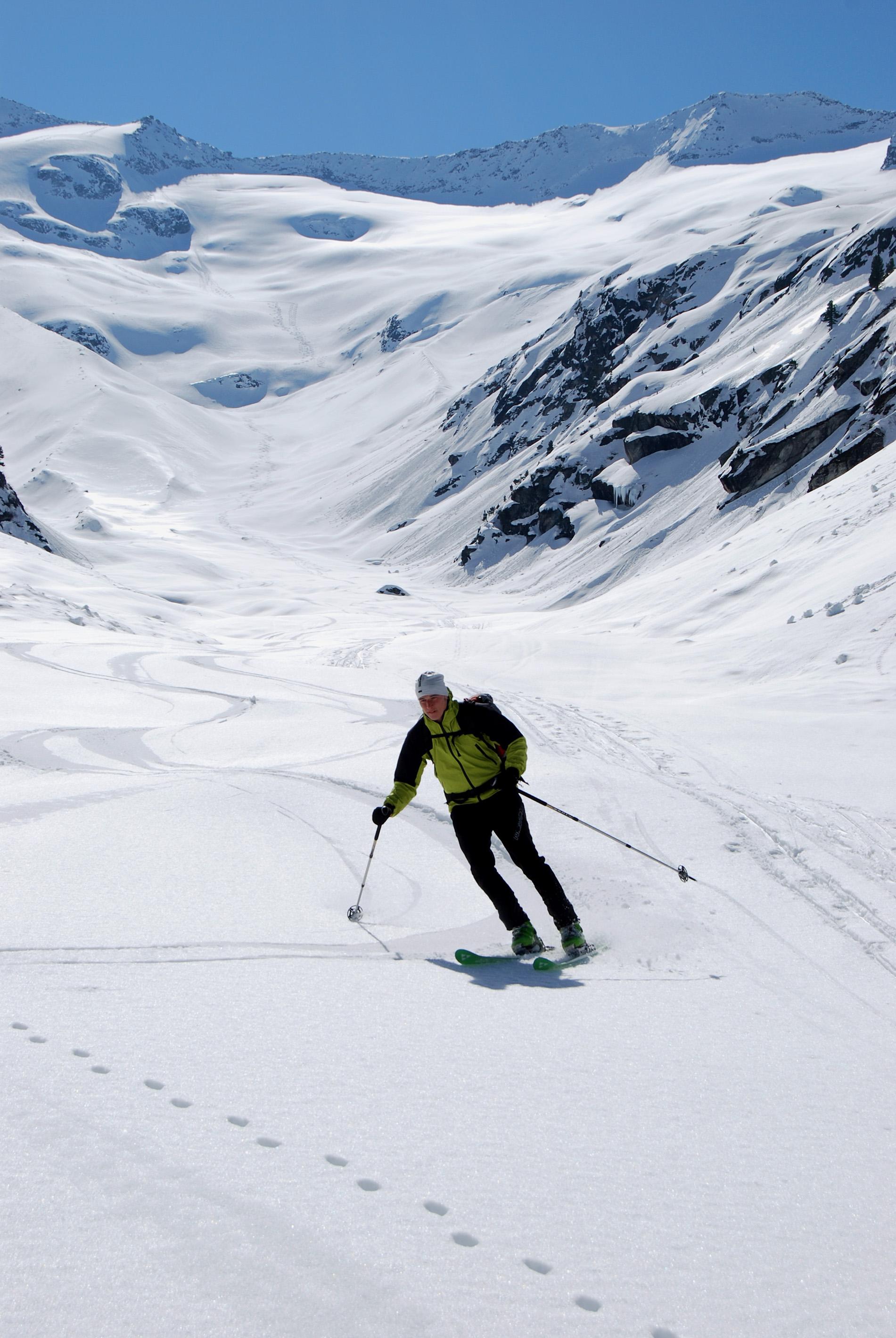Immer noch richtig viel Schnee im Zillertal. Die Langlaufloipe im Schönachtal wird auch noch fleißig gespurt. Landschaftlich und schifahrerisch ist die Schönachschneid eine wunderschöne Schitour. Die steilen Pulverhänge muß man sich aber mit einem langen Talhatscher erst verdienen.