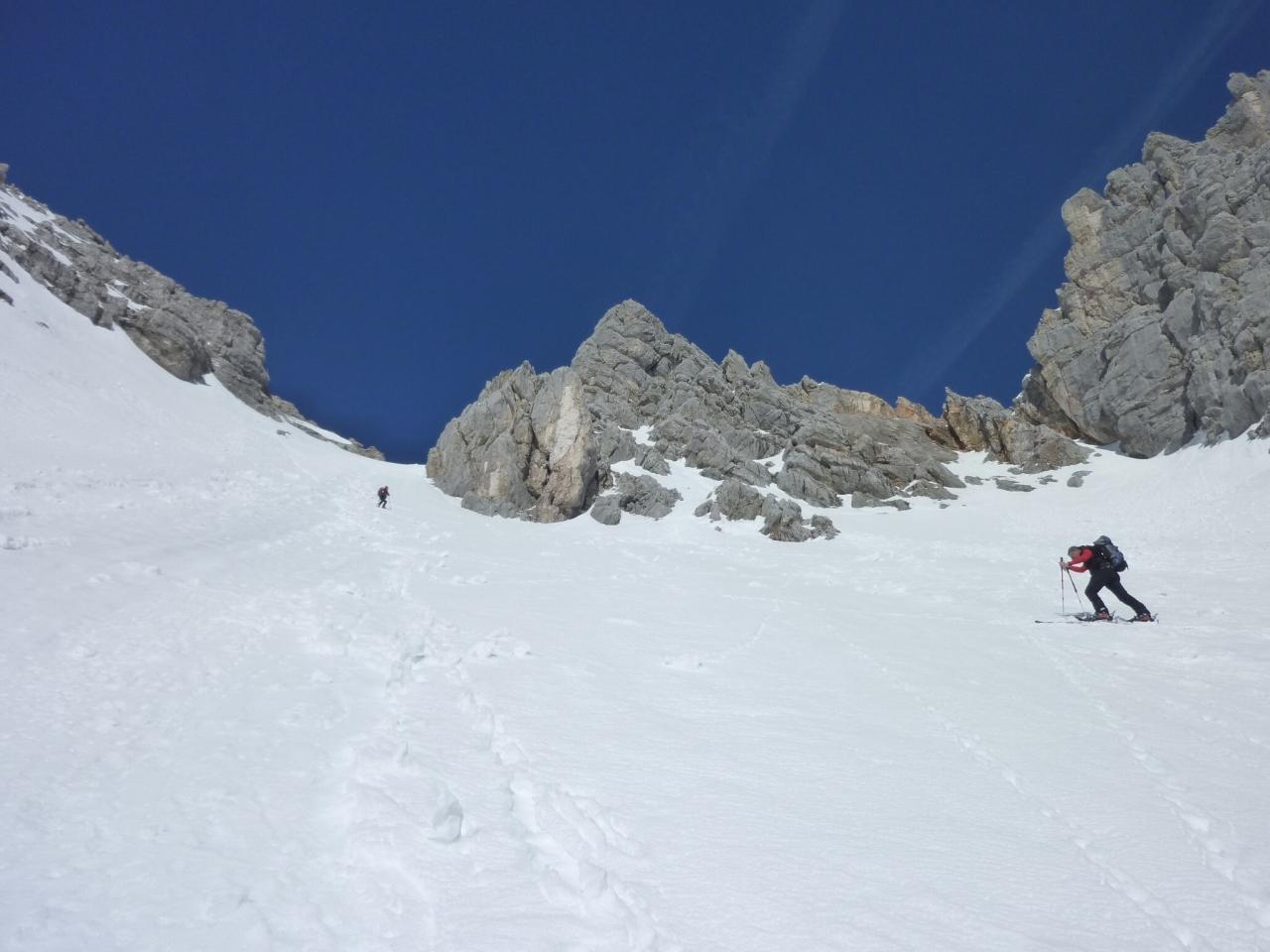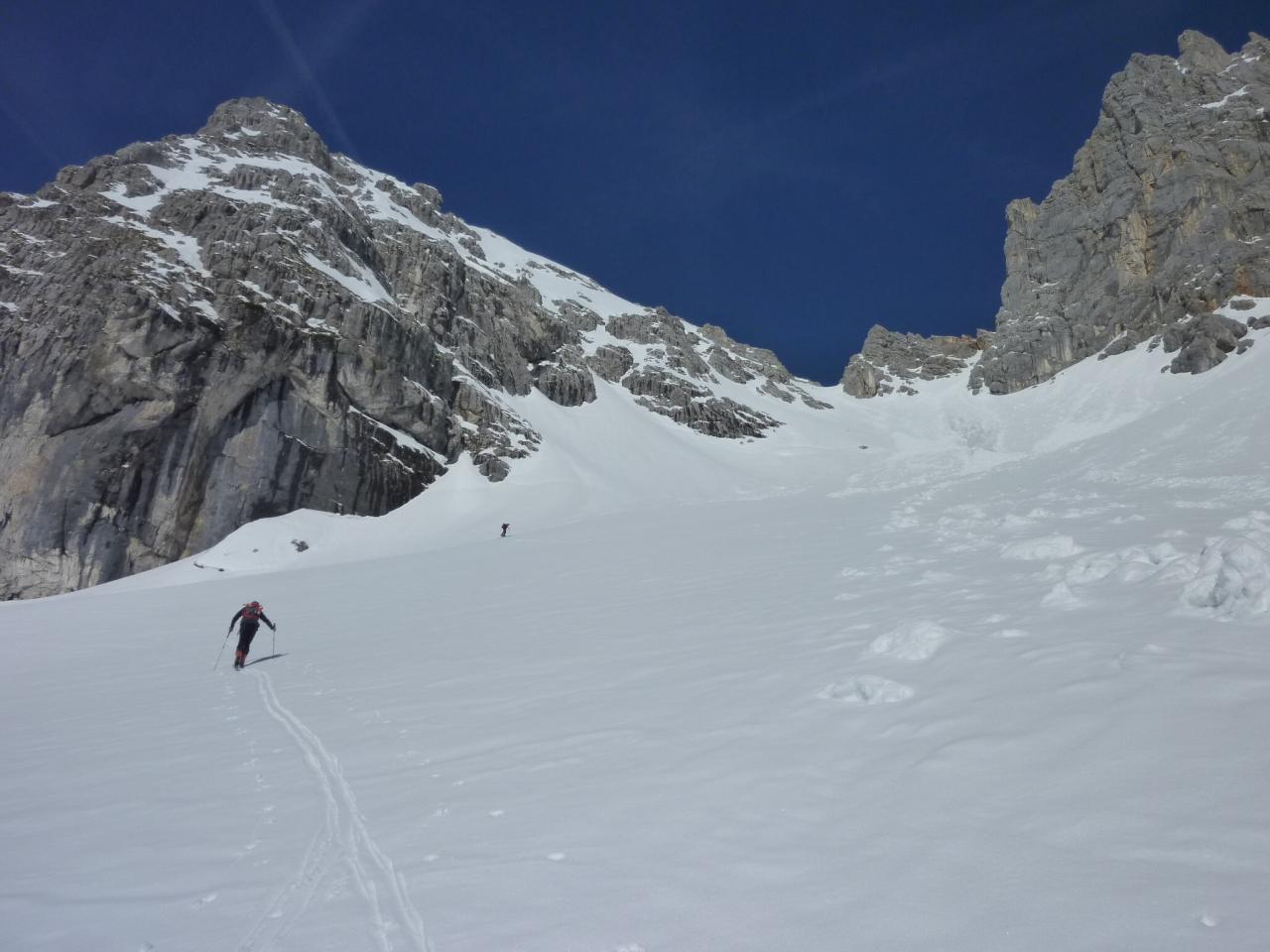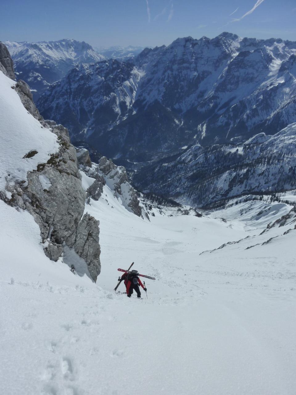 Aufstieg durch den Fellerer Sand ins Rotschartl. Im oberen Teil ist der in der vergangenen Zeit gefallene Neuschnee noch nicht wirklich ein Firn, eher patzig, aber recht gut fahrbar. Je weiter hinunter, desto besser, über weite Strecken die berühmten 2 cm Firn. Im direkt besonnten Steilgelände ist jedoch Vorsicht geboten, da schon am frühen Vormittag der Schnee aufweicht und grundlos wird.