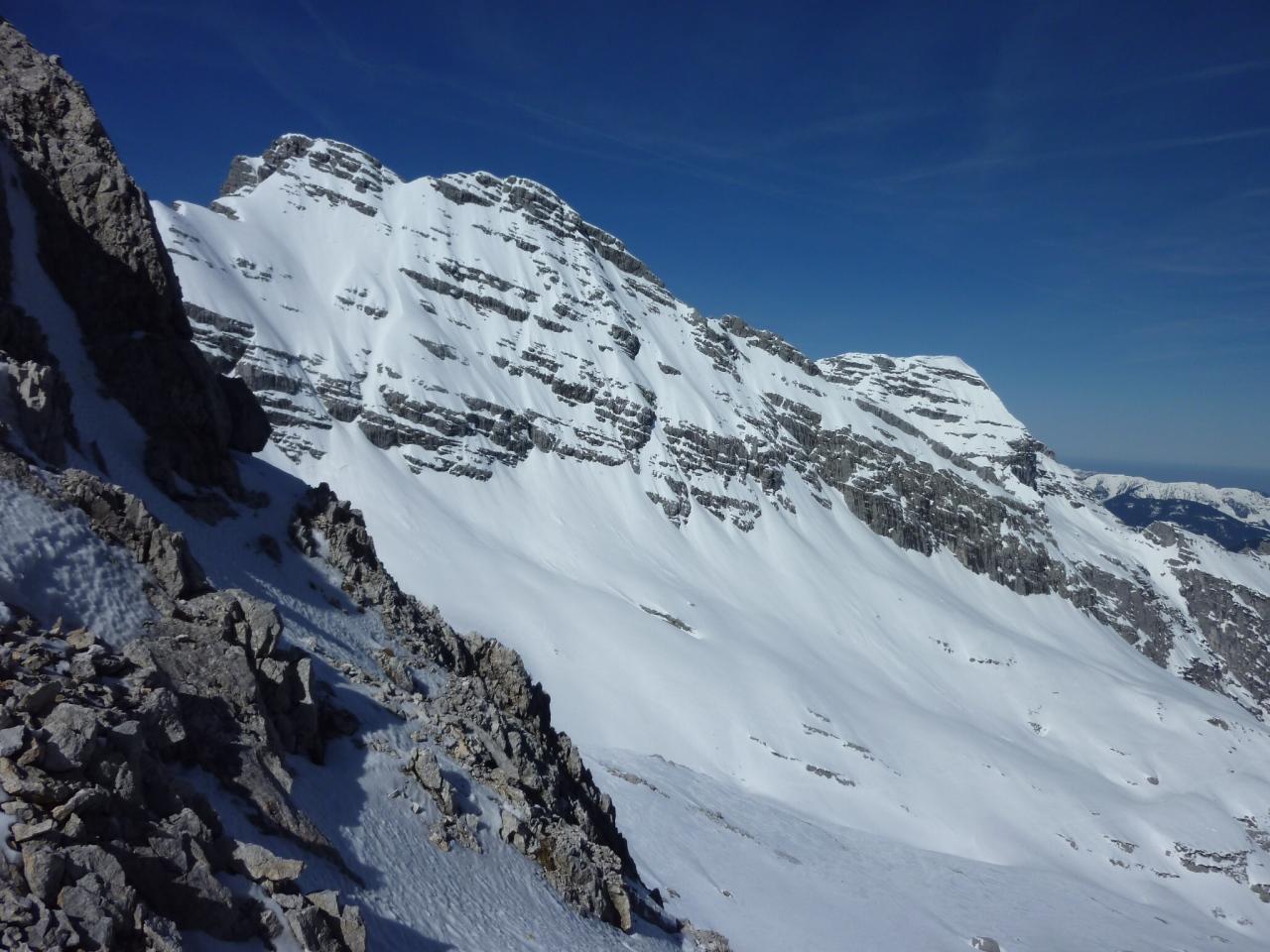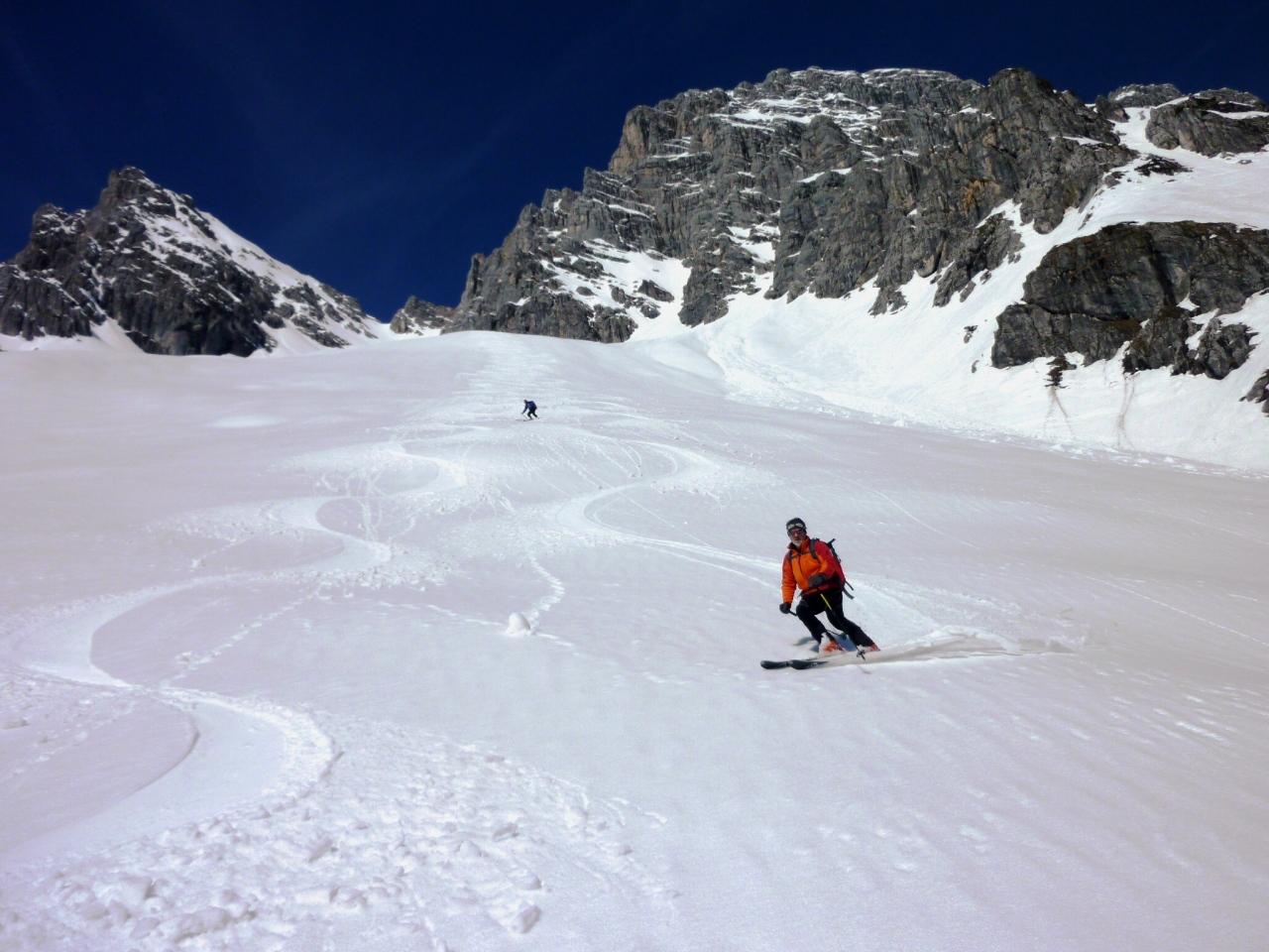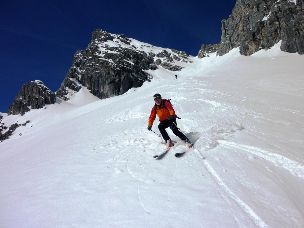 Aufstieg durch den Fellerer Sand ins Rotschartl. Im oberen Teil ist der in der vergangenen Zeit gefallene Neuschnee noch nicht wirklich ein Firn, eher patzig, aber recht gut fahrbar. Je weiter hinunter, desto besser, über weite Strecken die berühmten 2 cm Firn. Im direkt besonnten Steilgelände ist jedoch Vorsicht geboten, da schon am frühen Vormittag der Schnee aufweicht und grundlos wird.