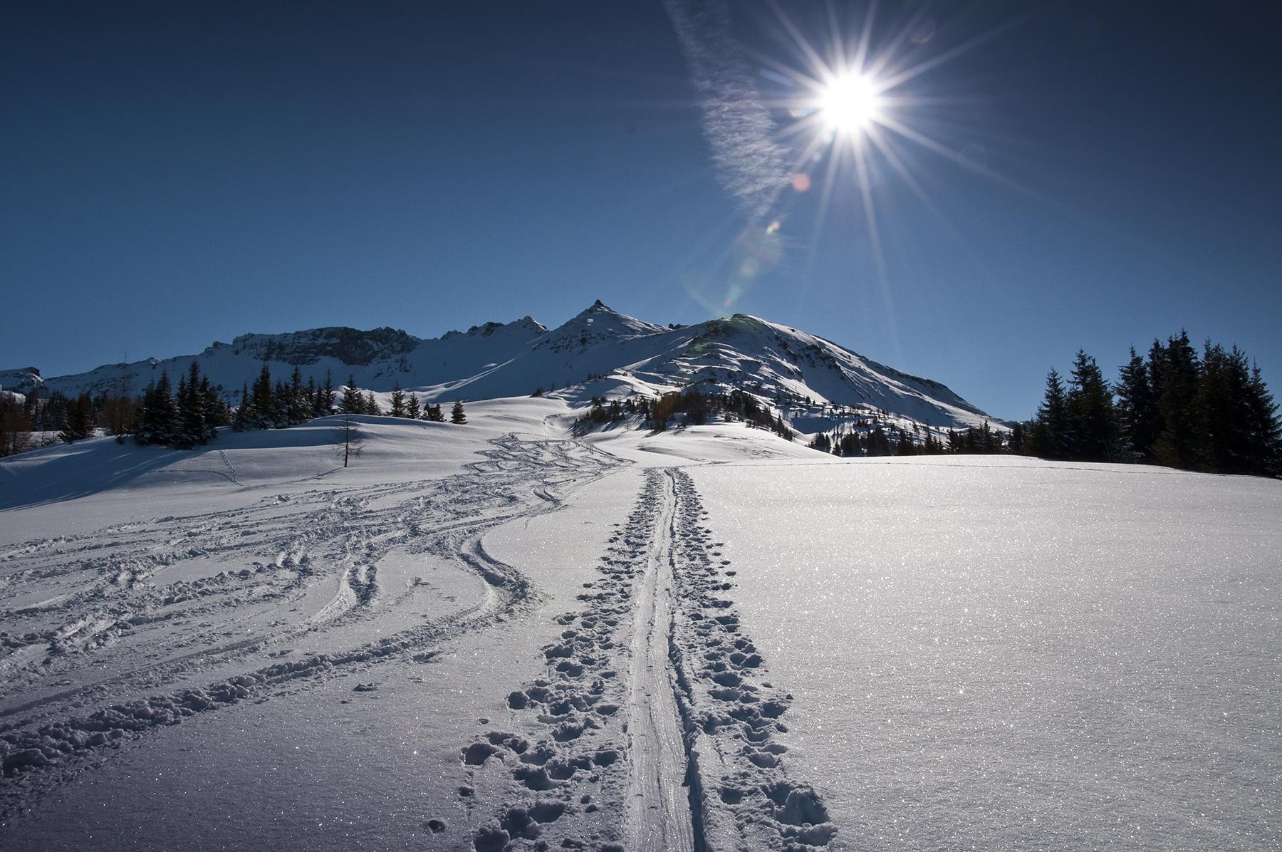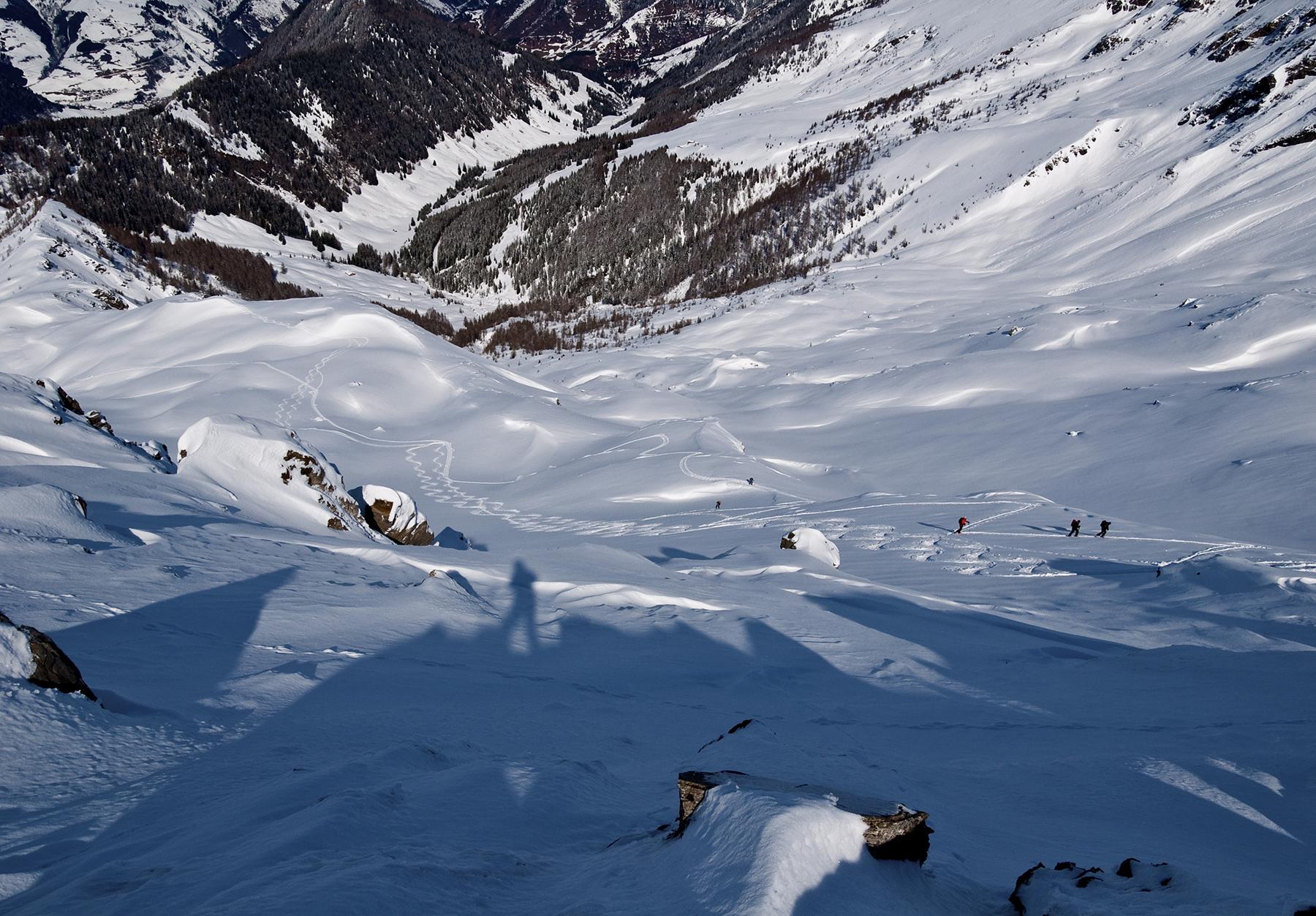 Auch im Rauriser Tal in Bucheben ist nicht viel Pulverschnee zu sehen, was sich dann beim Aufstieg bald ändert. Auf der harten Altschneedecke liegen ab ca 2000m Höhe bis zu 25 cm Pulverschnee, der keine Verbindung zur darunterliegenden harten Schicht hat.