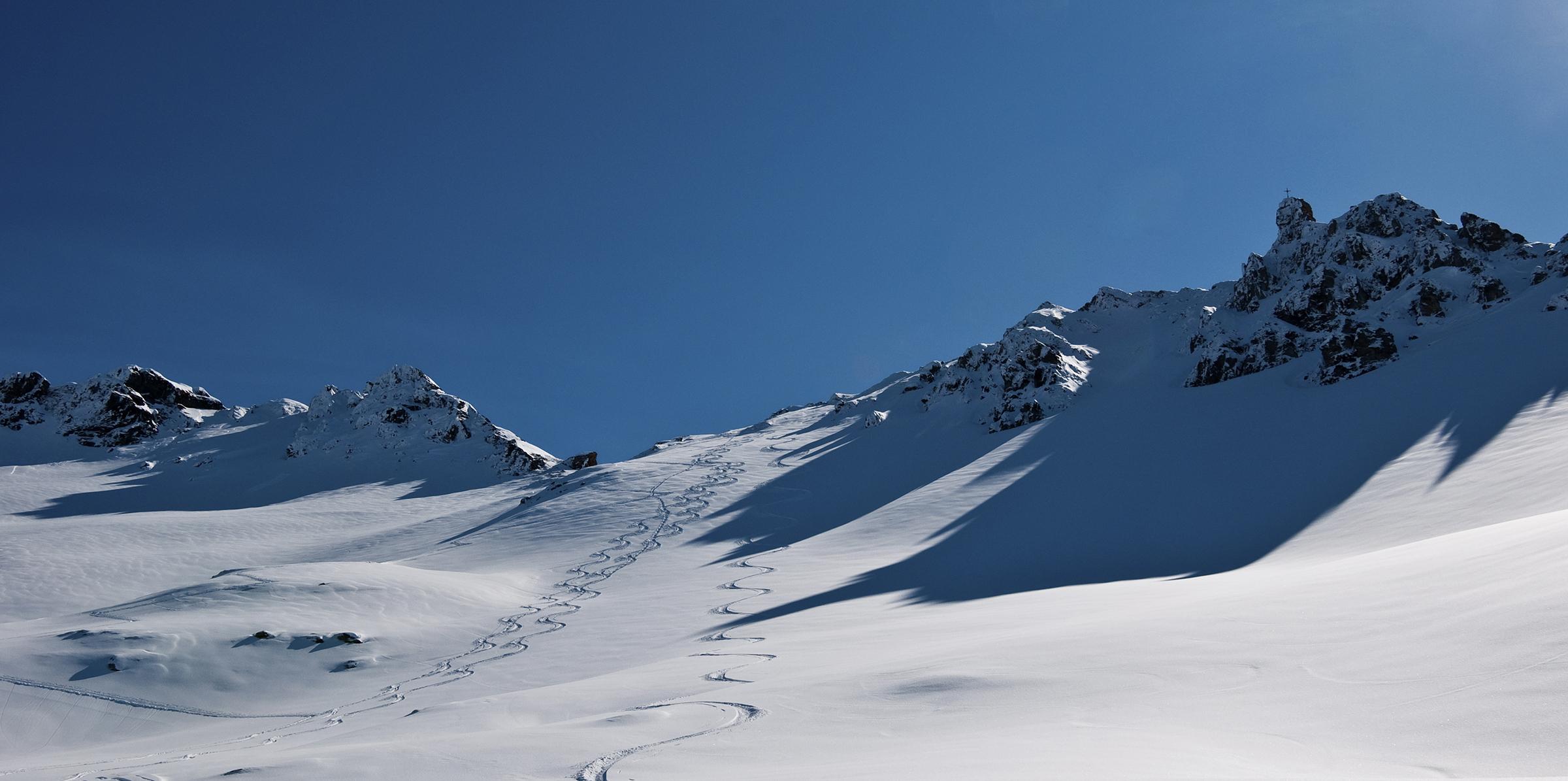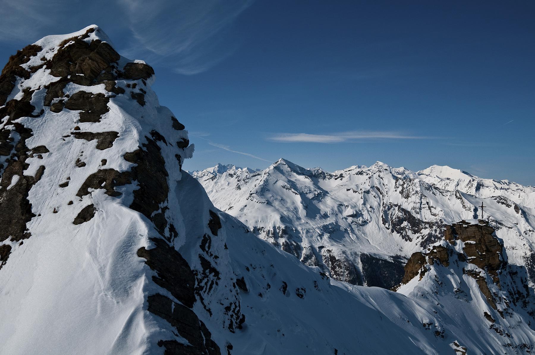 Die letzten 300 Höhenmeter geht man auf der Nordseite (hierhin auch von Wörth über die Flatscher Alm möglich) bis in die Scharte und zum Skidepot. Bei der Abfahrt rutscht der Pulver nur auf den obersten Höhenmetern unter der Scharte weg, danach ist wunderbares Schwingen möglich. Weiter unten dann zur Mittagszeit gerade richtig aufgefirnt.