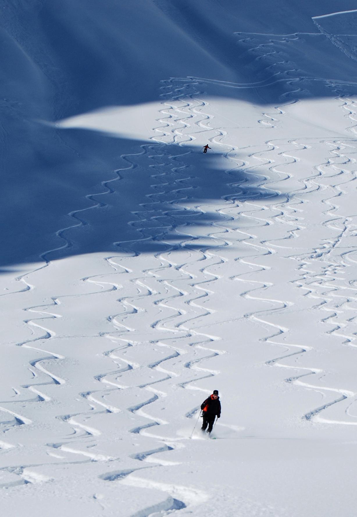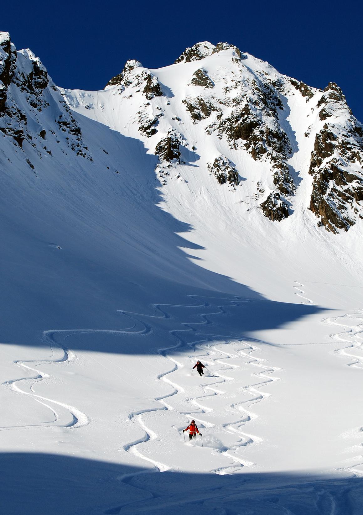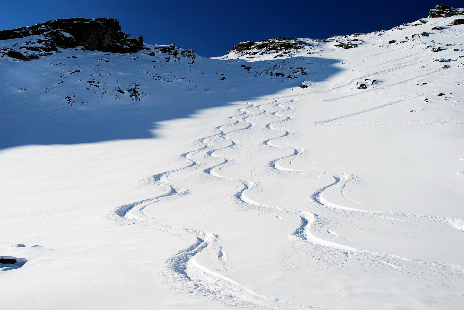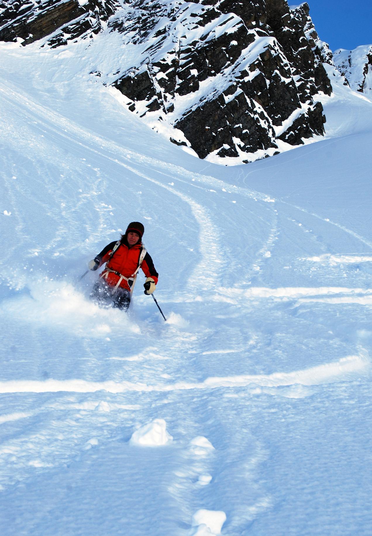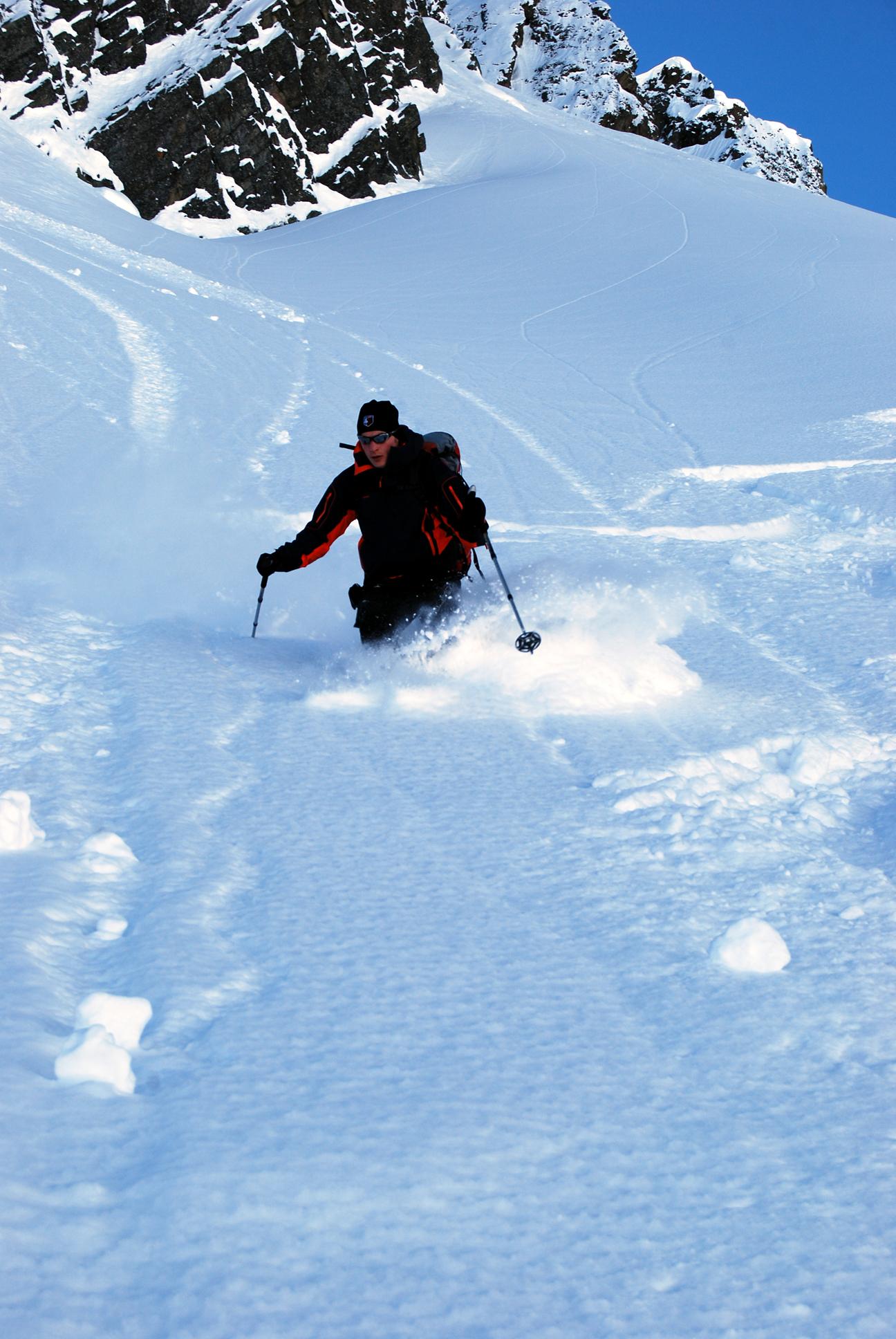 Die Schneeverhältnisse sind ideal. Bei etwas geschickter Abfahrt von oben bis unten traumhafter Pulver. Der Gipfelhang war teilweise vor dem letzten Neuschnee abgeweht. D.H. es waren ein paar gefährlich eingeschneite Felsen (Oan Stoa hat jeder erwischt). Danach war unter der 20-30cm Pulverauflage eine kompakte tragende Altschneedecke. Der letzte Neuschnee ist komplett ohne Windeinfluß gefallen. Die letzten Schwünge am Waldrand waren dann teilweise grundlos und oberschenkeltief.
