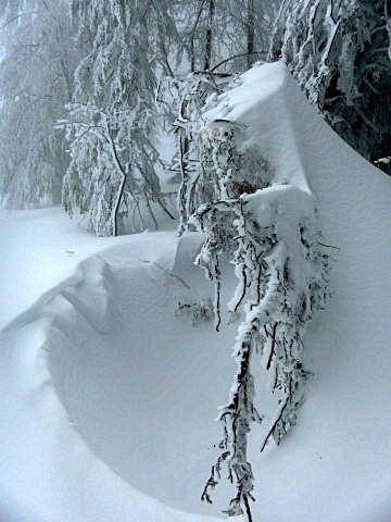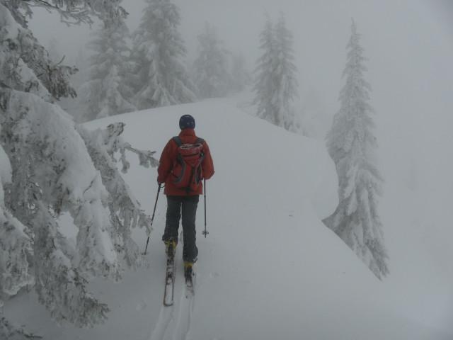 Anstieg über den SO-Rücken (Kallersberg), Abfahrt im Hochwald östlich der freien Almfläche. Stark eingeschränkte Sicht. Gewaltige dünenartige Verfrachtungen mit messerscharfen Graten schlängeln sich im Steilwald hinab. Schneemenu: dünne Graupelschicht an feuchtem gesetzten Neuschnee mit leichter Kruste, weiter unten tief durchnäßt - bon appetit.