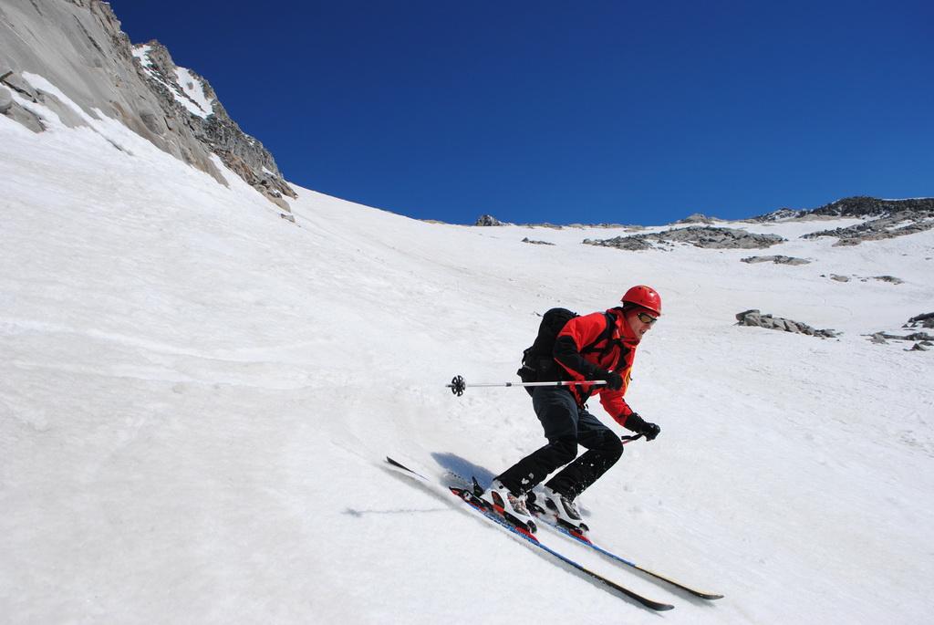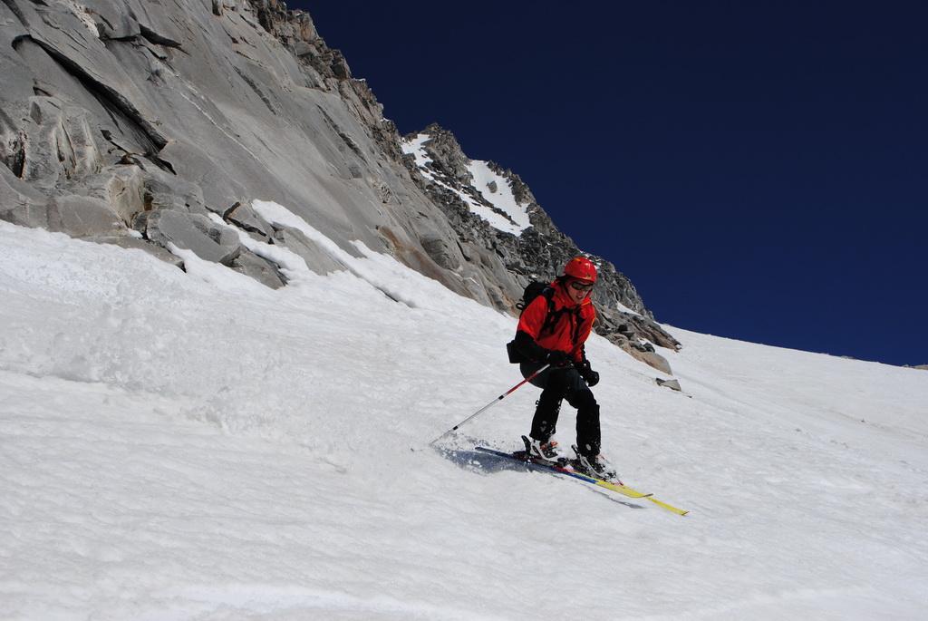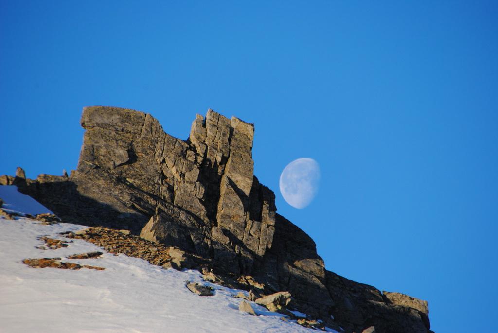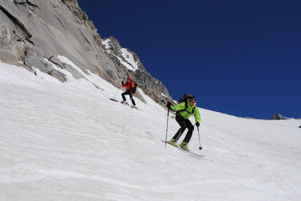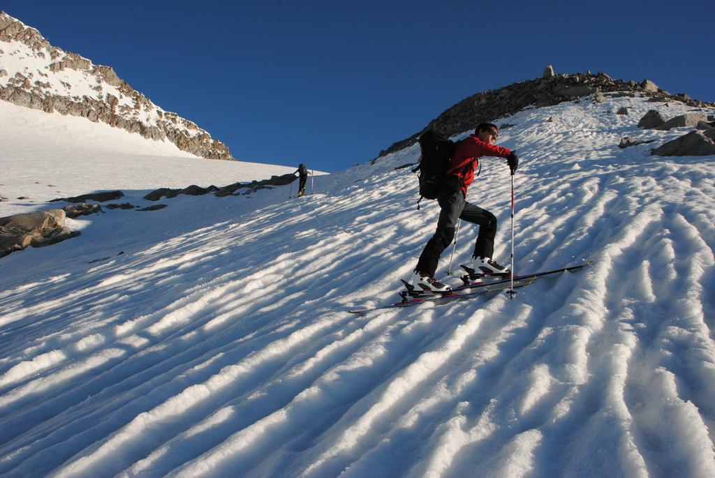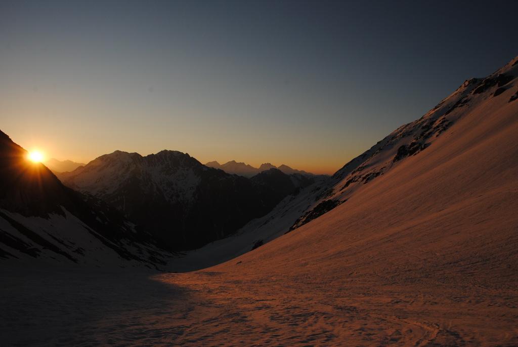 Zur Zeit herrschen immer noch optimale Verhältnisse im Gebiet um den Neveser Stausee (Strasse schneefrei und bis zum Stausee befahrbar). Um 3:00 Uhr machten wir uns heute auf den Weg nach Lapach und konnten knapp unterhalb der Eisbruggjochhütte einen genialen Sonnenaufgang erleben. Der Schnee war heute hart gefroren aber griffig und ohne Probleme ohne Harscheisen zu gehen. Da wir Zeit genug hatten sind wir zuerst die Schi schulternd über eine südseitige Flanke auf den Grat westlich vom Hohen Weisszint aufgestiegen und von dort dann über den schönen Blockgrat mit riesigen Granitblöcken zum hohen Weisszint hinüber gequert. Als Abfahrtsroute haben wir dann im oberen Abschnitt normalen Aufstiegsweg gewählt, welcher durch die nordseitige Ausrichtung noch relativ hart war. Weiter unten konnten wir dann in den südseitigen und ostseitigen Hängen perfekten Firn geniessen. Heute war die Abfahrt noch ohne Unterbrechung bis zur Staumauer machbar, was sich in den nächsten Tagen wahrscheinlich bald ändern wird.