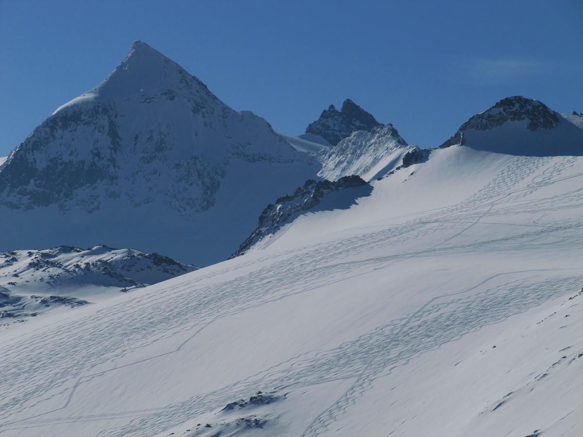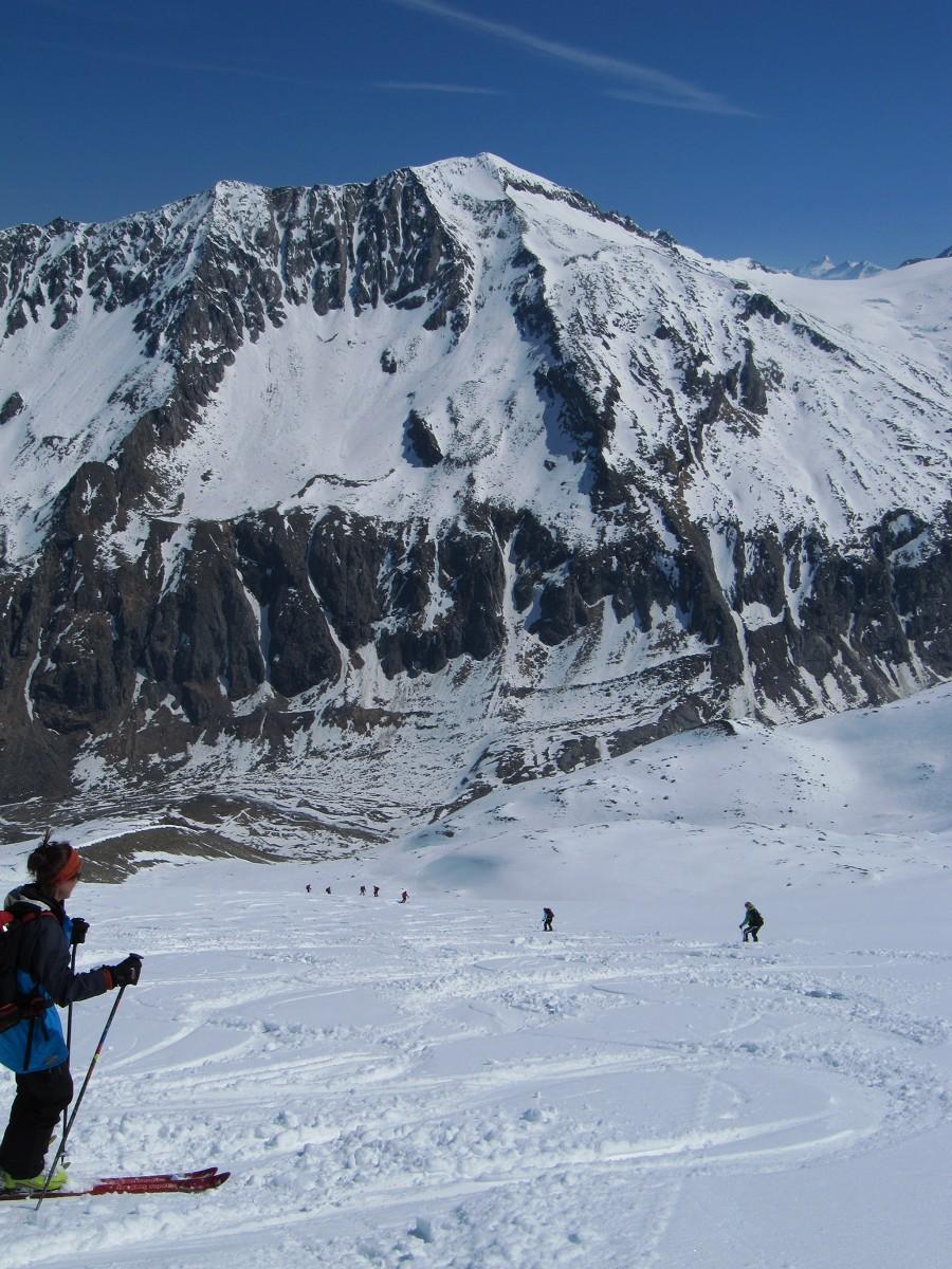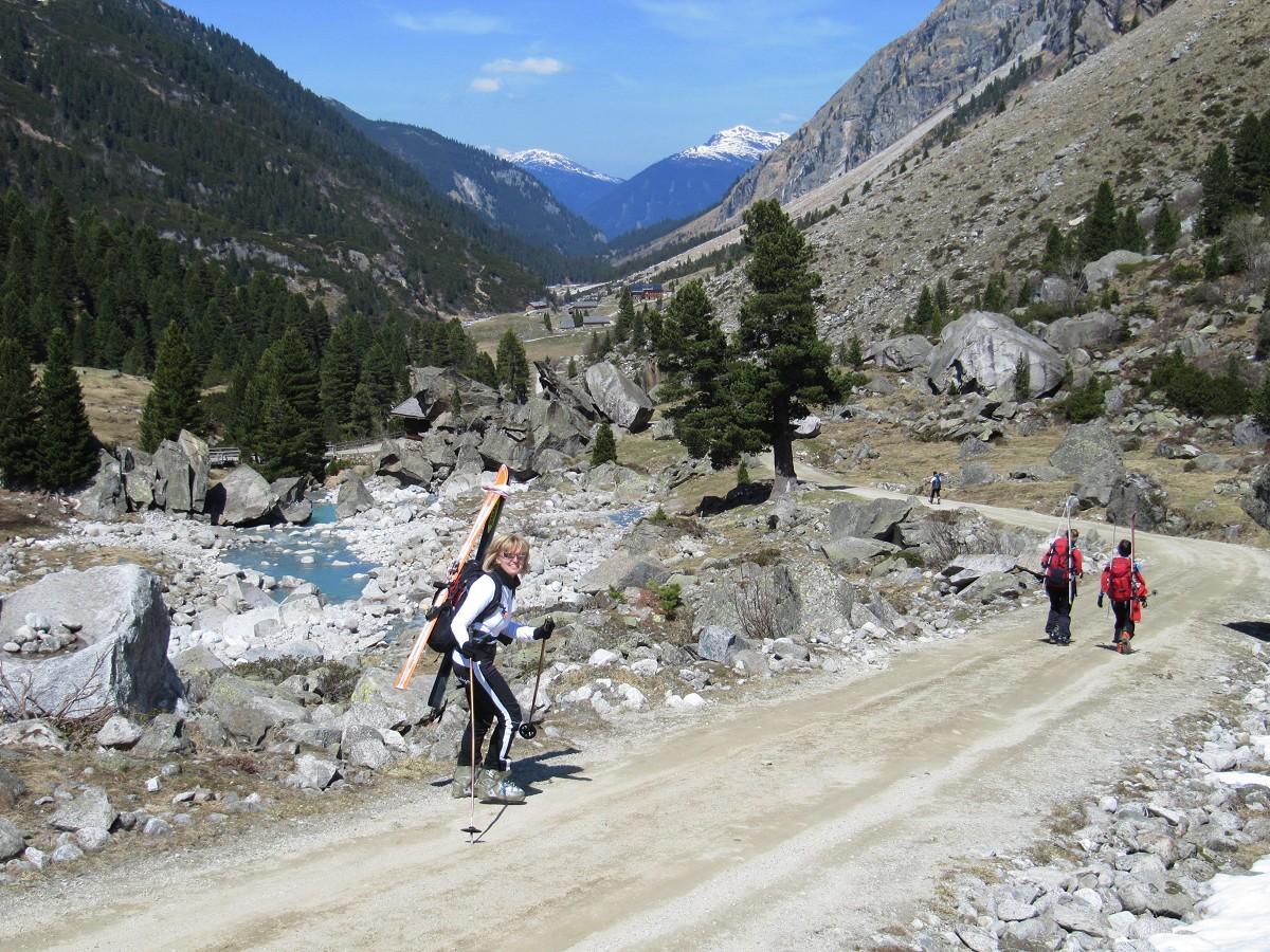 Heute bewies Zenzi wieder ihre Spürnase für exzellente Tourenverhältnisse und führte die Mittwochsgruppe statt auf die Lungauer Karspitze auf die Schlieferspitze, 3288m. Auffahrt vom PP 11 km mit Kleinbus des Postalmwirts um 6 Uhr bis 1900 m. Über die Brücke und gleich die Ski angeschnallt. Auf festem Harschdeckel wunderbar zu gehen. Trotz schweißtreibender Temperatur beste Schneeverhältnisse. Luftiger Übergang vom Skidepot zum Gipfelkreuz an einer Stelle etwas eisig, bequemer wärs mit Steigeisen.