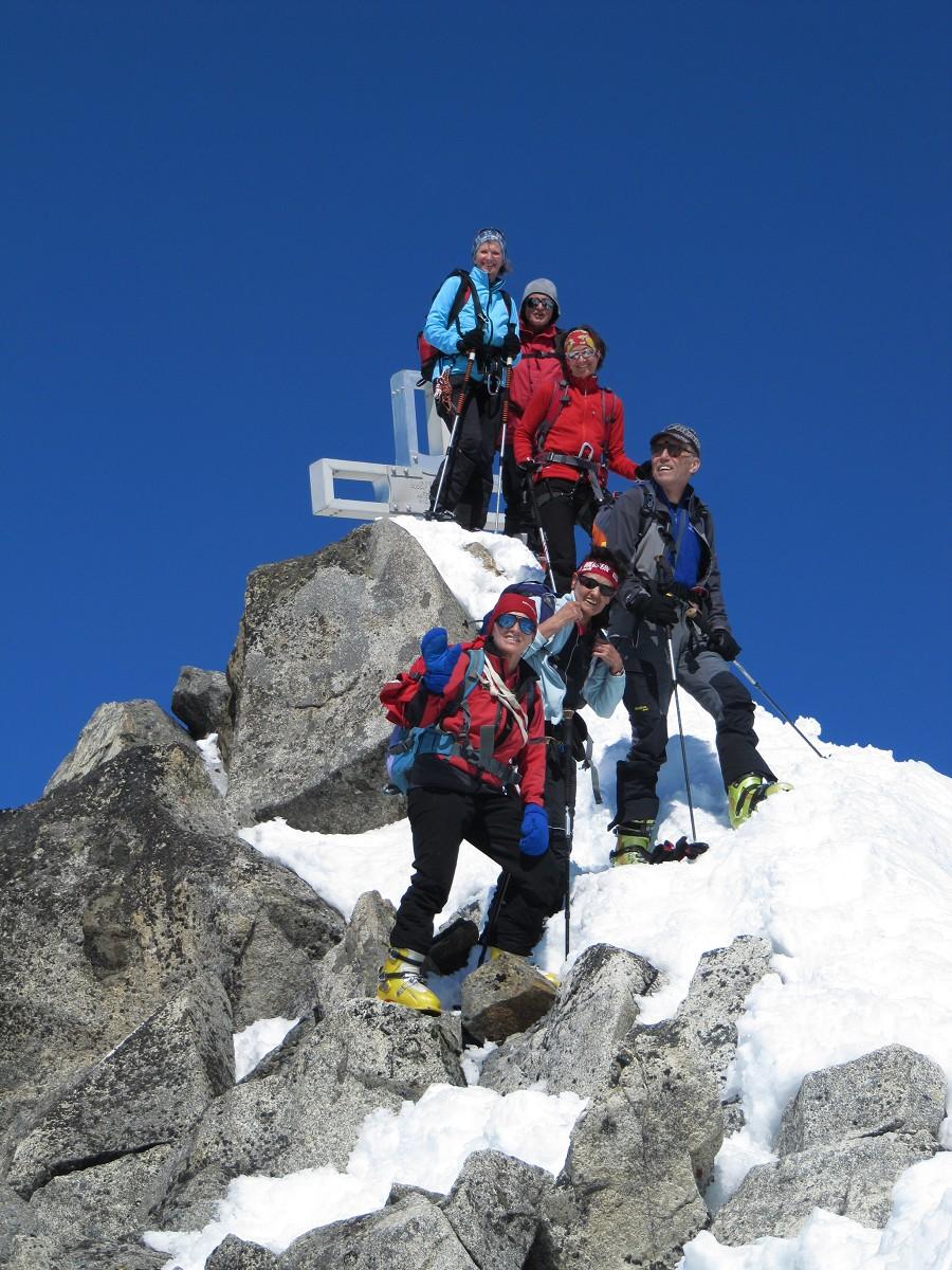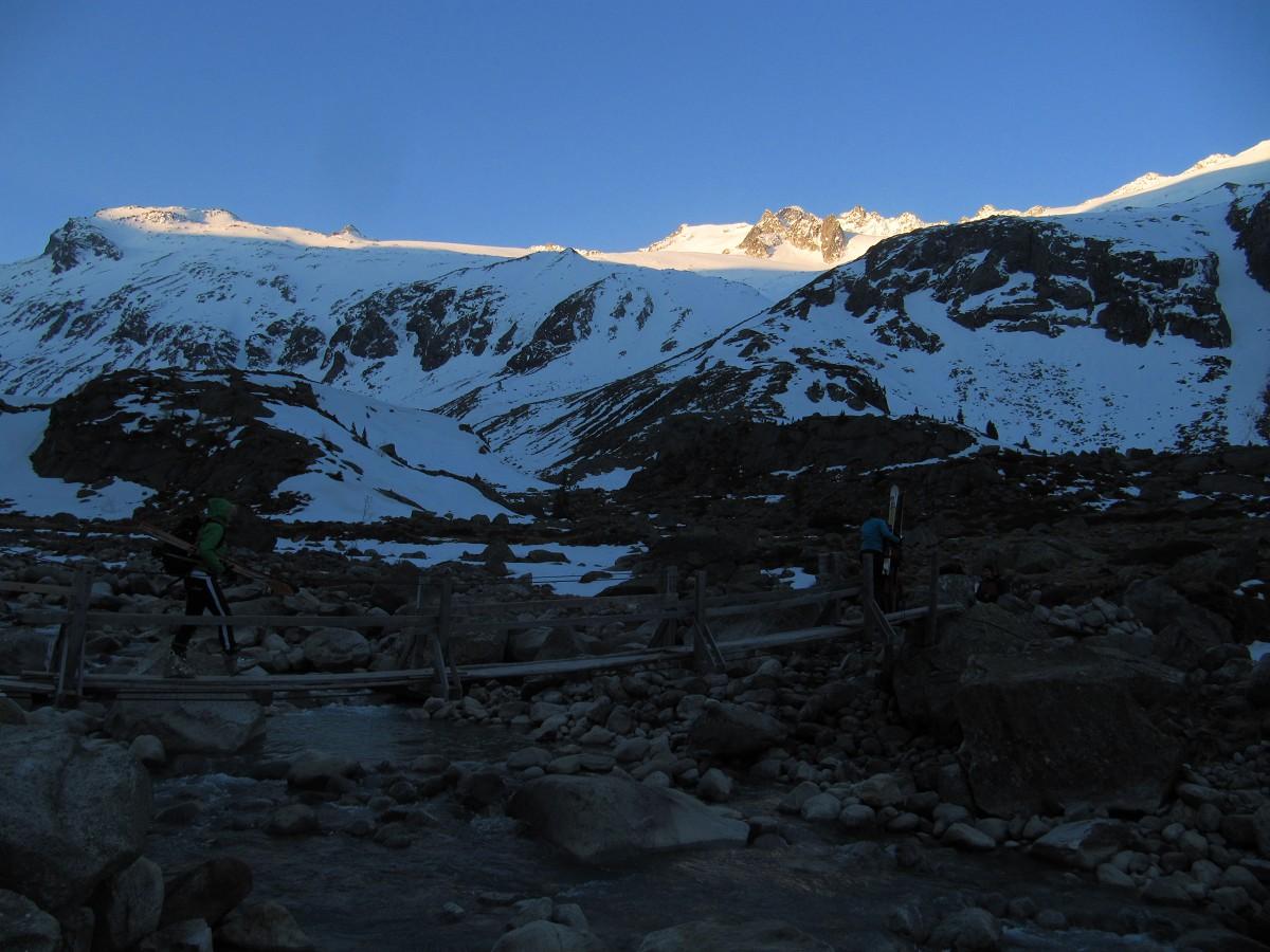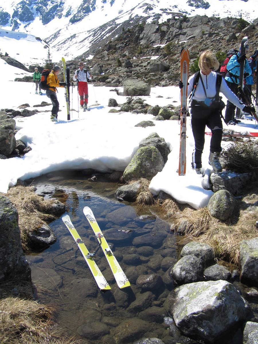 Heute bewies Zenzi wieder ihre Spürnase für exzellente Tourenverhältnisse und führte die Mittwochsgruppe statt auf die Lungauer Karspitze auf die Schlieferspitze, 3288m. Auffahrt vom PP 11 km mit Kleinbus des Postalmwirts um 6 Uhr bis 1900 m. Über die Brücke und gleich die Ski angeschnallt. Auf festem Harschdeckel wunderbar zu gehen. Trotz schweißtreibender Temperatur beste Schneeverhältnisse. Luftiger Übergang vom Skidepot zum Gipfelkreuz an einer Stelle etwas eisig, bequemer wärs mit Steigeisen.