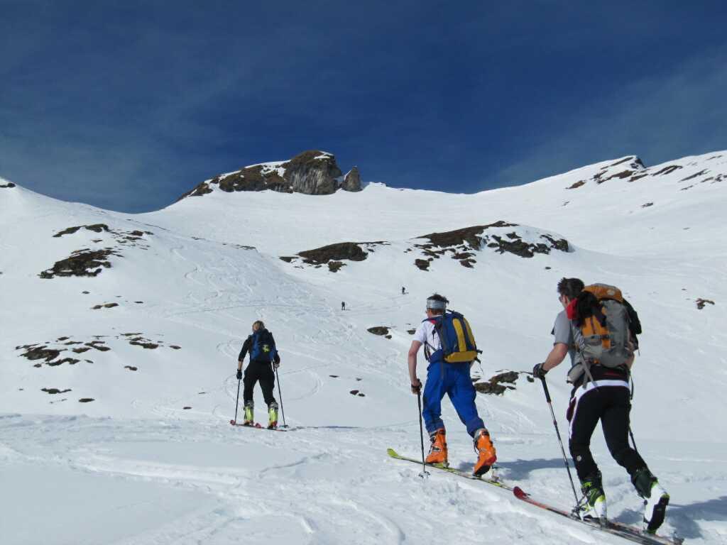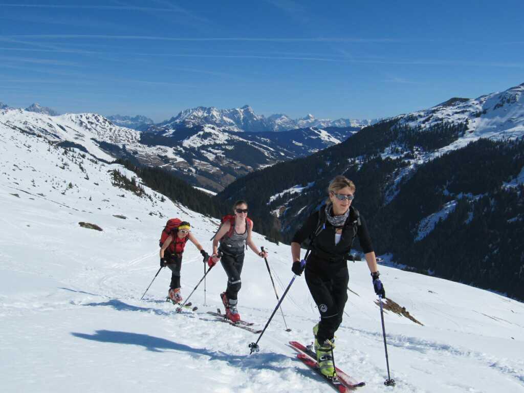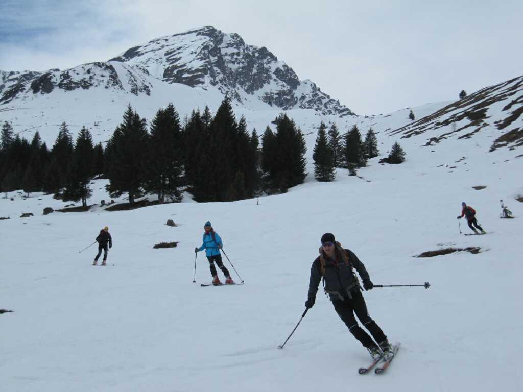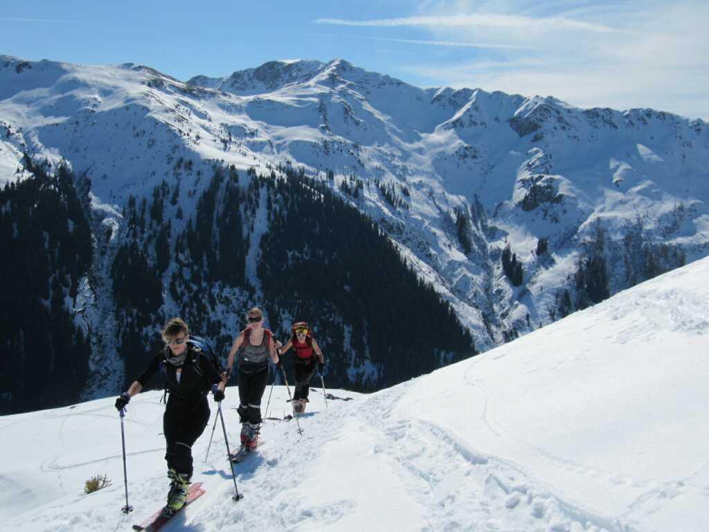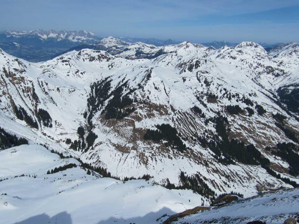 Von Hinterglemm/Lengau (1150) stiegen wir über die Saalhofalm hinauf zum Schusterkogel (2207). Während die Sonnseiten von Staff- u. Saalkogel schon bis ca. 1600m stark aper sind, konnten wir noch vom Parkplatz mit Skiern starten.Schneeverhältnisse: Im Aufstieg meist gefrorener, tragender Harsch, Abfahrt (ca. 12:00) bei wechselndem Schnee: von Papp- über Sulz bis Firn, schattseitig stellenweise noch etwas Pulver. Insgesamt ganz brauchbare Abfahrtsbedingungen, keine Steinkontakte.