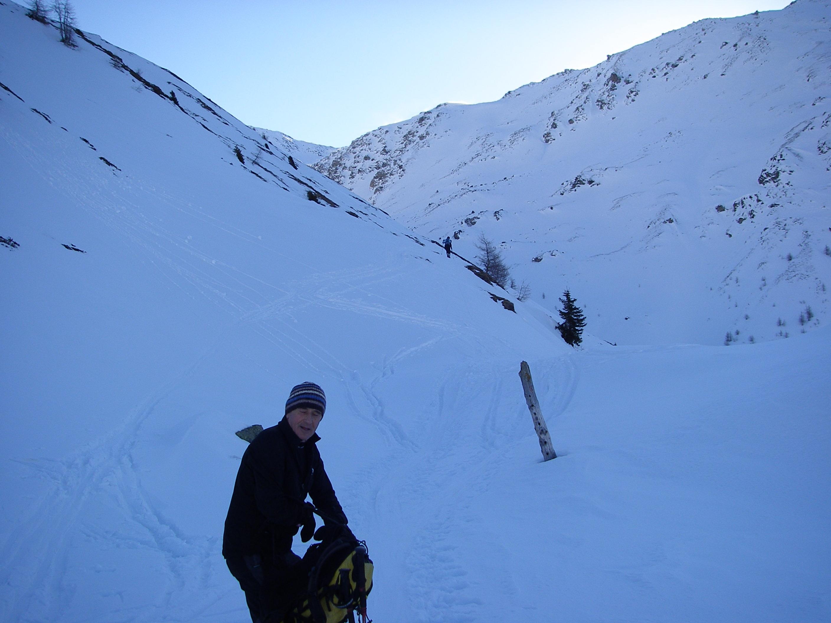 Zuerst ging es einen Almweg zu den ersten Almhütten. Da wir einige steile Hänge queren mussten, war es notwendig die Harscheisen zu benutzen.