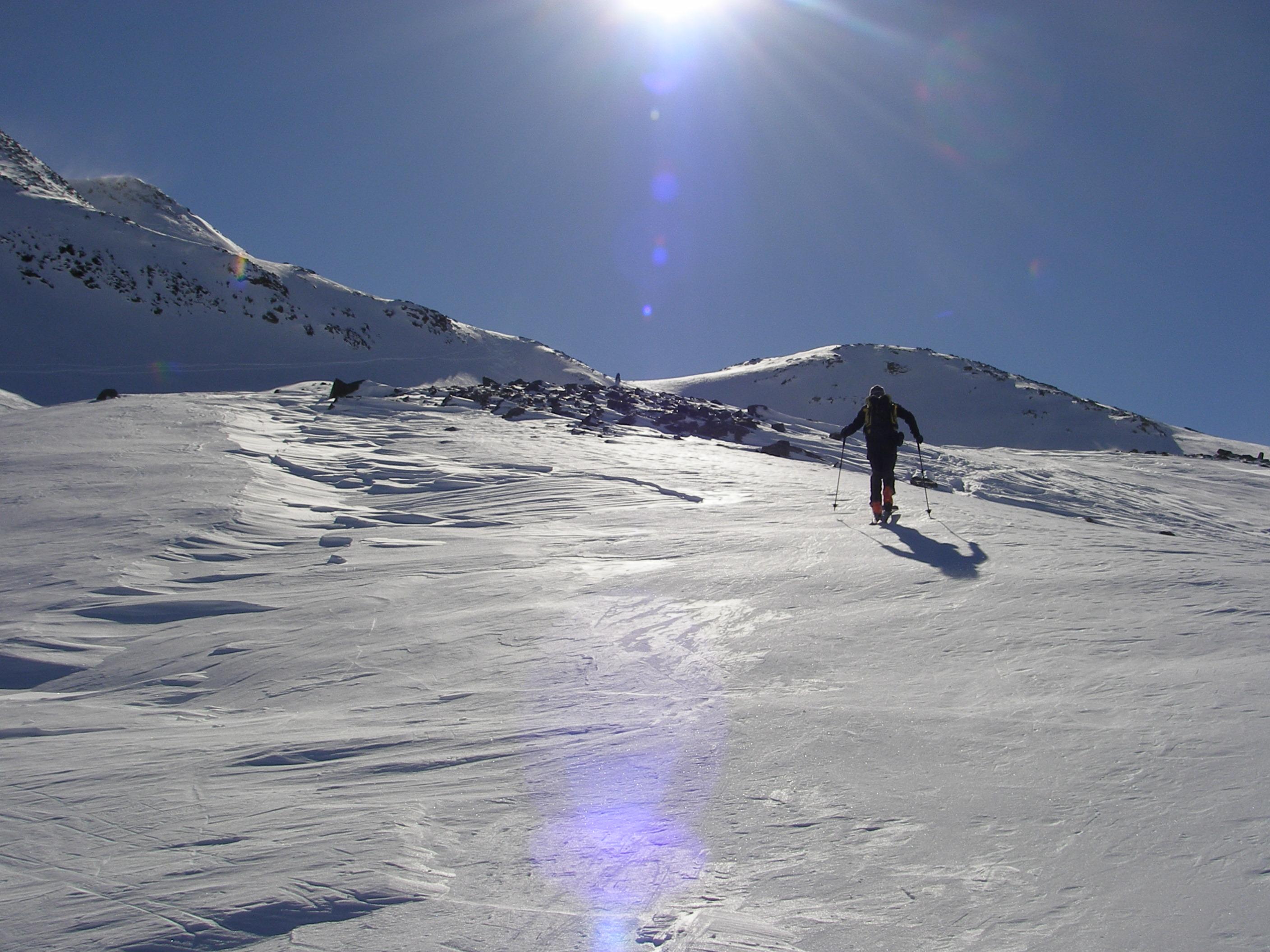 Lebhafte Windboen begleiteten uns bis zum Gipfel. An den freien Flächen gab es windgepressten Schnee.