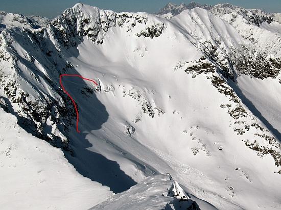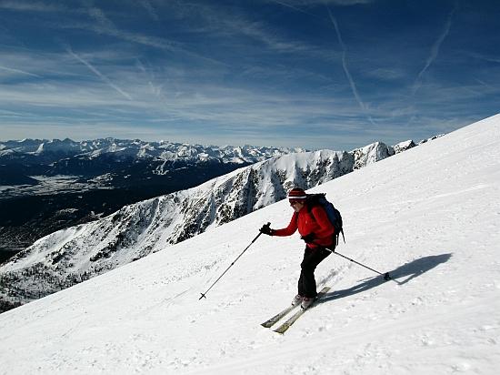 Es ist aber wegen des relativ hohen Ausgangspunktes (Ludlalm – 1.530m) und des Schlittenweges im unteren Bereich eine Abfahrt bis zum Ausgangspunkt möglich. Die lange Gipfelflanke war wunderbar zu fahren, hier hatten wir Firnverhältnisse und Temperaturen wie im März.