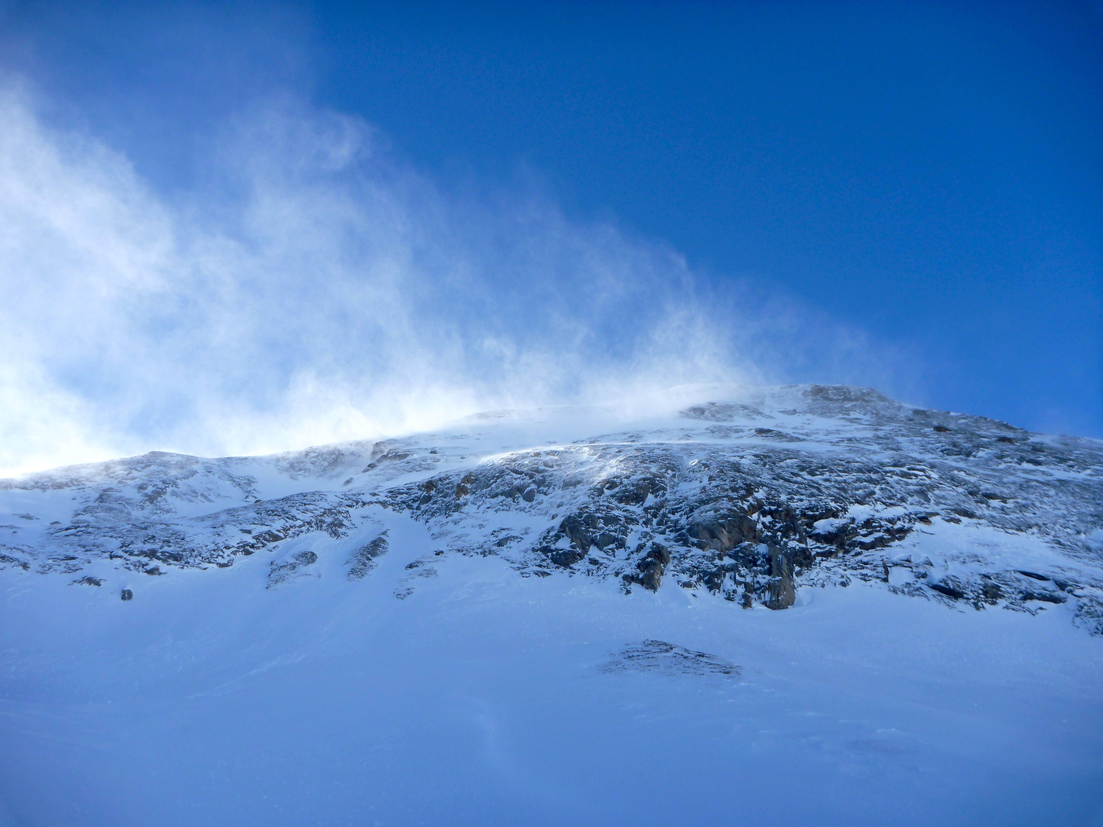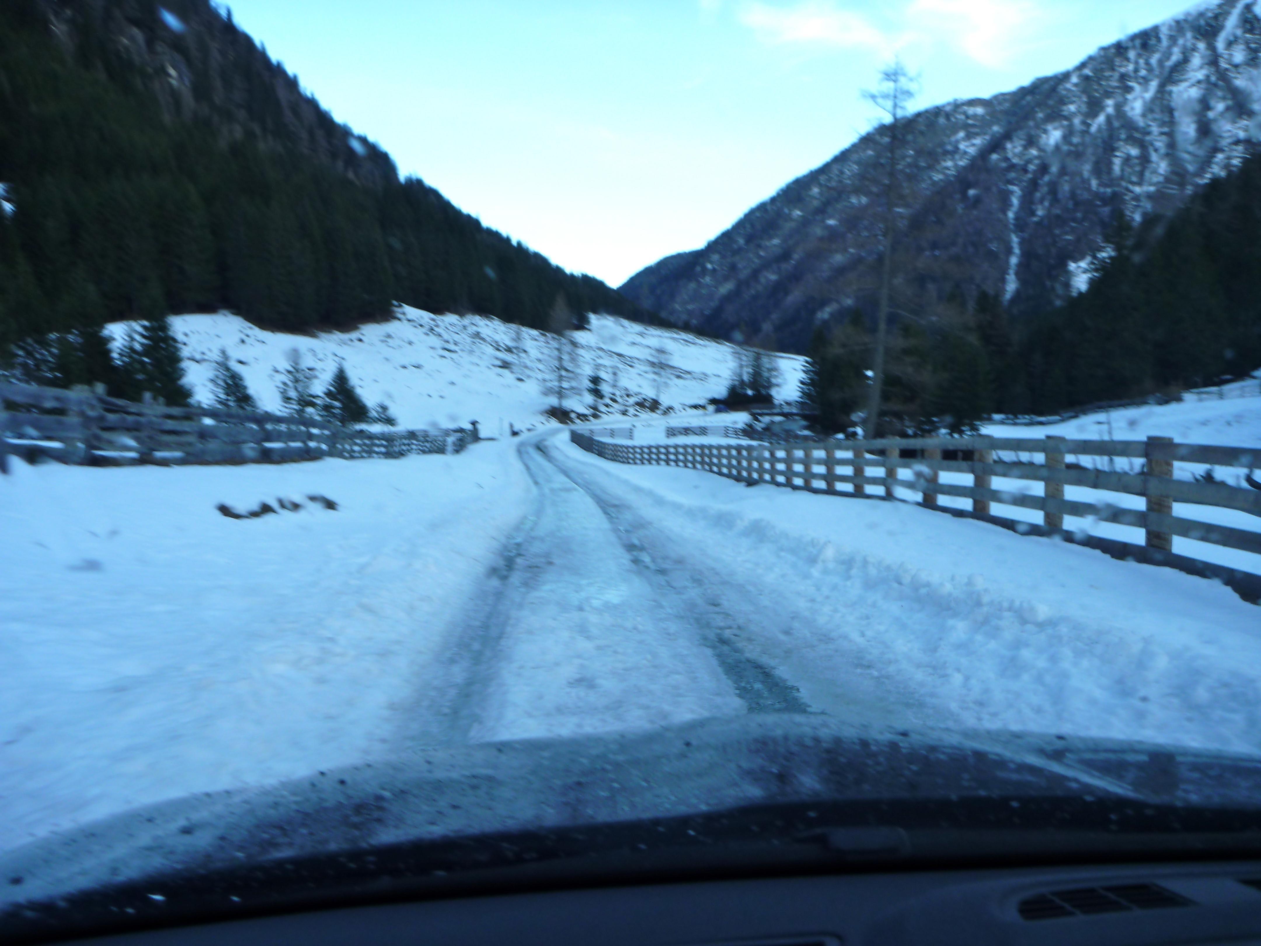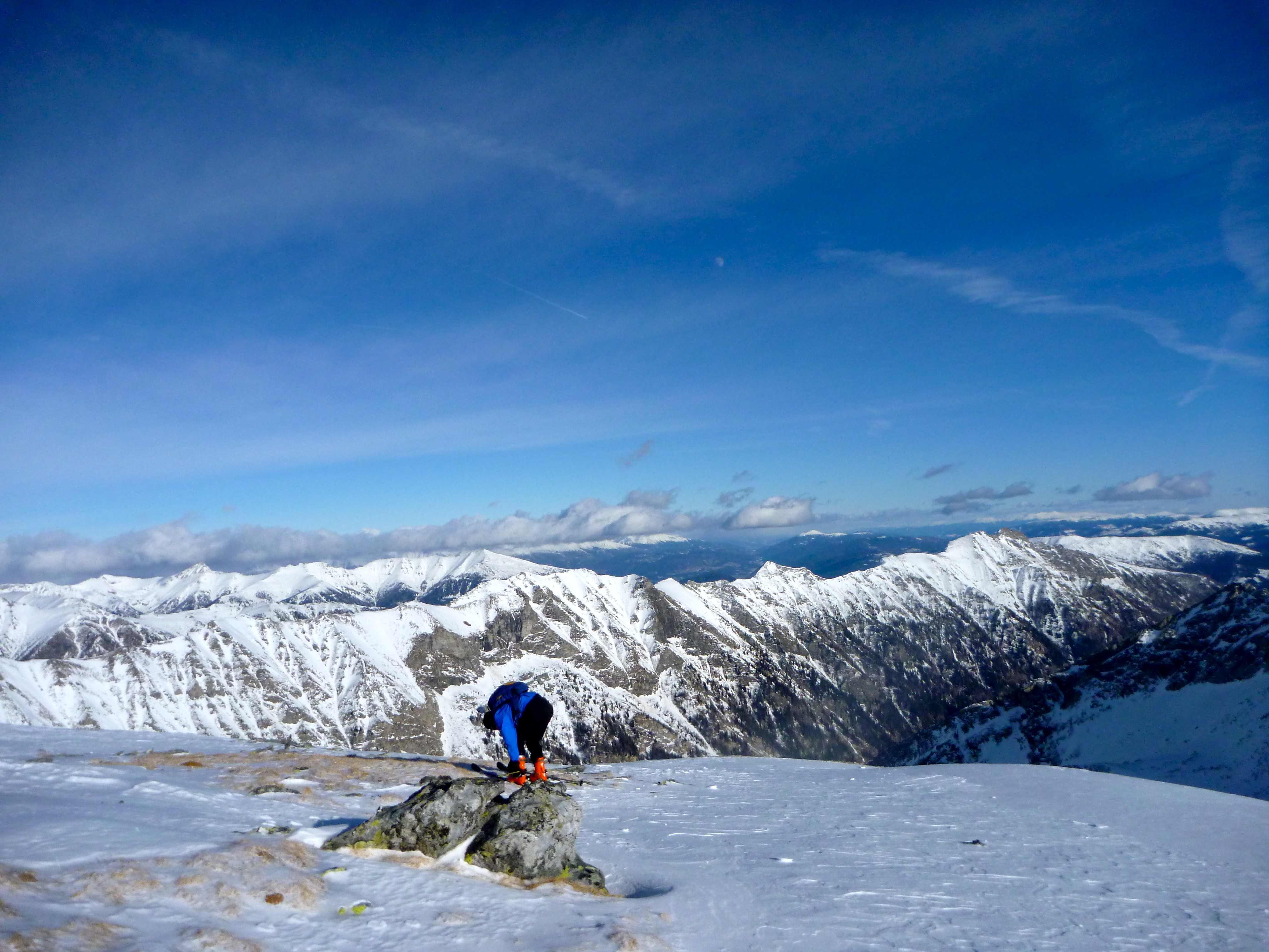 Da der Wetterbericht für heute warmes und im Hochgebirge stürmisches Wetter vorhergesagt hatte, waren wir der Meinung, dass das Pöllatal auf Grund der schattigen und windgeschützten Lage ideale Tourenbedingungen bieten würde. Das anvisierte Ziel war der Waschgang, es wurde aber der Ochsenkopf: Die Zufahrt war bereits die größte Herausforderung des Tages, da komplett vereist. Es folgten dann ein endloslanger Hatscher bei Gegenwind aus Westen mit geschätzten 60km/h über eine Forststraße und ein Aufschwung mit Harscheisen über einen mit Latschen durchsetzten Steilhang. Das Lieserkar bot dann eine durch Wind, Regen und Frost veredelte Schneedecke bis auf etwa 2500m Höhe, der Gipfelhang windgepressten Pulver. Der Sturm verstärkte sich auf etwa 100km/h von verschiedensten Richtungen. Die Abfahrt war ok, aber von ideal auch noch weit weg.