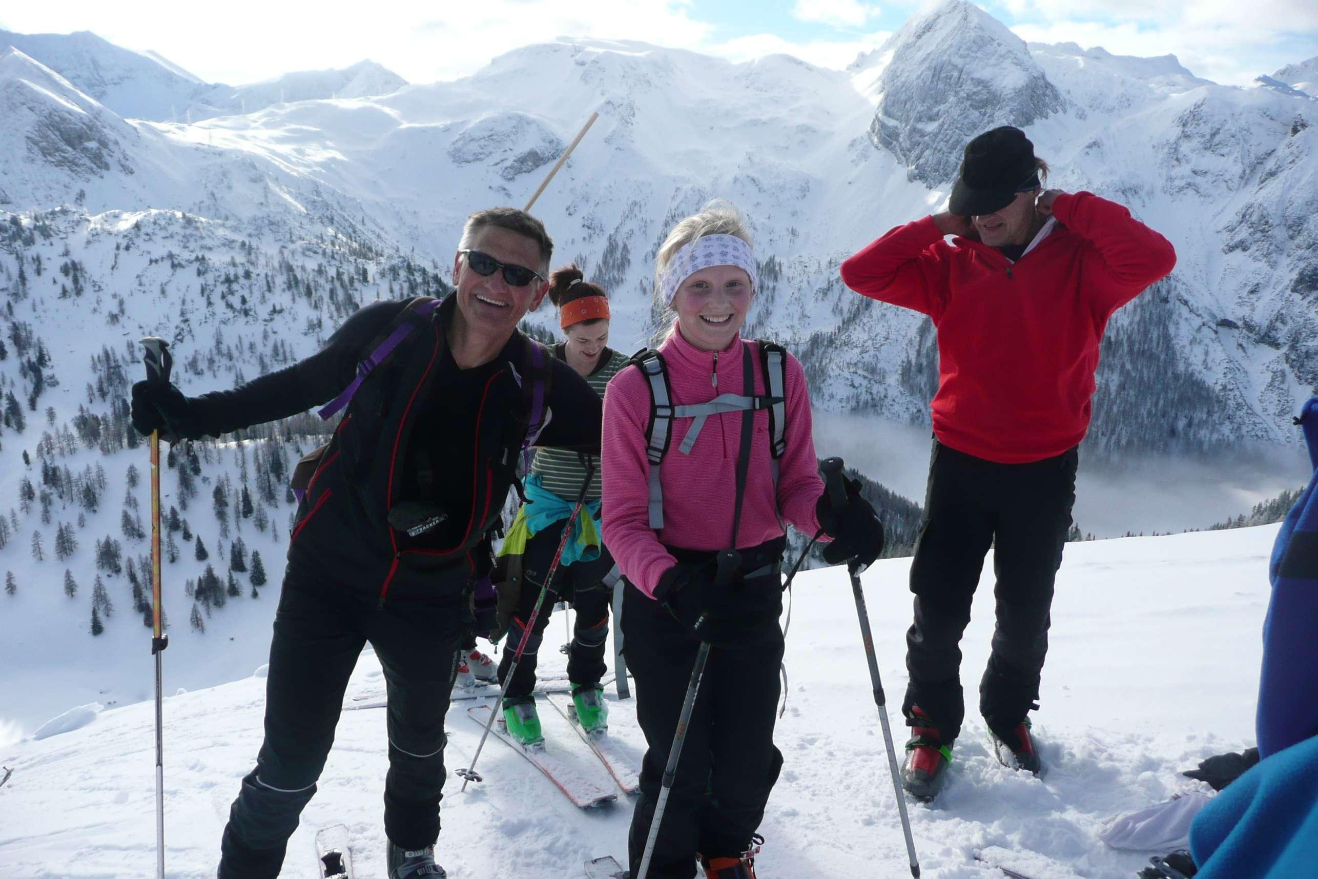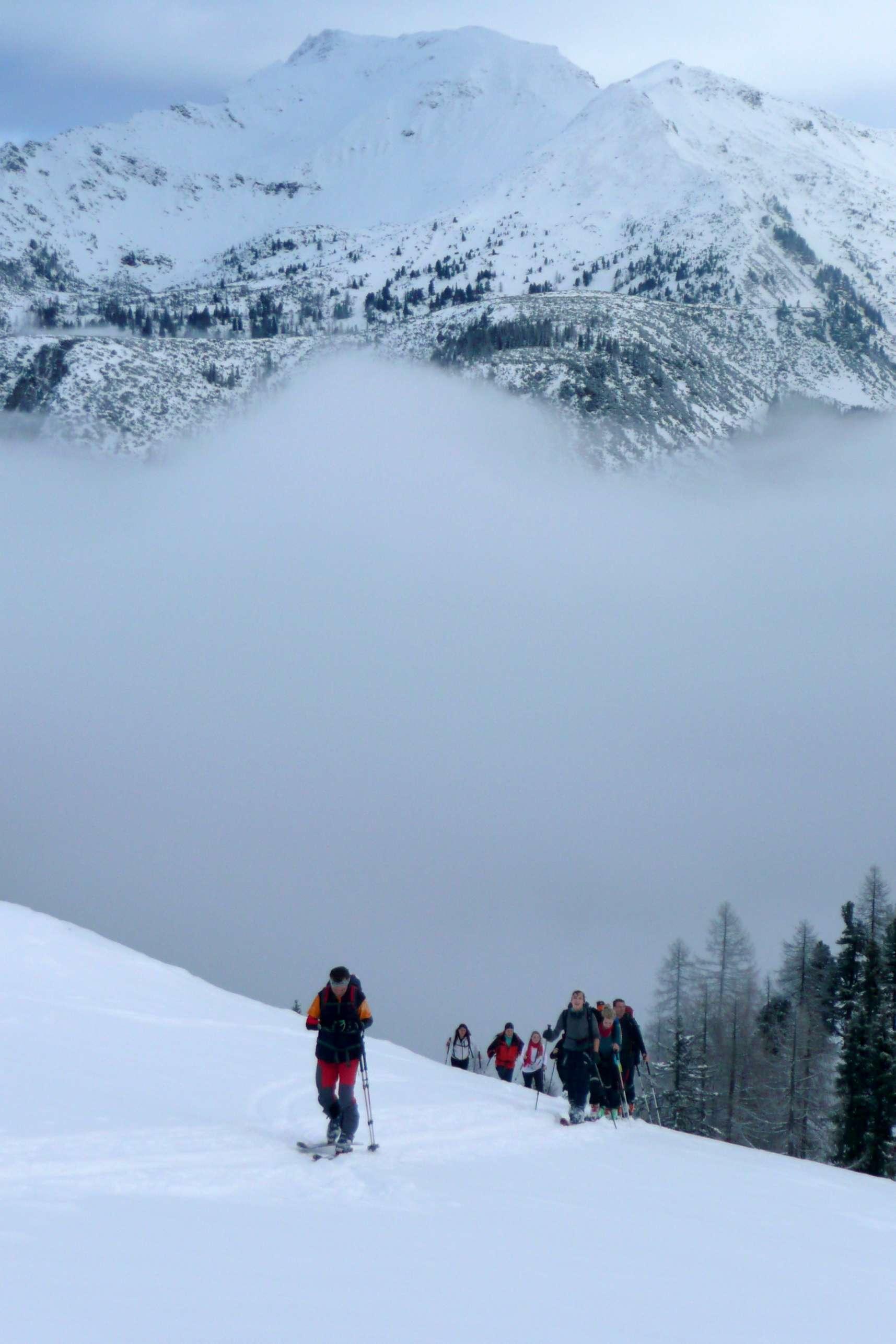 Traditionelle Jahresabschluss-Tour, die perfekt dem Motto "Fun & Family" entspricht. Perfekt heute auch Wetter, Schneebedingungen und - was Wunder - natürlich auch die Stimmung allerseits ... Gemütliche Anstiegsspur von der Gnadenalm in Richtung Südwiener Hütte. Ausreichende Grundlage, auch wenn noch nicht alle Latschen eingeschneit sind, gut tragender Harsch mit schöner Pulver-Auflage. Der Talnebel hielt sich hartnäckig unterhalb ca. 1500 m, darüber ab dem späten Vormittag ein brillanter und windstiller Wintertag!