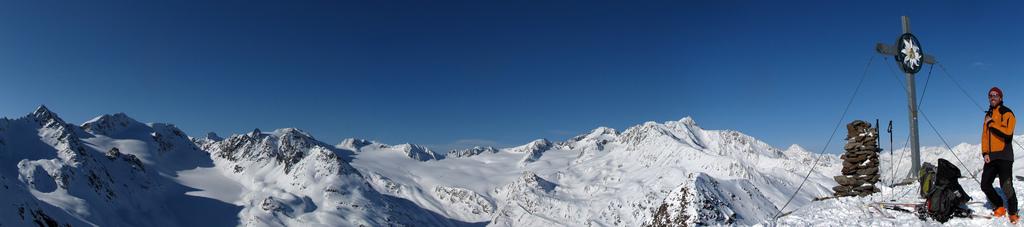 Wir waren zu dritt am 2.4. Auf der Finaeilspitze vom Hochjochhospiz aus. Auf die letzten 10 Meter verzichteten wir wegen des scharfen und ausgesetzten Schneegrats. Anschließend noch auf den Hauslabkogel über die NW-Flanke. Zurück zum Hochjochhospiz und noch auf die Mittl. Guslarspitze.
