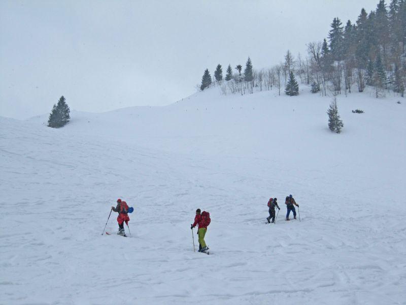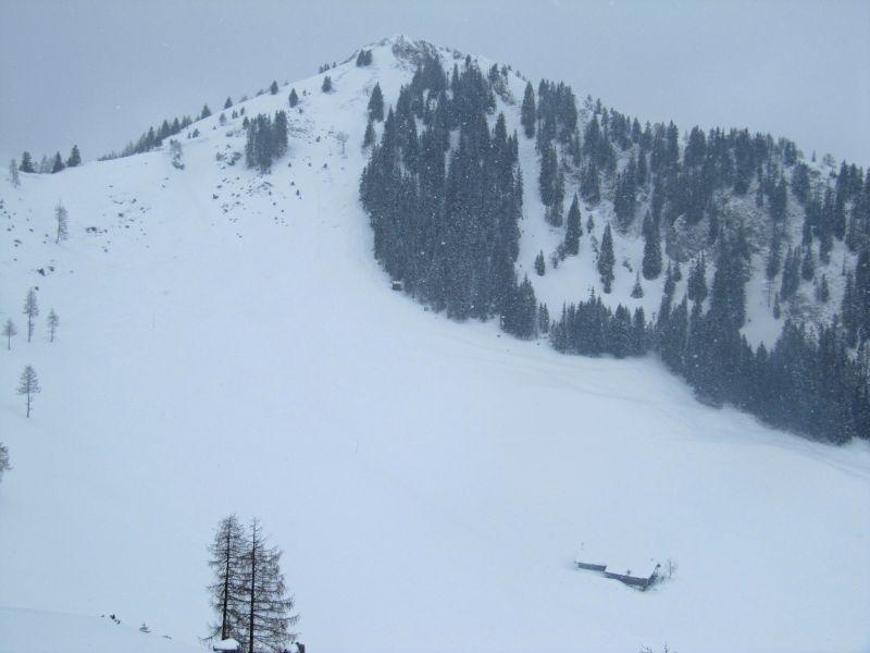 Heute bei bedecktem Himmel und zeitweise leichtem Fuseln von Walchsee/Bichl (680) auf den Heuberg (1603). Noch im gesamten Abfahrtsbereich ausreichend Schnee. Die Pulverauflage stieg von wenigen Millimetern am Start bis auf ca. 10-15cm, Unterlage Harschschneedecke, die oben vor allem schattseitig nicht immer tragfähig war. Direkt unterm Gipfel auf der S-Seite im Steilhang war in den letzten Tagen die Pulverauflage als lockeres Schneebrett abgerutscht.Nur am Gipfelrücken etwas W-Wind, sonst windstill.