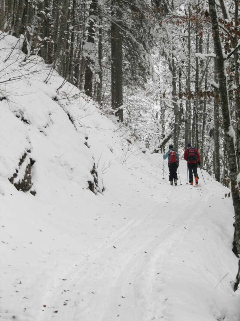 Die Abfahrt zur Dürrnbachalm ging erstaunlich gut (ohne Feindkontakte), auch der Waldweg bis ca. 1100m war gut fahrbar. Die restliche Abfahrt erfolgte auf der gewalzten Fahrstrasse hinunter nach Seegatterl ohne Probleme. Fazit: Trotz der geringen Schneehöhen gute Bedingungen.