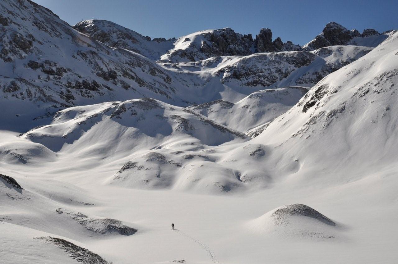 Von den gestrigen hochwinterlichen Verhältnissen (Schneehöhen bis 130cm) sowie vom stabilen Schönwetter ermutigt, wagten wir eine ausgedehnte Rundtour vom Hunerkogel über Koppenkar, Landfriedtal, Gruberscharte bis zum Feisterer. Wir wurden nicht enttäuscht und erlebten bei umsichtiger Spurwahl traumhafte und vor allem sichere Verhältnisse entlang unserer Route.