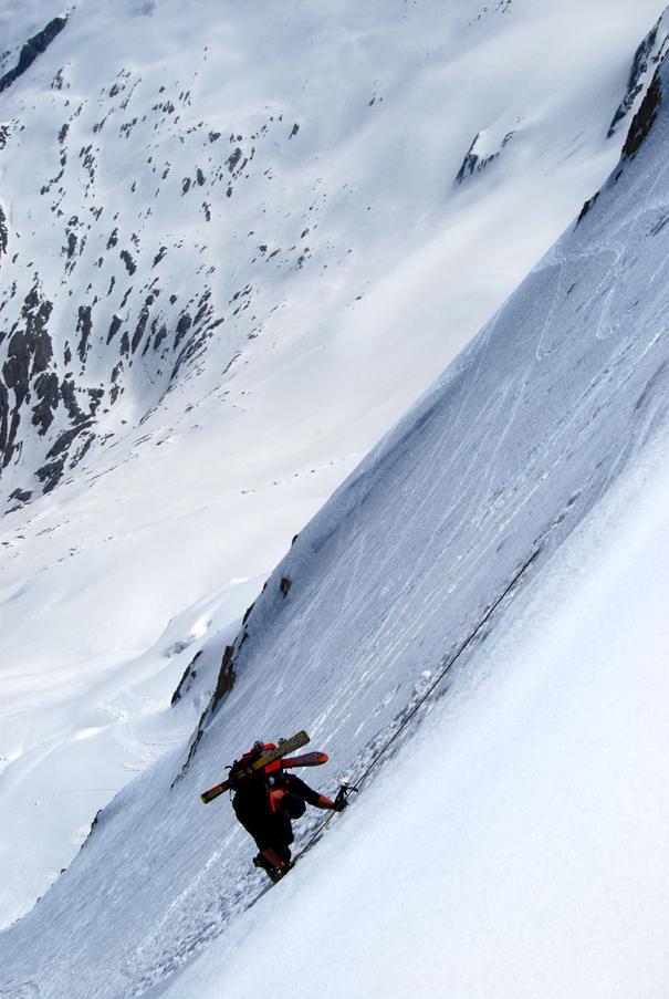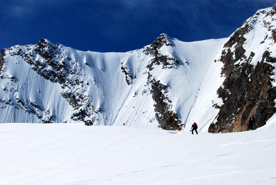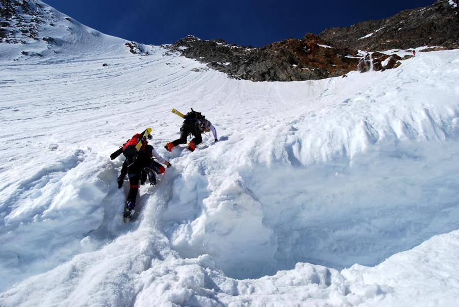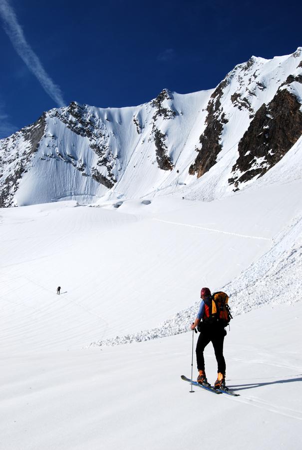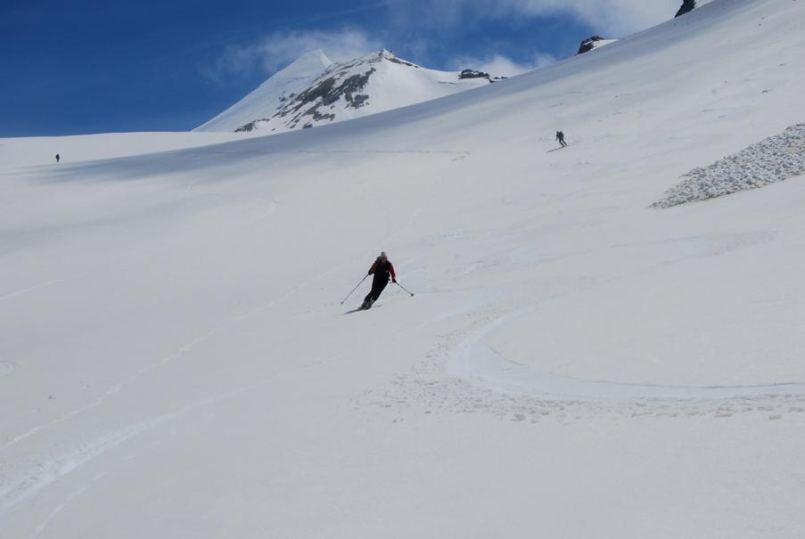 Die Verhältnisse sind immer noch gleich, lediglich die letzten Meter kommt das Eis jetzt durch. Die Abfahrtsverhältnisse waren sehr gut oben Firn, danach gut gesetzter Sommerschnee. Nur der Gegenanstieg hat zum Schluß keinem mehr spaß gemacht.