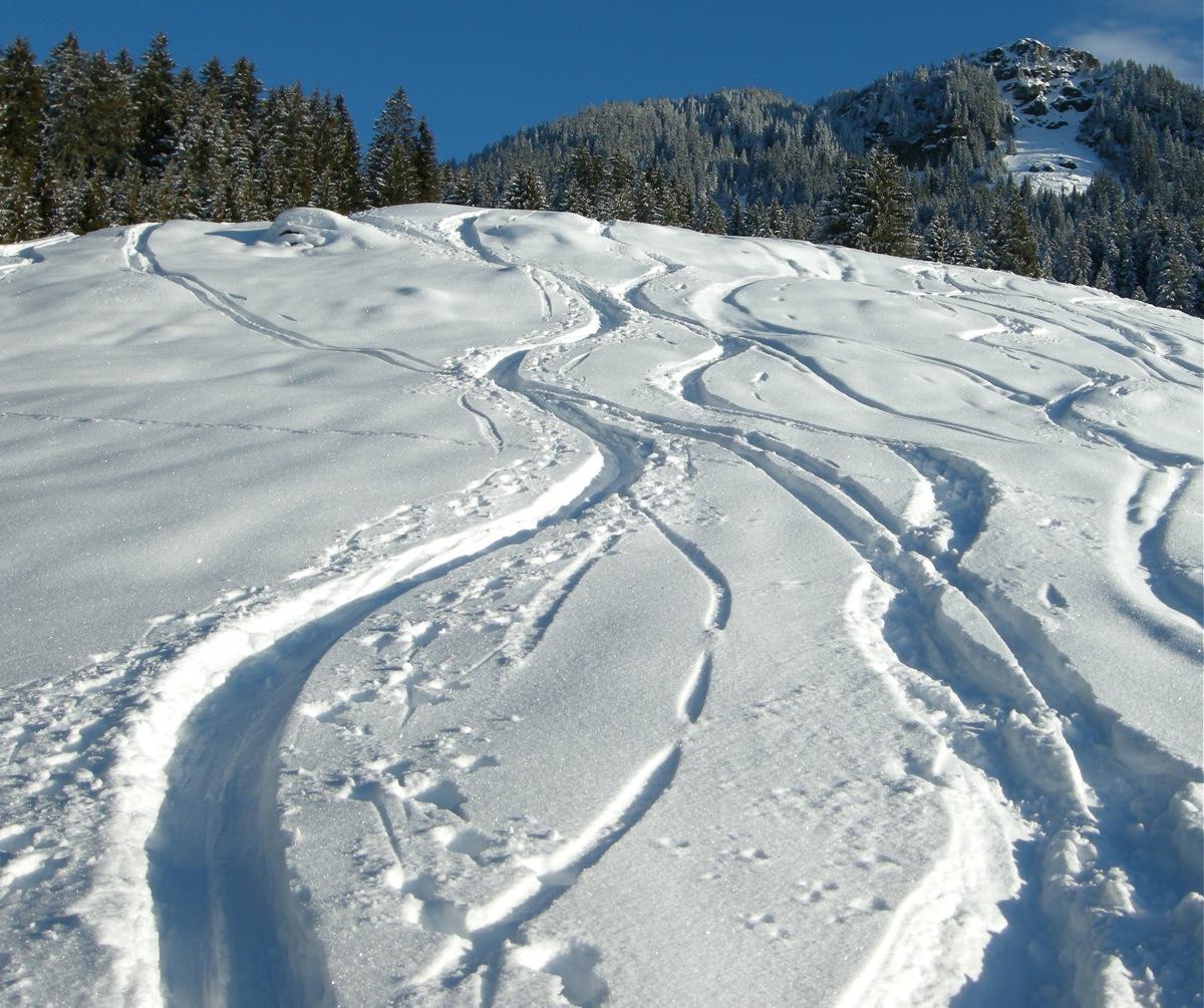 Bis zur Dickalm noch unverspurter Pulverschnee am südseitigen Waldrand.