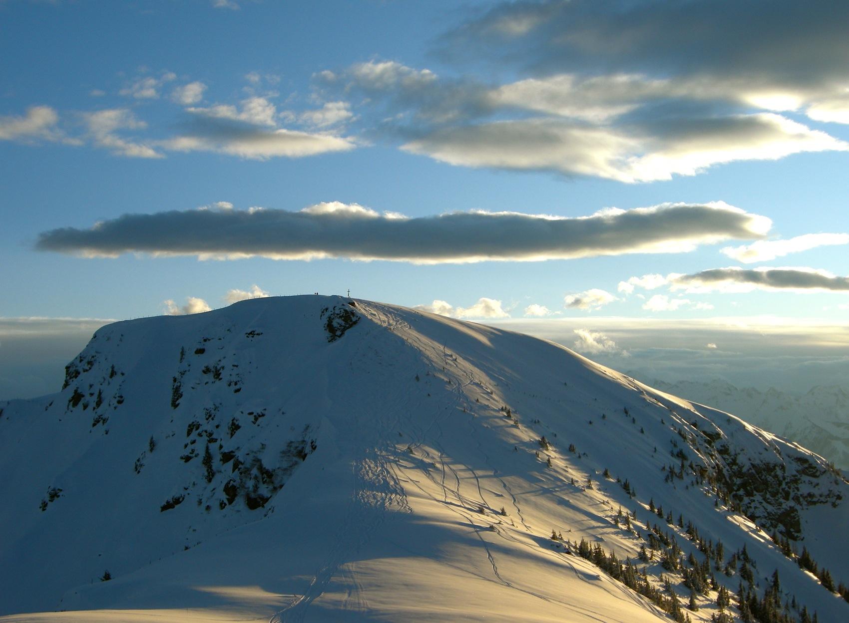Die Abfahrt vom Gipfel auf dem Sommerweg Richtung Westen ist möglich (Vermeidung des Gegenanstiegs!) solange die Lawinenlage sich nicht ändert.