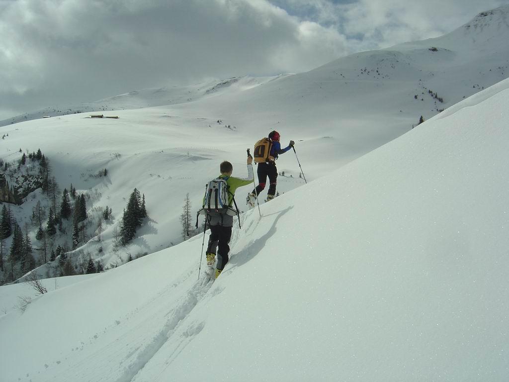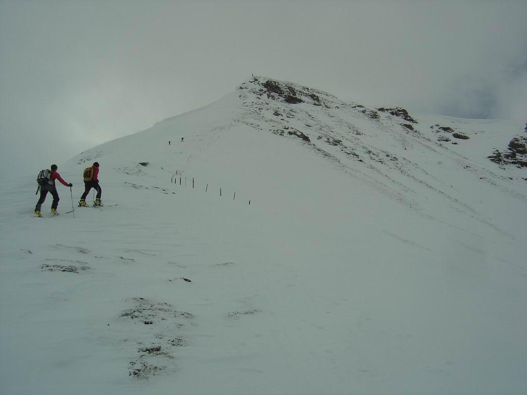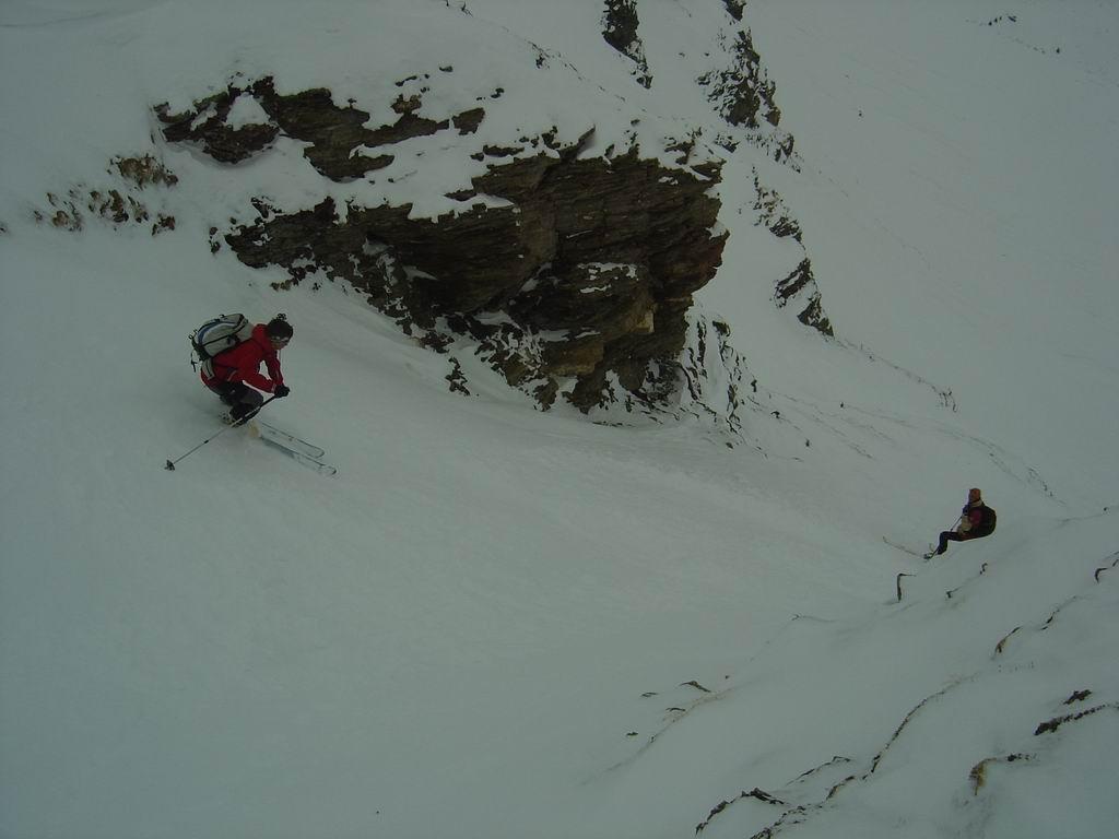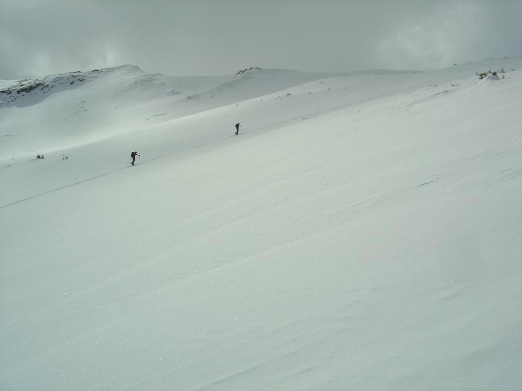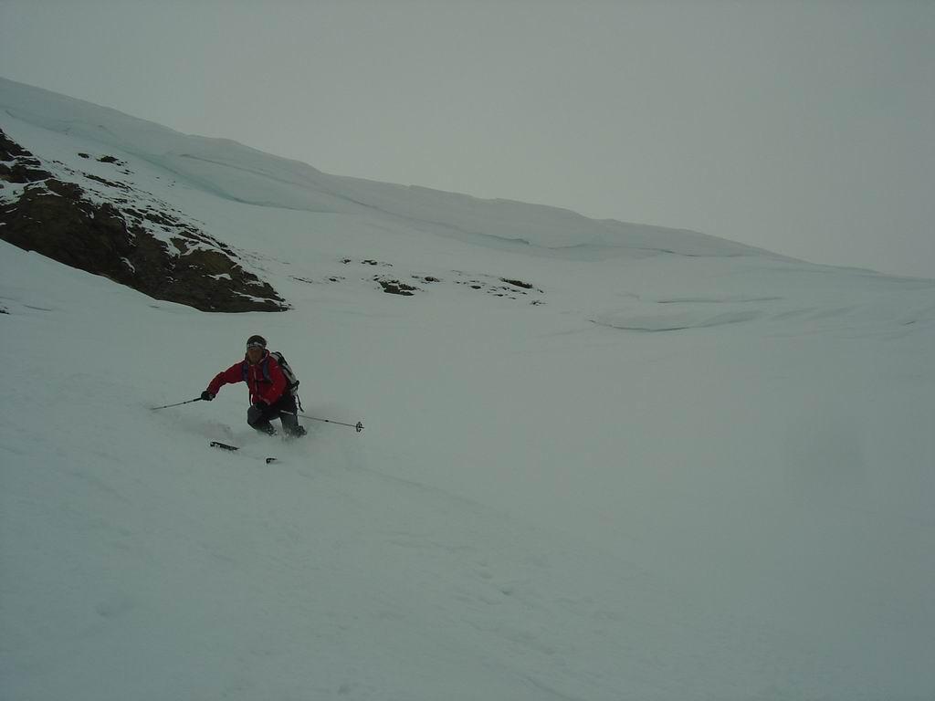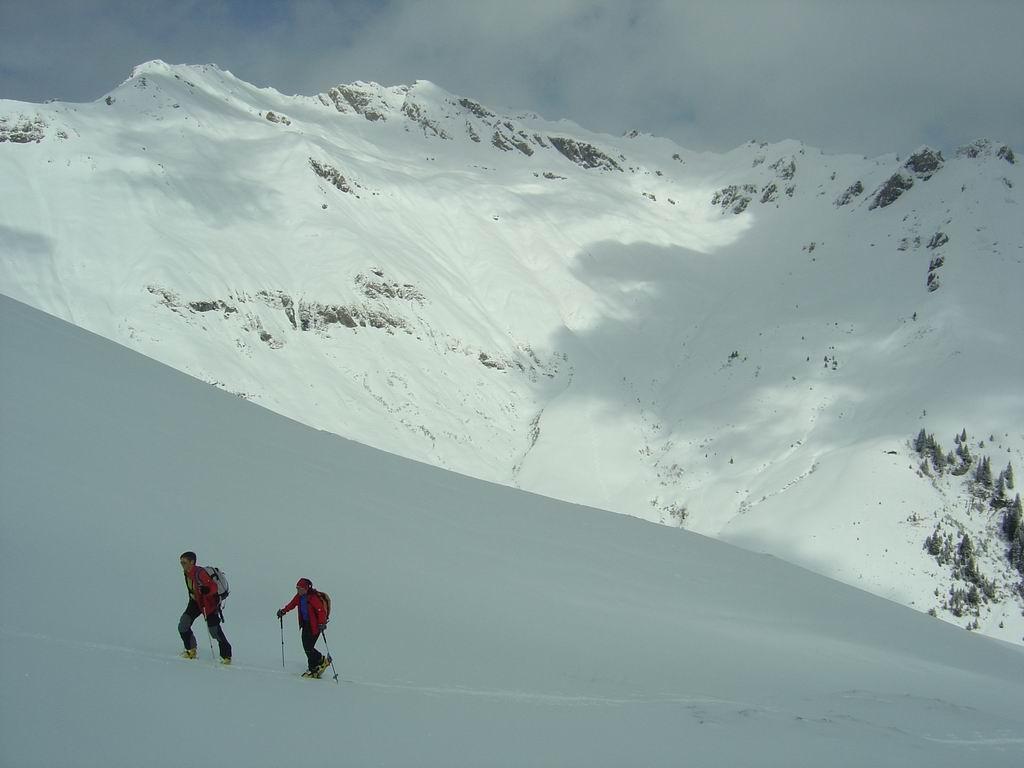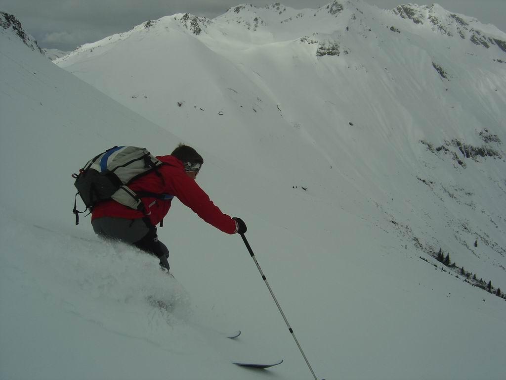 Aus dem Angertal führte uns unsere heutige Tour über die Gadauner Hochalm auf den Kalkbretterkopf. Den Gipfel bestiegen wir nicht vom Schwalbenkar aus, sondern gingen über den abgeblasenen Ostgrat - über einen kurzen Steilaufschwung die Ski tragend - zum höchsten Punkt. Für die Abfahrt bei ca. 15 cm Pulver auf oft nicht tragendem Untergrund und schlechter Sicht wählten wir die NO-Rinne.