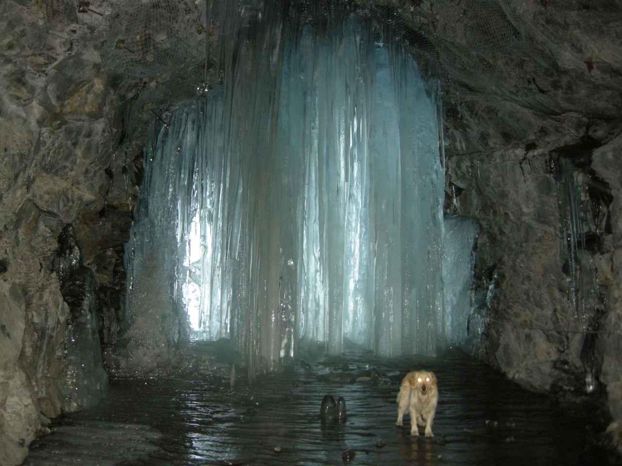 Der Weg aus dem Tunnel ist mit einem Eisvorhang verschlossen. Wie in einem Spiegelkabinett winden wir uns durch. Der arme Hund wird von mir, - wie ich zu meiner Schande gestehen muss, - an den Ohren über den Eiswulst gezogen, sonst wären wir da jetzt noch drin....