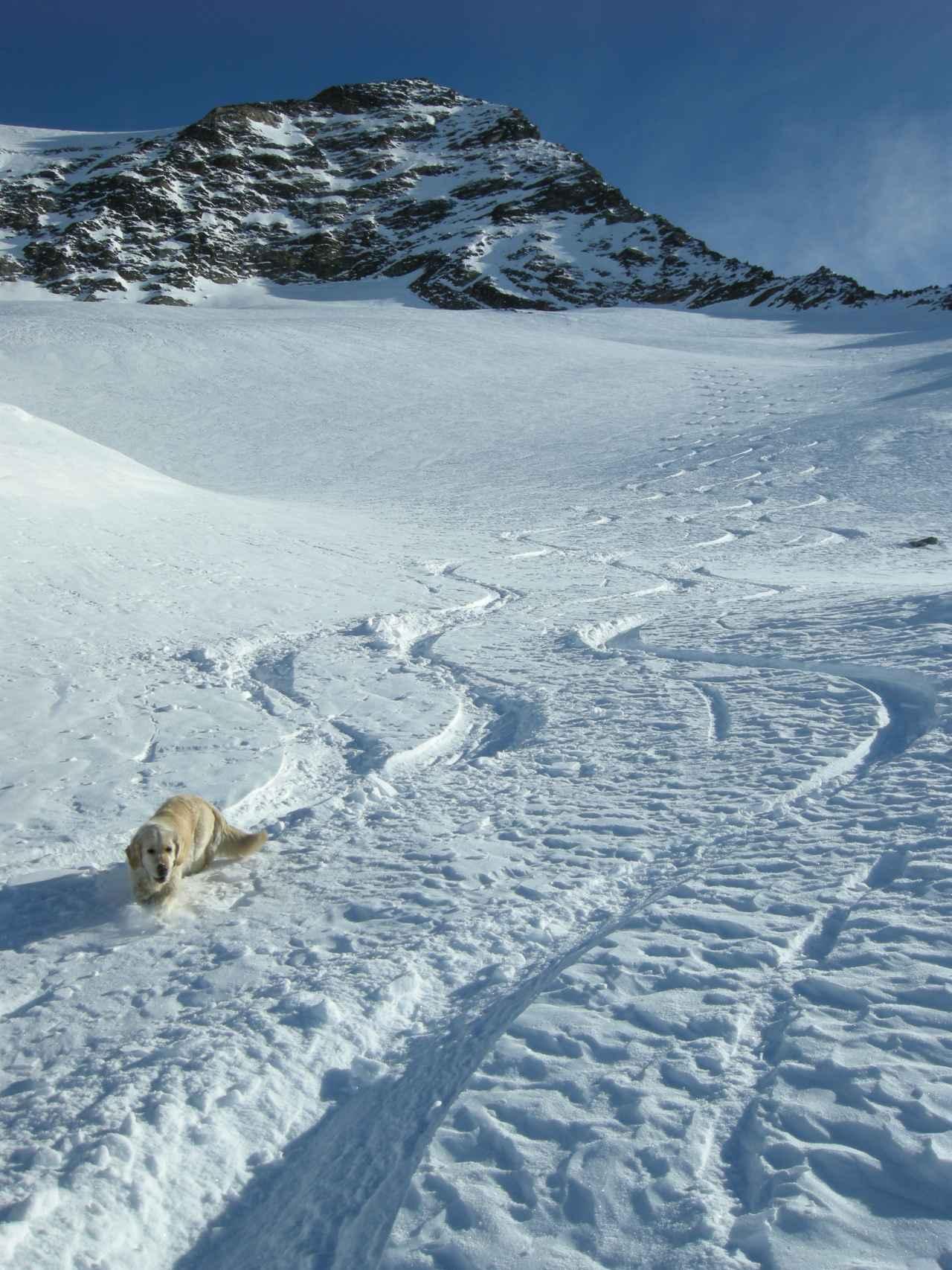 Wer Pulverschnee will, muss noch den Anstieg aufs untere Kees in Angriff nehmen, dort ist der Schnee schon etwas windbehandelt, aber es staubt noch!