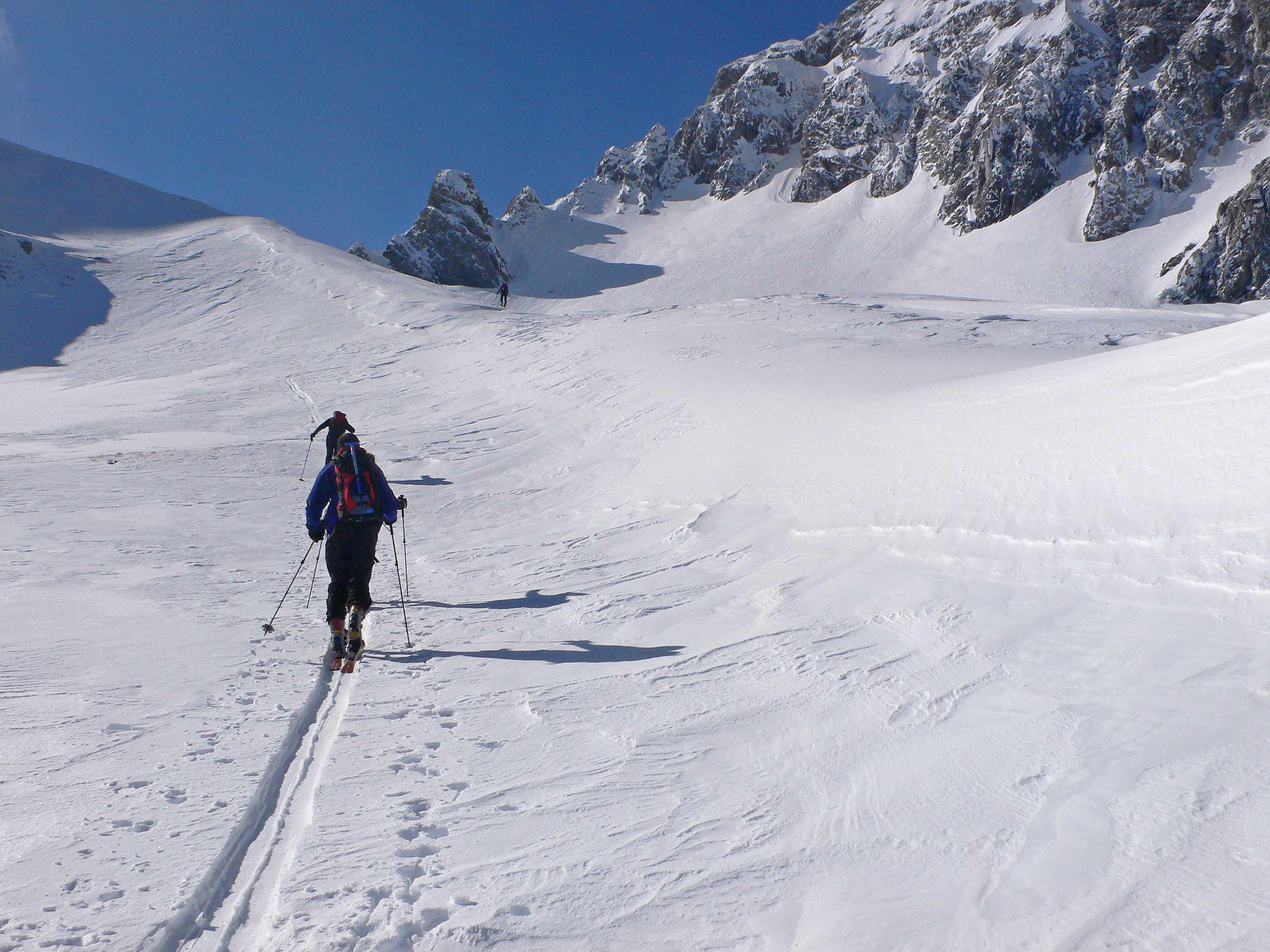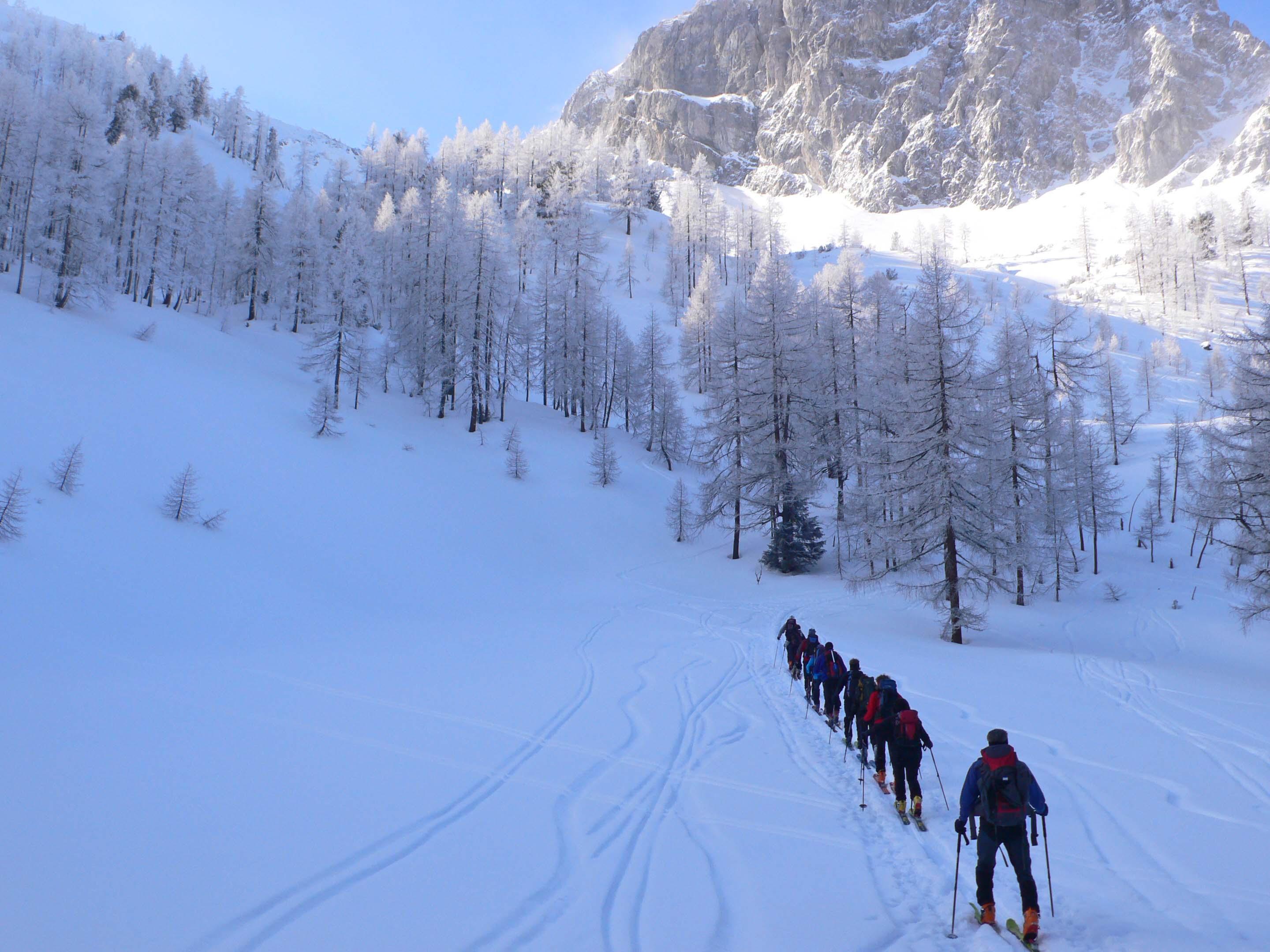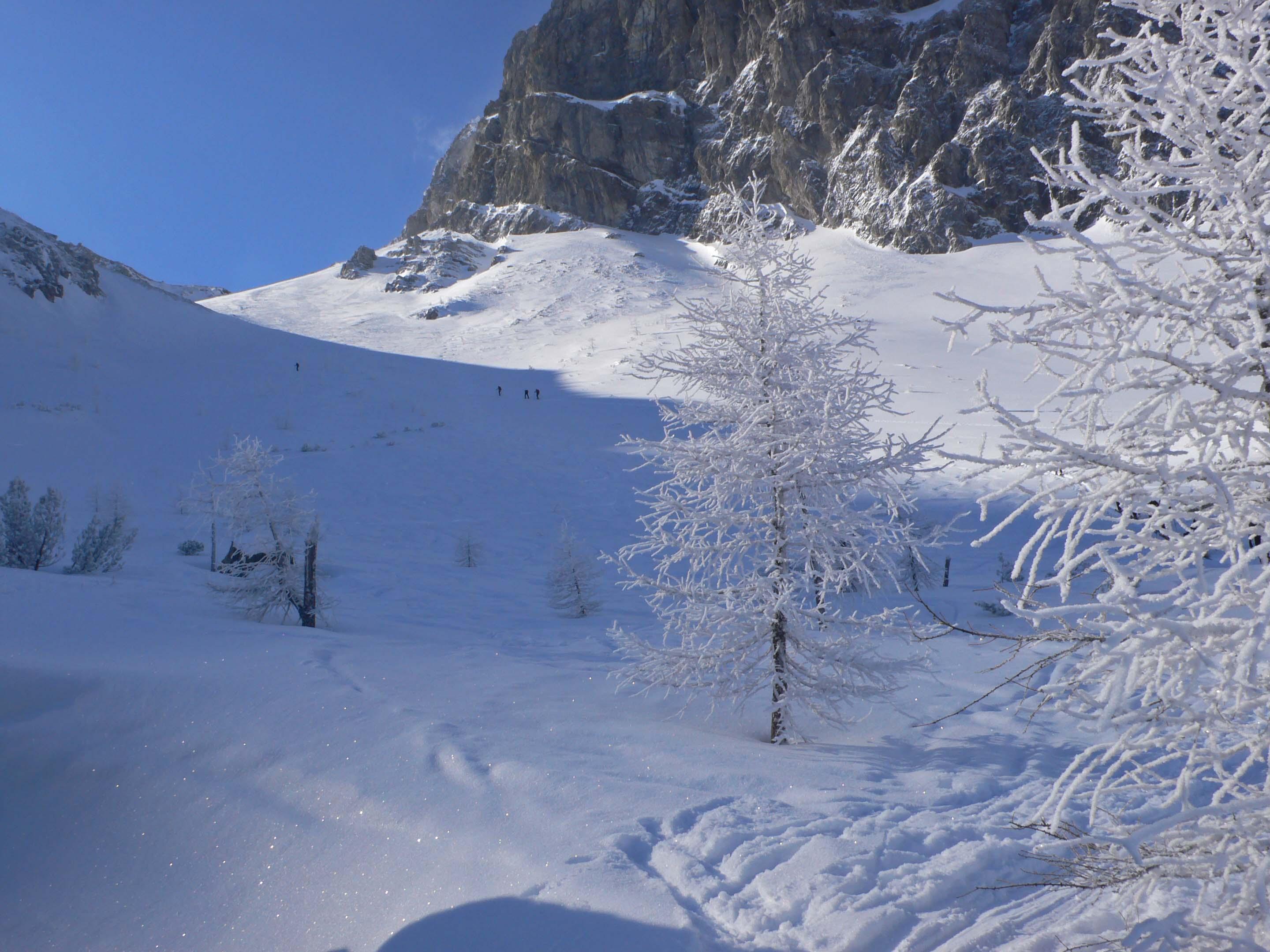 Der etwa 15 cm Neuschnee lag auf einen verharschten Untergrund. Dort wo der Wind seine Arbeit verrichtete, war es glatt bis eisig und windgepresst. Trotzdem war es lohnend, weil wir auch phasenweise in unberührten Pulverschnee abfuhren.