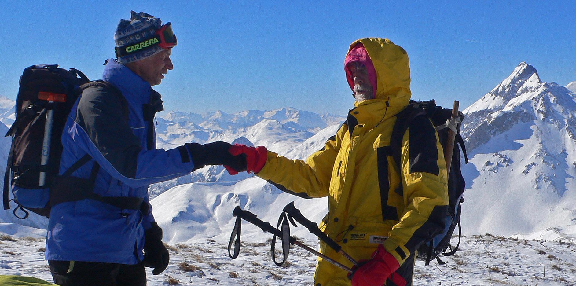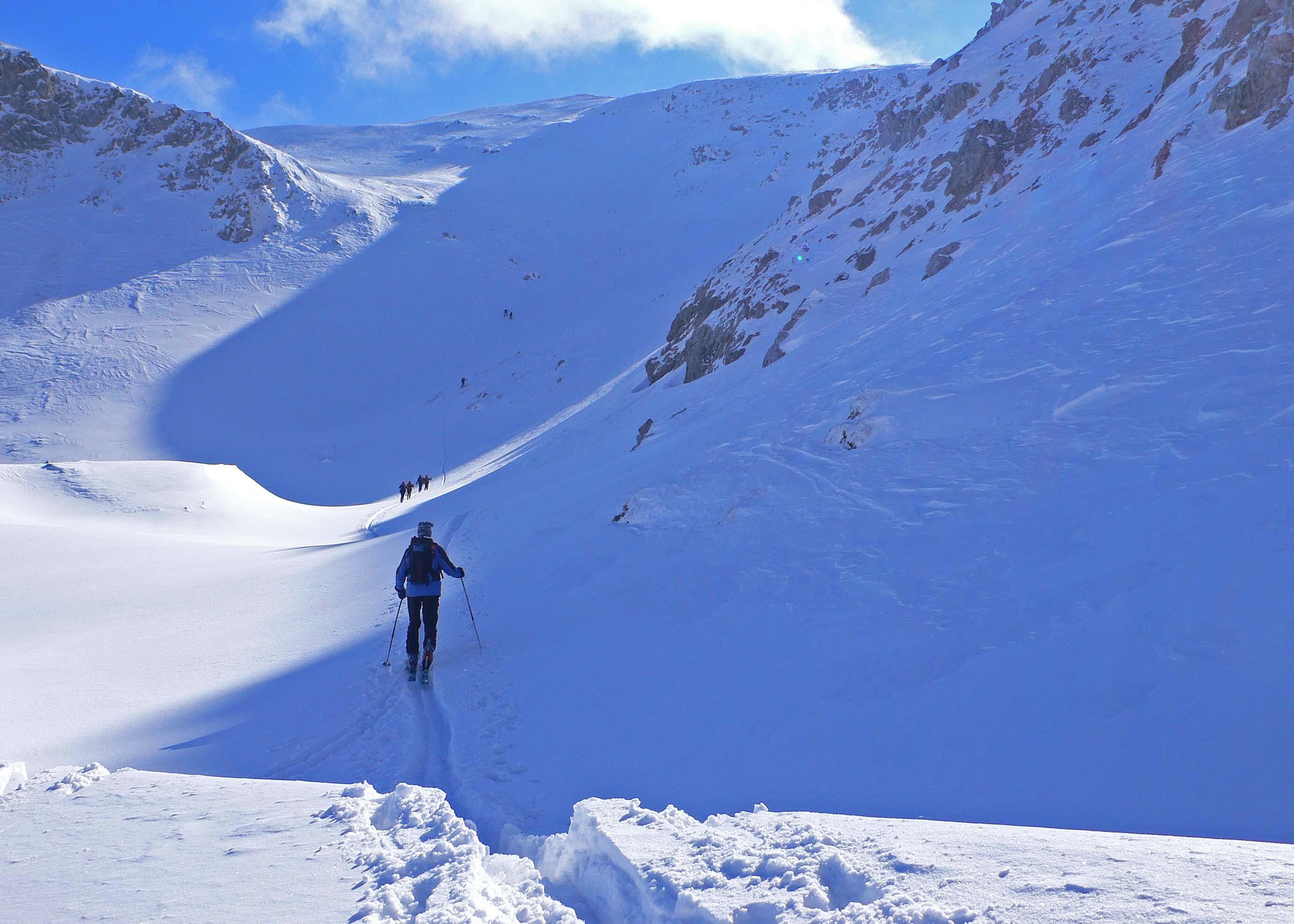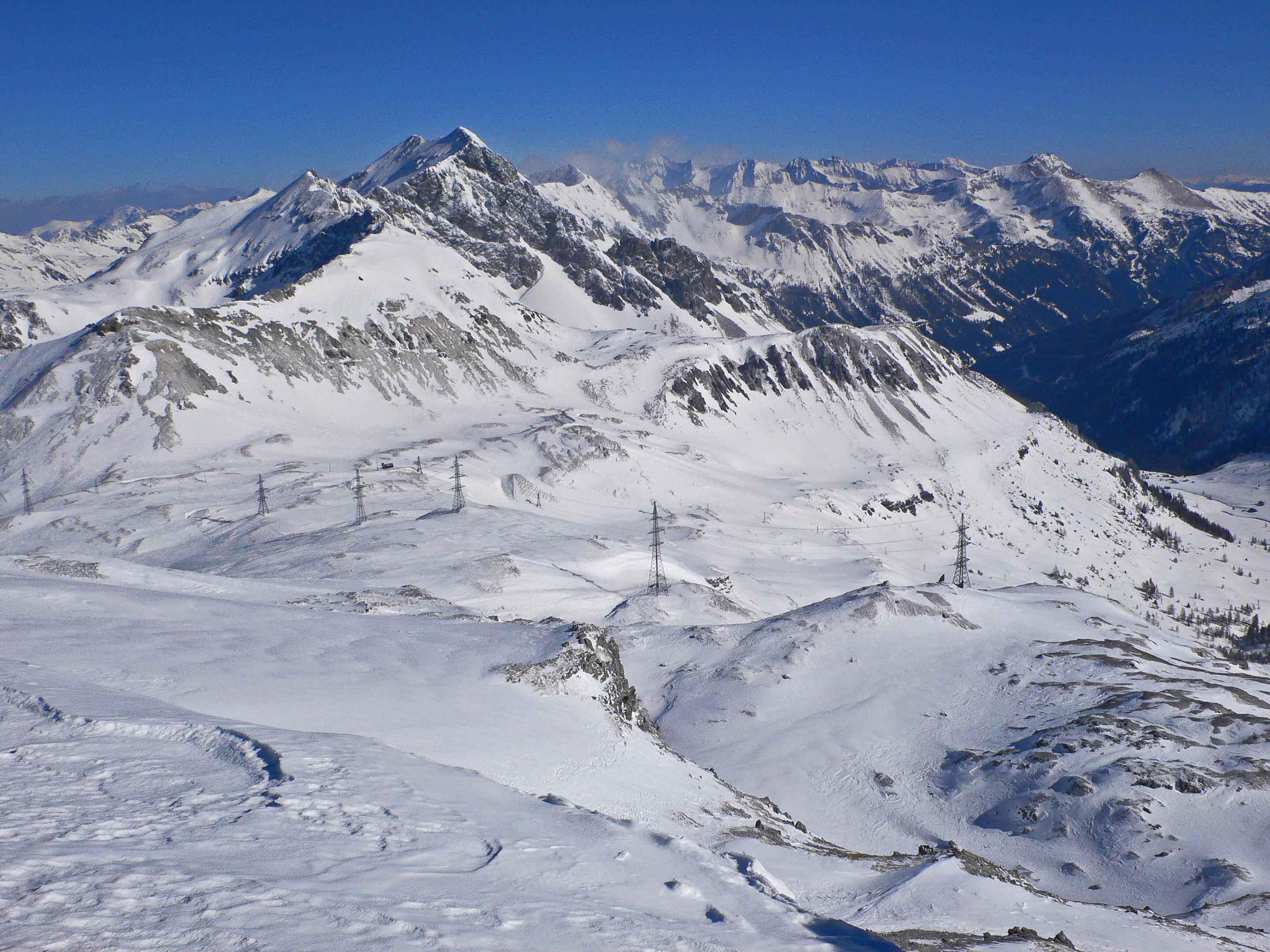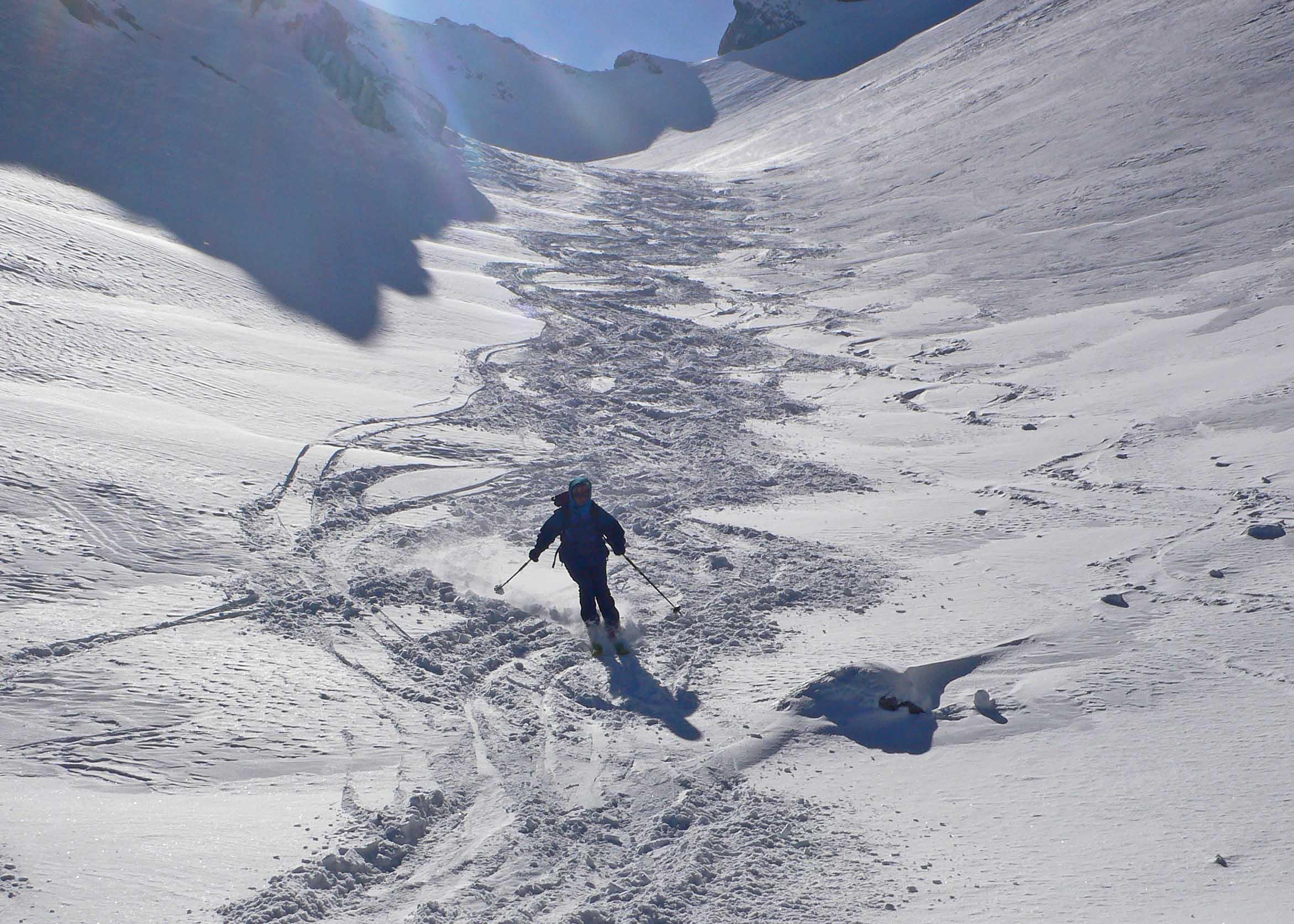 Der etwa 15 cm Neuschnee lag auf einen verharschten Untergrund. Dort wo der Wind seine Arbeit verrichtete, war es glatt bis eisig und windgepresst. Trotzdem war es lohnend, weil wir auch phasenweise in unberührten Pulverschnee abfuhren.