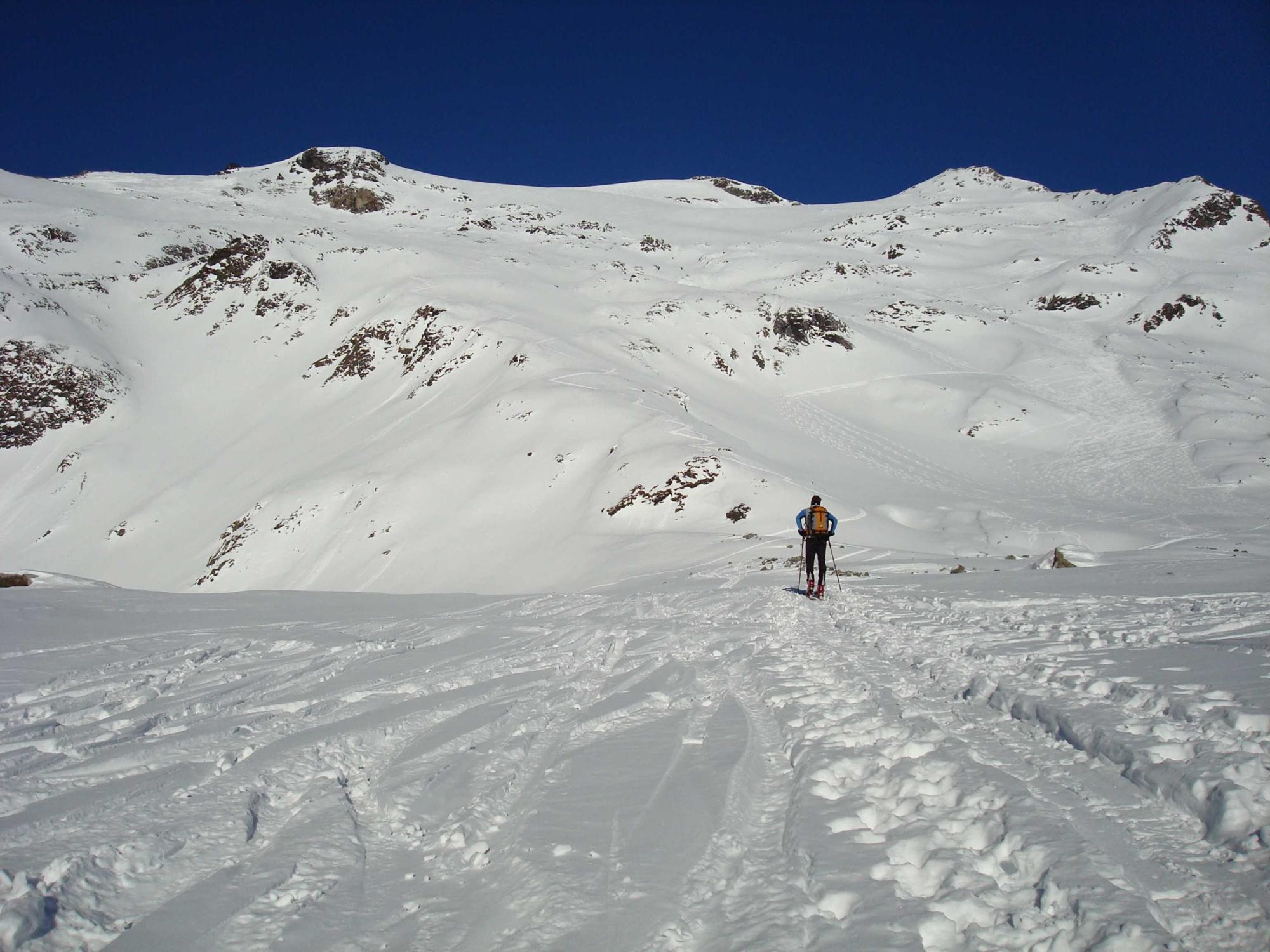 Früher Start beim Parkplatz Bodenhaus zum Hocharn. Beim Aufstieg lassen sich schon Entladungen aus steilen Hängen der vergangenen Tage sehen.