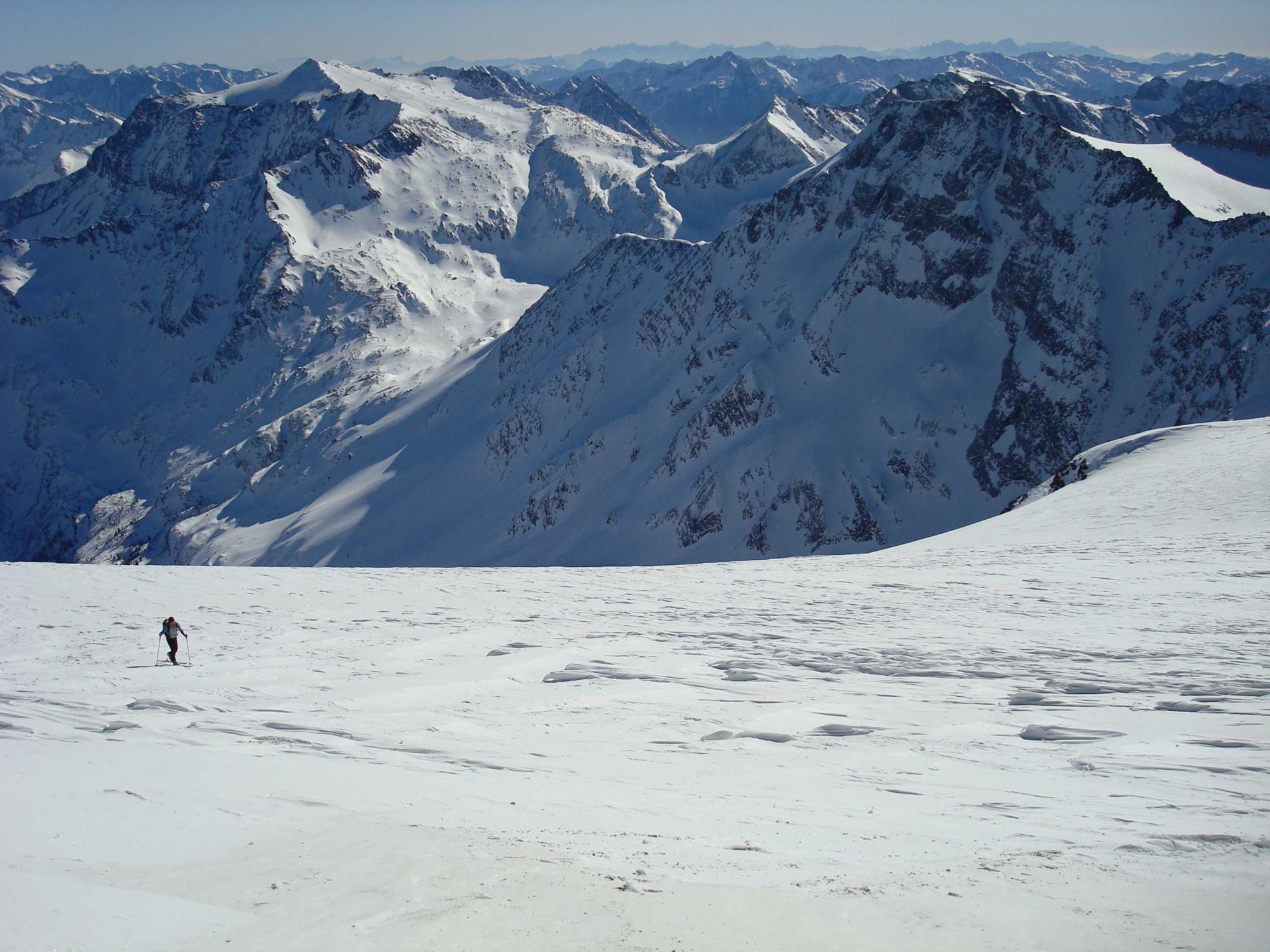 Aufstieg: Im Bereich des Hocharn-Kees starke Windverfrachtung ersichtlich. Mühevoll der letzte Anstieg zum Gipfel - teils Spurarbeit, teils blank gefegt.