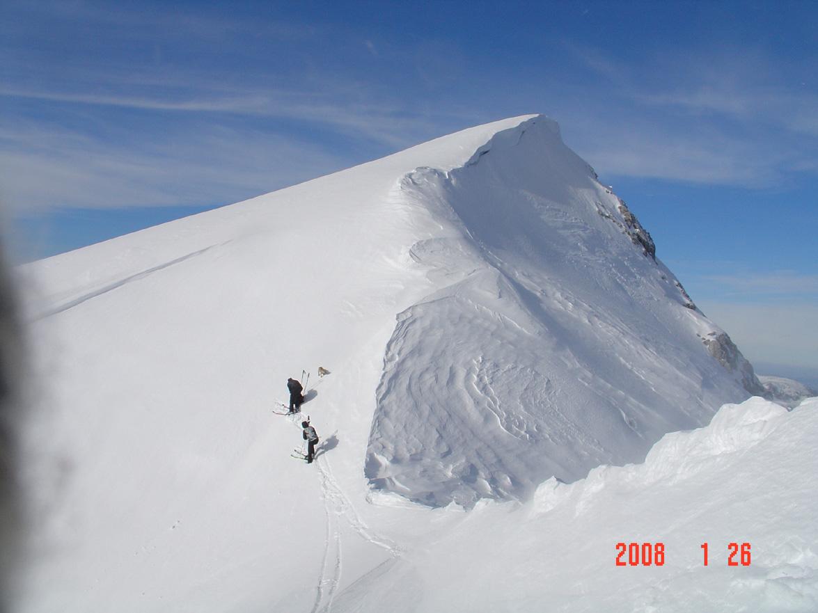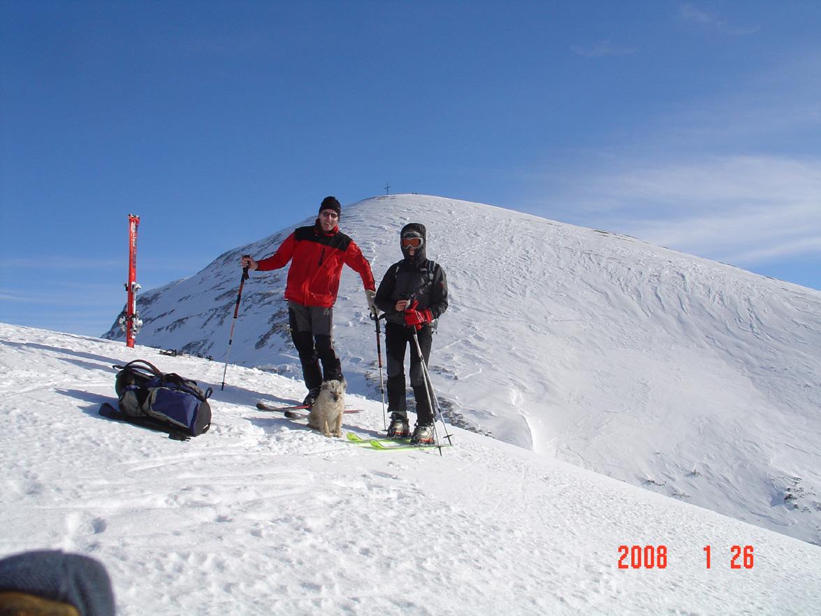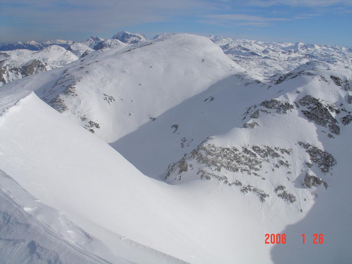 Abfahrt über etwas niedrigeren nördlichen Nebengipfel (wenige Meter Gegenanstieg) zur südseitig gelegenen Gipfelflanke. Bis auf ca 1500 hm herrlicher Firnhang. Anschließend Abfahrt entlang Aufstiegspur weiter bis zur Forststraße Dazwischen im Schatten immer wieder Pulverhänge.
