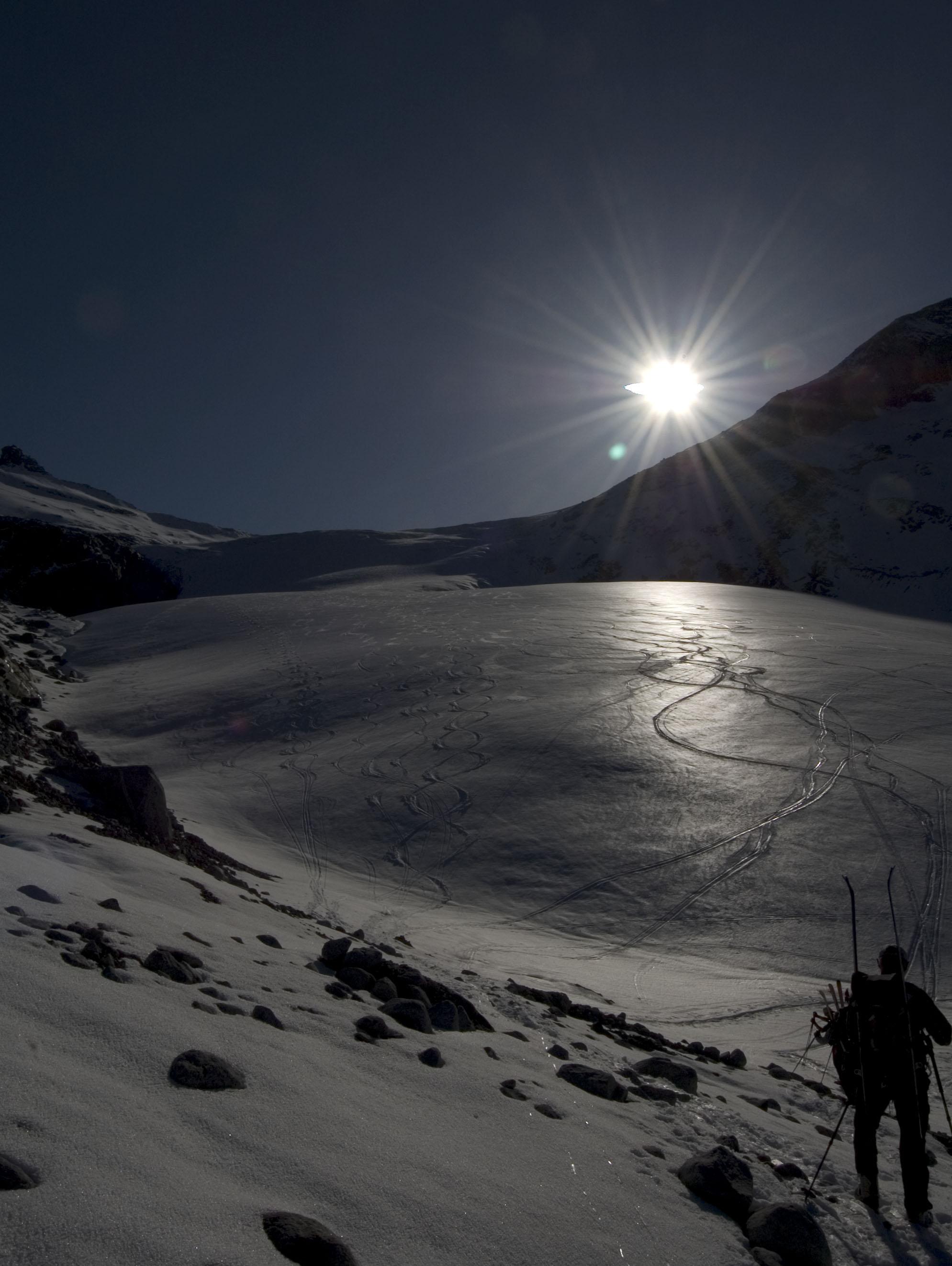 Sa. 19.Mai Großvenediger über Venedigerscharte In der Früh starker Wind und bewölkt. Gegen Mittag nachlassen des Windes und aufgelockerte Bewölkung. Gute Fernsicht. Abfahrt über das Obersulzbachkees und Gegenaufstieg zur Hütte. Gute Verhältnisse am Gletscher.So. 20.Mai. Abstieg auf das Obersulzbachkees und Abfahrt bis ins Gletscherbecken (2400m). Von dort Aufstieg durch den Gletscherbruch Richtung SW (südl. von Pkt. 2564m vorbei) bis zum Fuß des Kanonenrohrs (Steilrinne auf das Sonntagskees, Exposition E!). Aufgrund der starken Durchfeuchtung der Schneedecke Abfahrt von der Scharte über das Sonntagskees und den Graben des Schlieferbaches bis ins Tal. Abfahrt bis ca.2100m möglich.